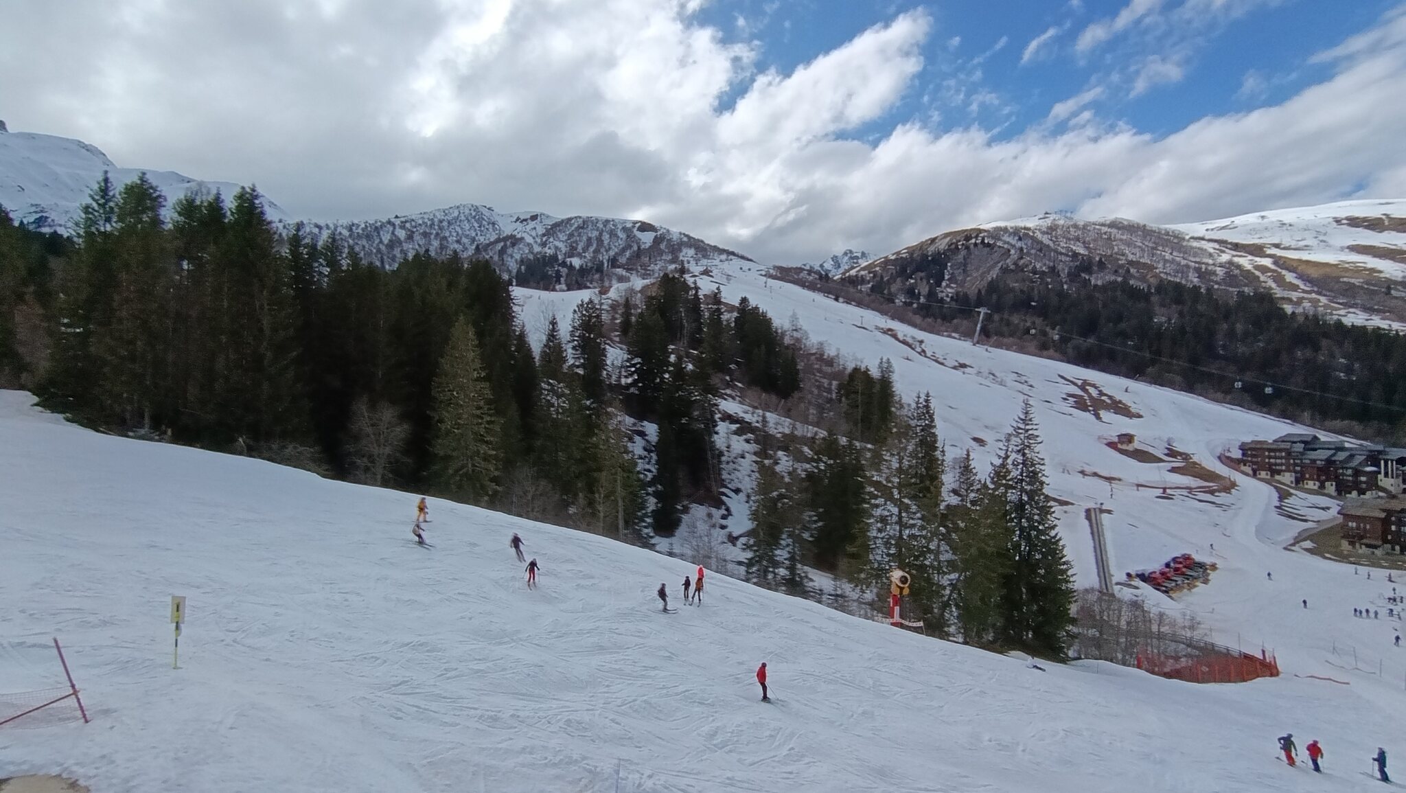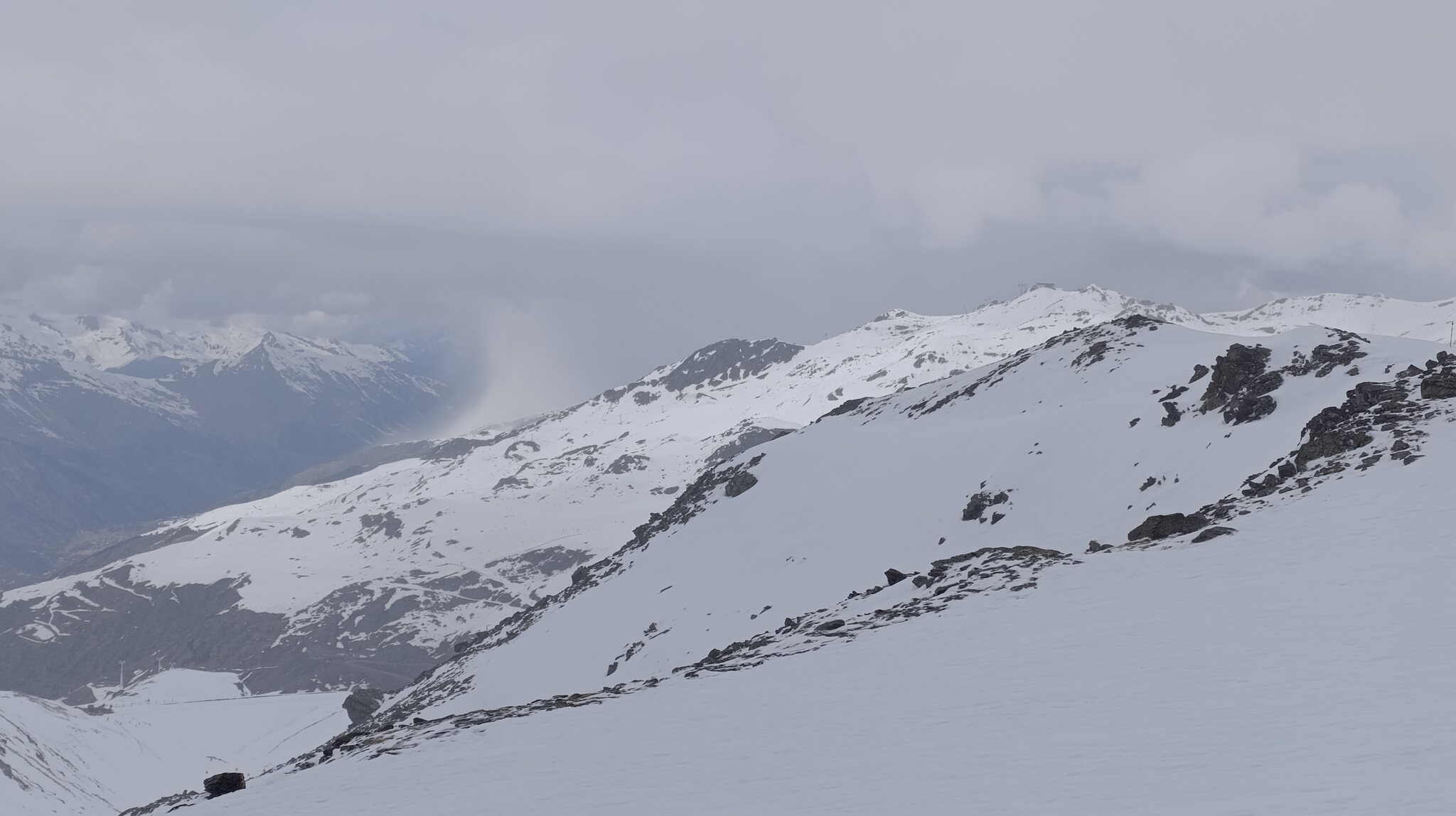 Am späten Nachmittag zog es etwas zu und stellenweise gab es ein wenig Schnee. Über Les Menuires scheint eine Wolke ihren Schneeinhalt nicht mehr halten zu können.