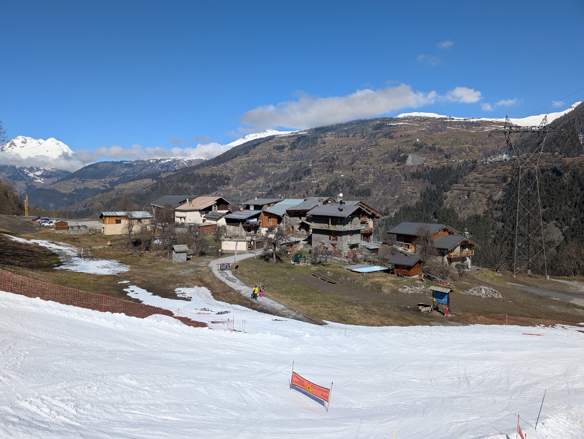 Beim Blick rüber nach la Rosiere sieht man sehr gut was eine ideale Skistationshöhe ist. Bis zu den Häusern runter die Hänge noch komplett weiss und dann innerhalt von weniger als 50 Höhenmetern kaum ein weisser Fleck mehr.