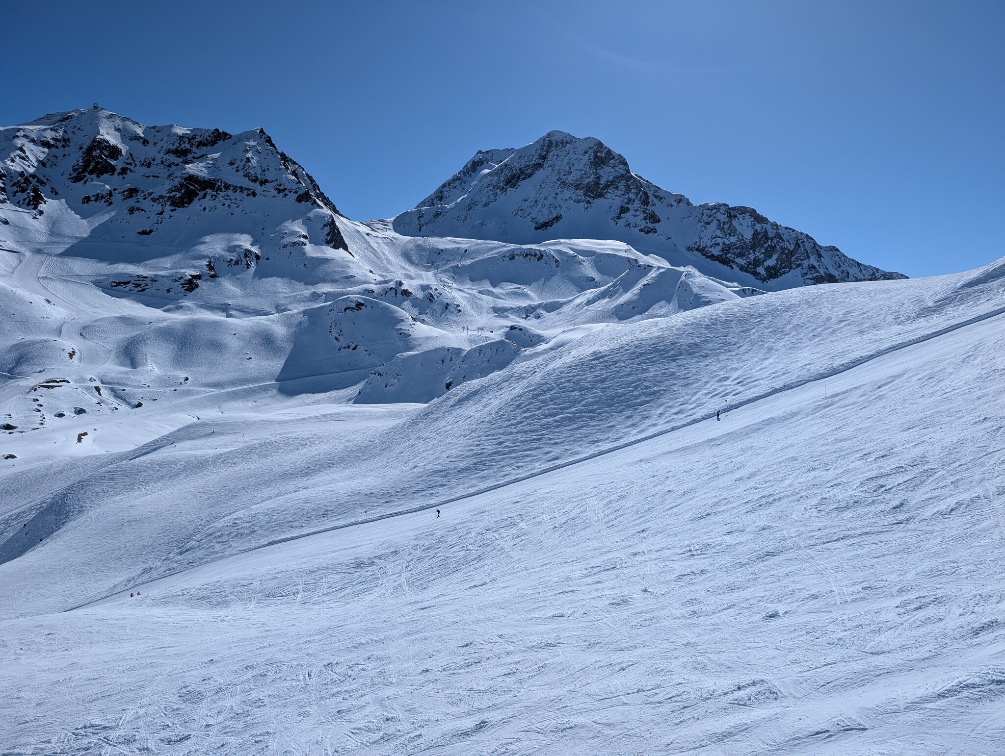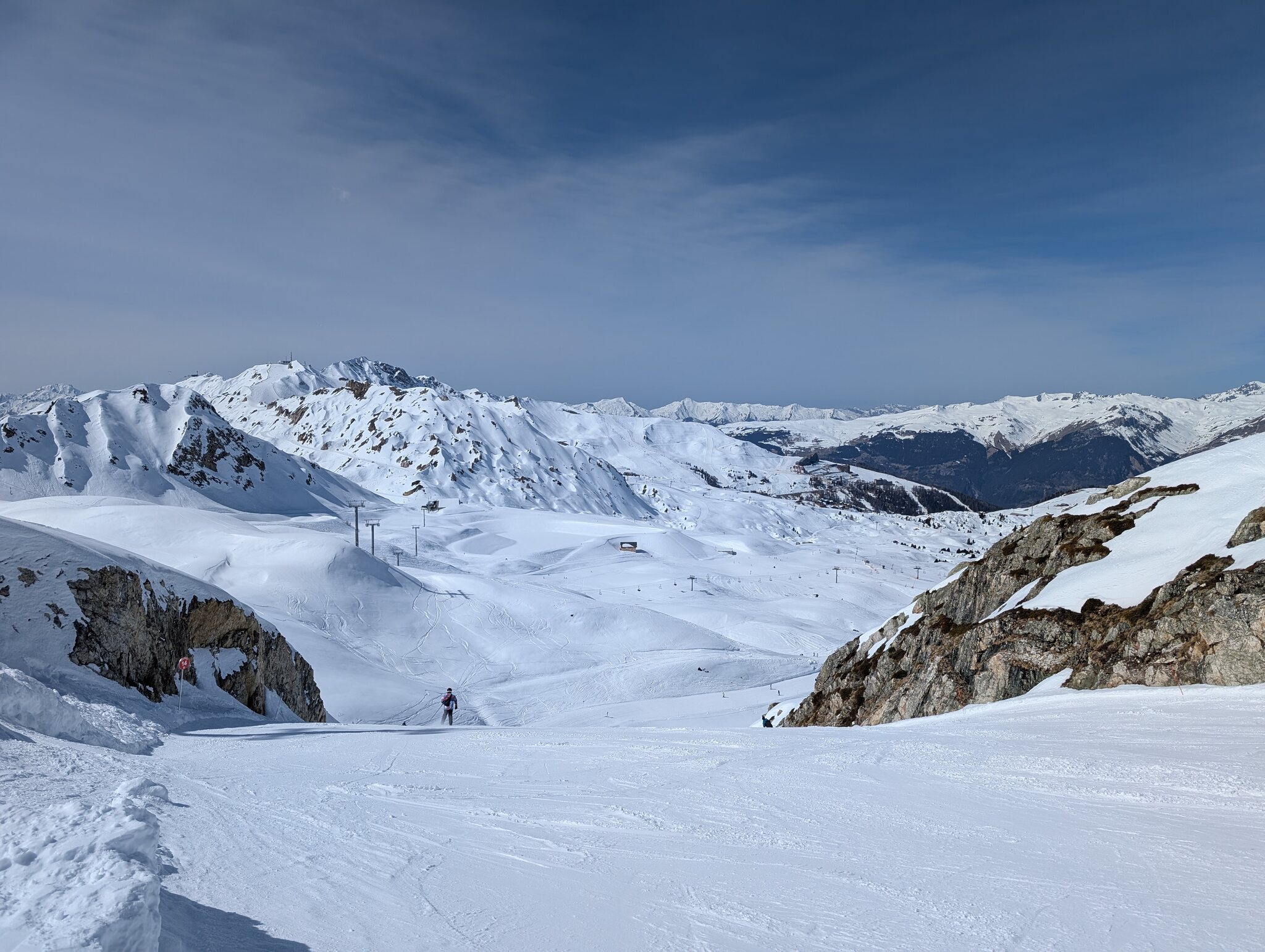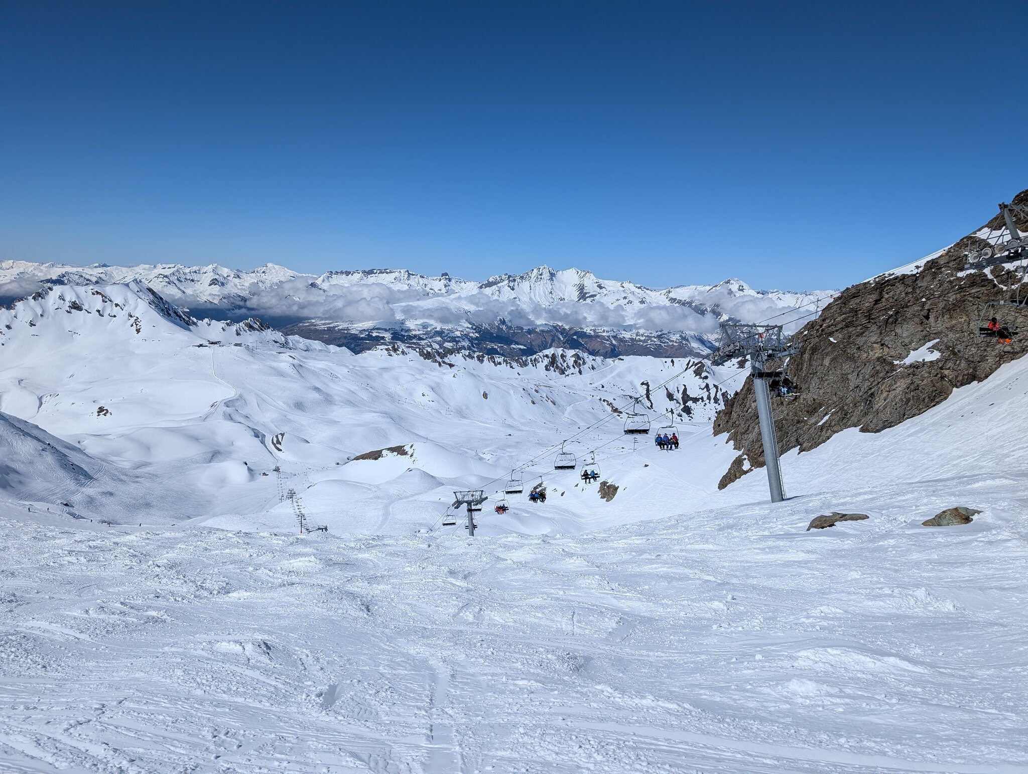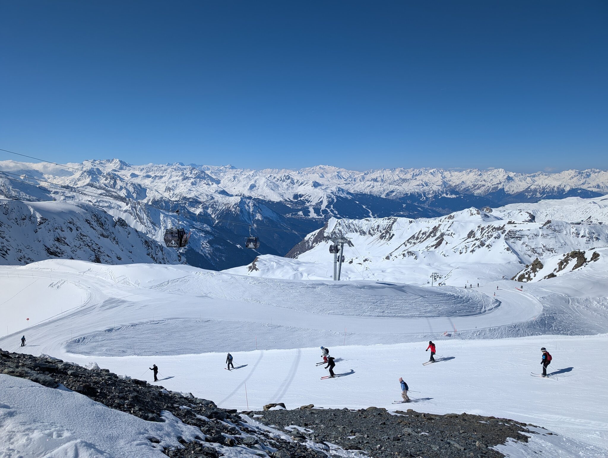 Trotzdem eine schöne Abwechslung, immer Verbier wird auch langweilig. Aber wenn ich schon soweit fahre dann das nächste Mal wieder Menuieres. Das ist dann schon eine andere Hausnummer, gefühlt jeder Lisft 1000hm. Hier liegt der Schnitt wohl eher bei 500hm, insbesondere in La Plagne. Was mich sehr enttäuscht hat ist der Gletscher Bellcote. War da zuletzt vor 24 Jahren, an Ostern, Pulverschnee, tolle steile Abfahrt. Dieses Jahr wenig Schnee, und selbst in der Höhe sehr sulzig und teils Steine. Wer da den Klimawandel leugnet dem ist nicht mehr zu helfen.