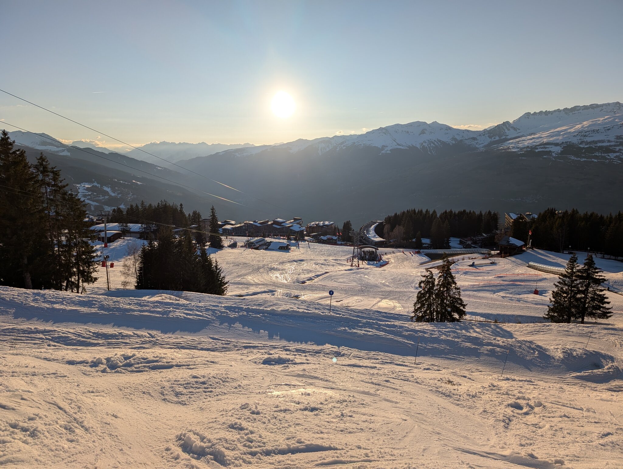 Wir sind heute auf der Seite Les Arcs geblieben. Recht übersichtlich, wenn man sich mal etwas orientiert hat. Höhepunkt war heute die 2000 Hm umfassende Abfahrt vom Aiguille Rouge bis nach Villaroger. Oben sogar etwas Sonne und durchgehend gute Sicht. Gefühlt hat man mehrere Jahreszeiten durchfahren.