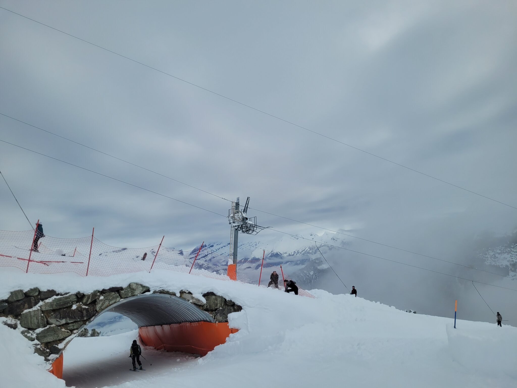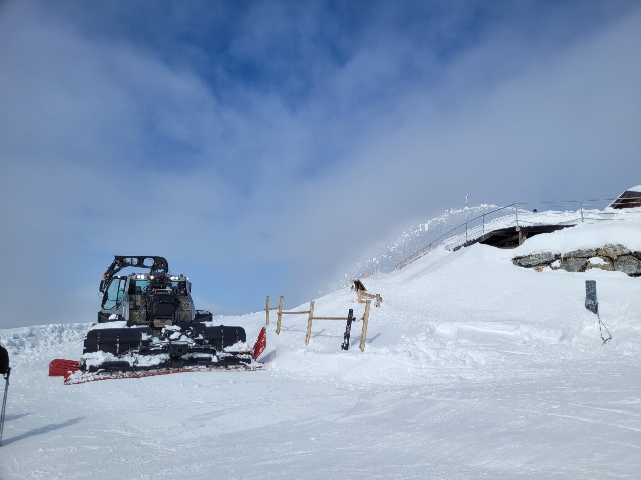 Lustige Beobachtung am Rande: Der Cret du Midi Schlepper ist heute im &quot;Fatshaming-Modus&quot;.<br />Alle Fahrer mit geschätzt mehr als 90kg koppeln im kuppelbaren Schlepplift noch in der Steigung aus, wahrscheinlich aufgrund des vielen Schnees im Ausstieg, der vorhin auch versucht wurde, wegzuschieben.<br />Dann gibt es immer 2 Sekunden ein lautes schleifendes Geräusch bevor sie im Katapultstart in den Ausstieg geschossen werden.