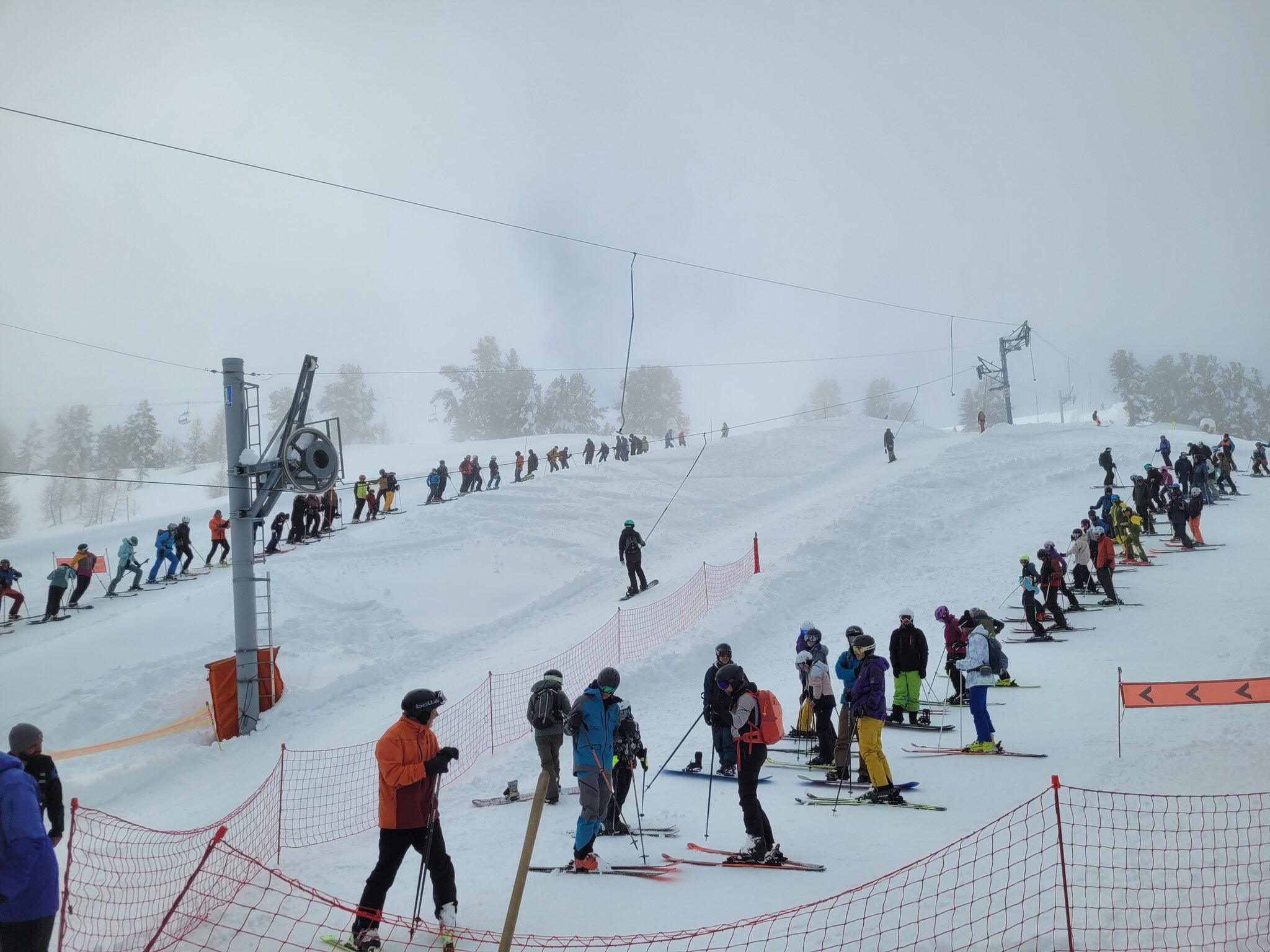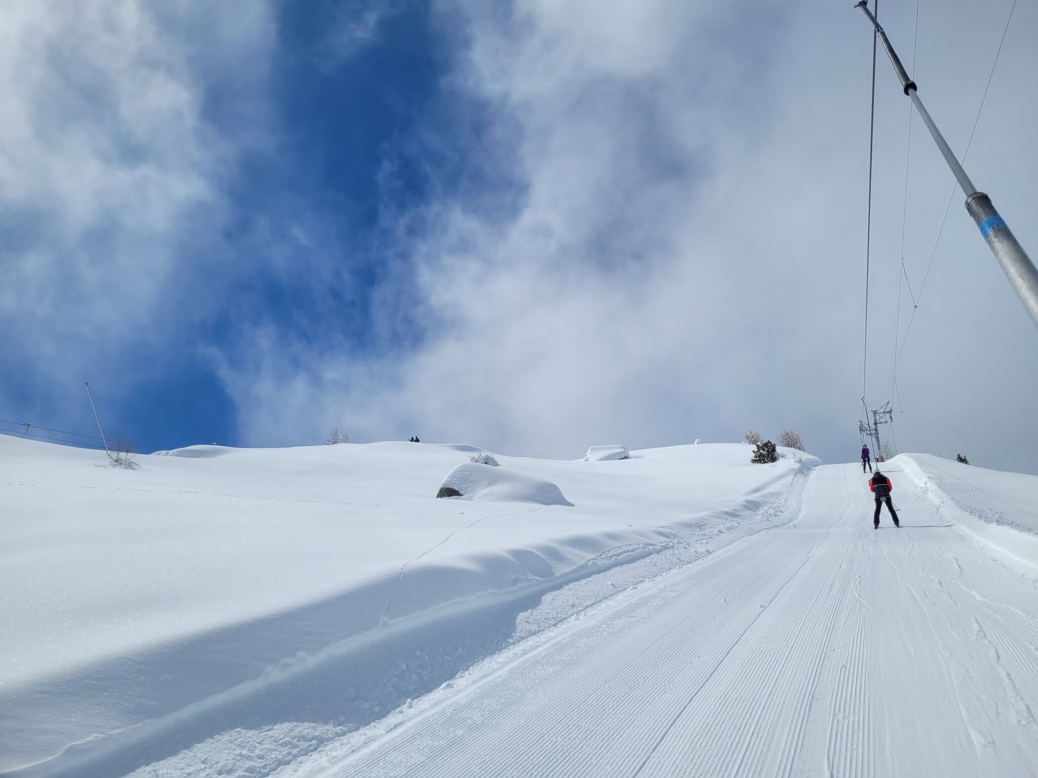 Alle Fahrer mit geschätzt mehr als 90kg koppeln im kuppelbaren Schlepplift noch in der Steigung aus, wahrscheinlich aufgrund des vielen Schnees im Ausstieg, der vorhin auch versucht wurde, wegzuschieben.