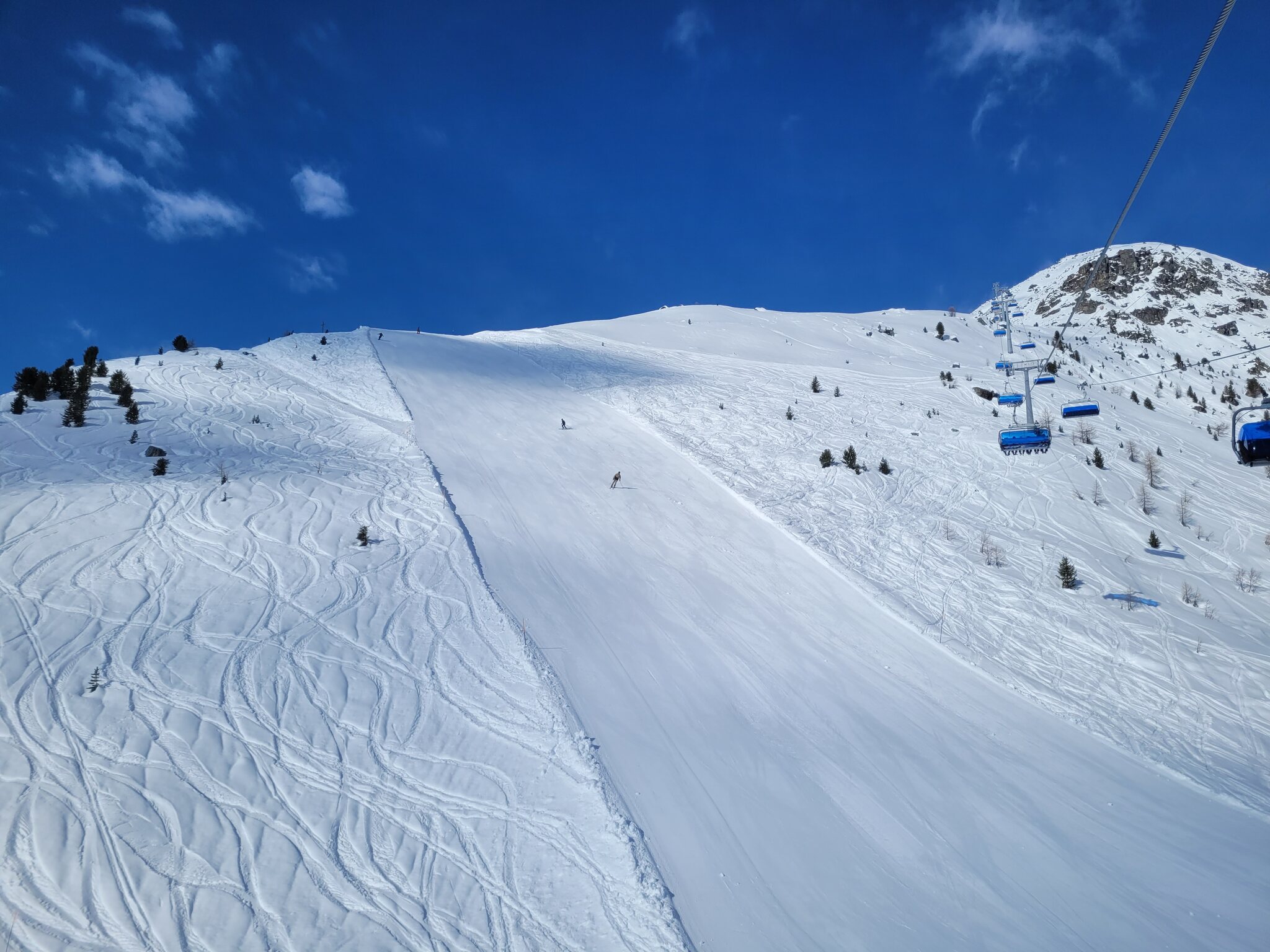 Im Tracuisessel, hier war ich dann leider doch zu spät dran, Piste schon sehr zerpflügt. Egal, nach 2 Wiederholungsfahrten mache ich mich an die finale Talabfahrt um den Tag zu beenden