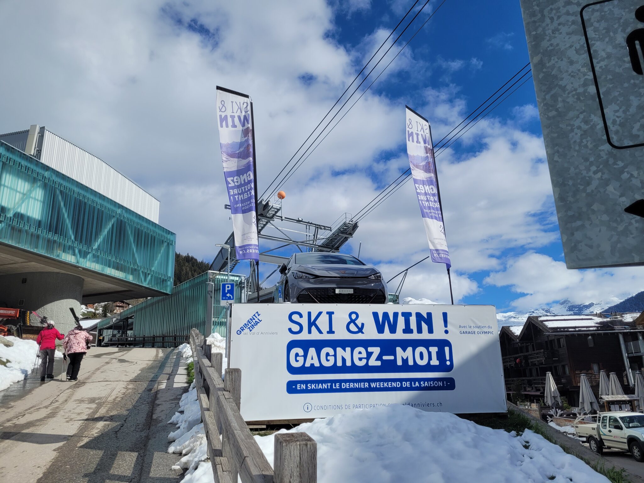 Am Parking ist recht viel los, ausserdem nimmt heute jeder Skifahrer an einer Verlosung teil, es gibt ein Auto zu gewinnen.