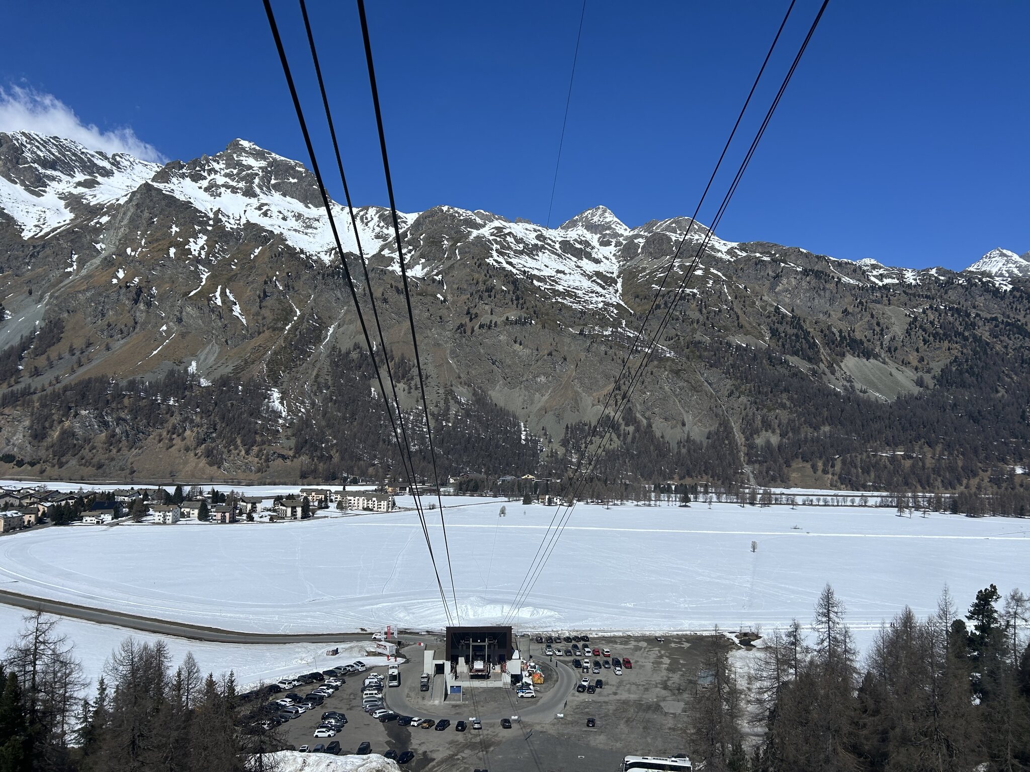 Auch nett, aber die nach Sils taugte mir wesentlich besser. Enttäuscht waren wir an der Talstation, wo die PB uns vor der Nase wegfuhr und uns so eine Zwangspause von 20min (!) verordnete. Die PBs fuhren nur alle 15min (Sils) bzw. 20min (Corvatsch beide Sektionen). Bei den sportlichen Ticketpreisen könnte man mind. einen 15min Takt erwarten am Corvatsch finde ich.
