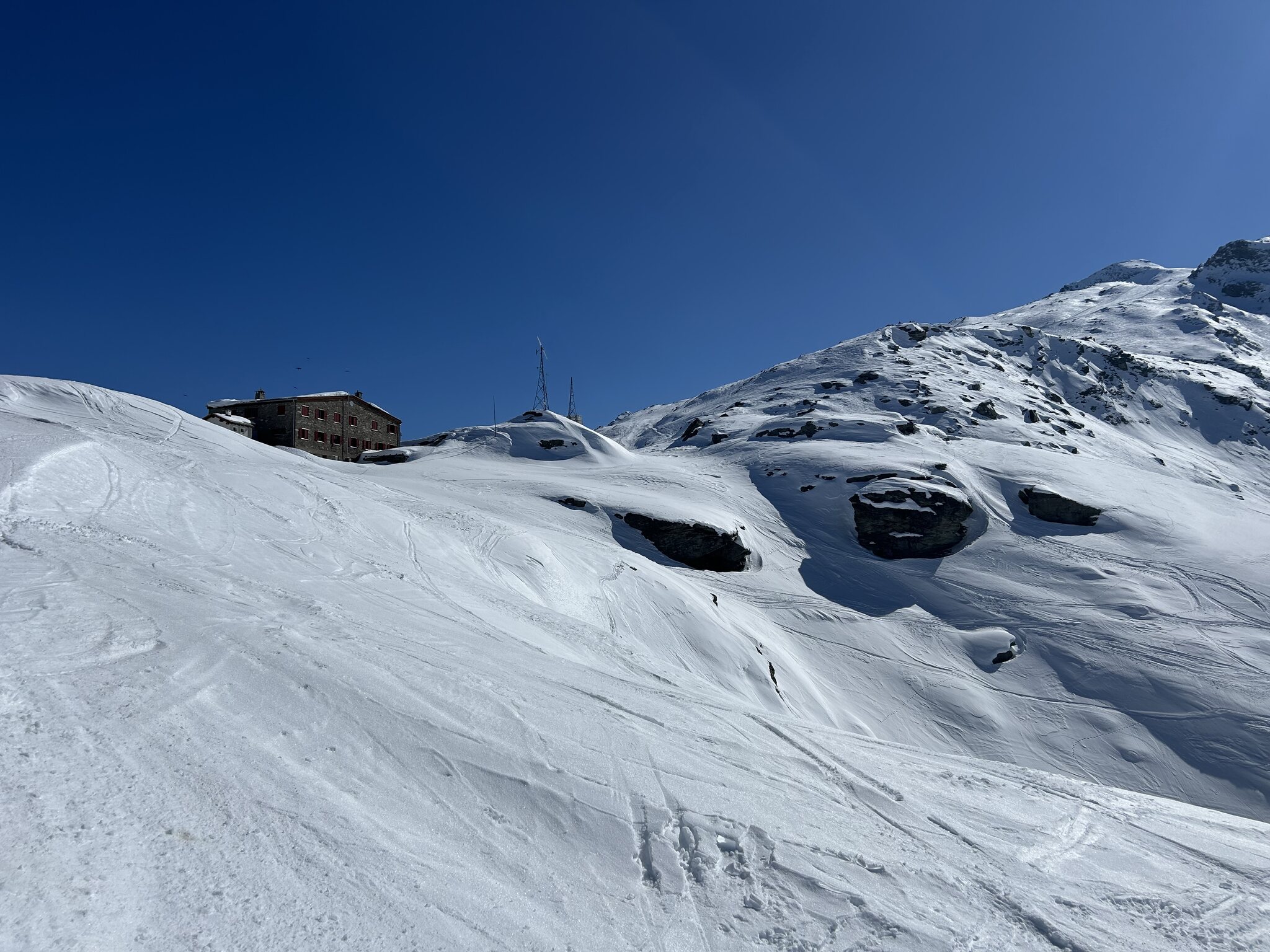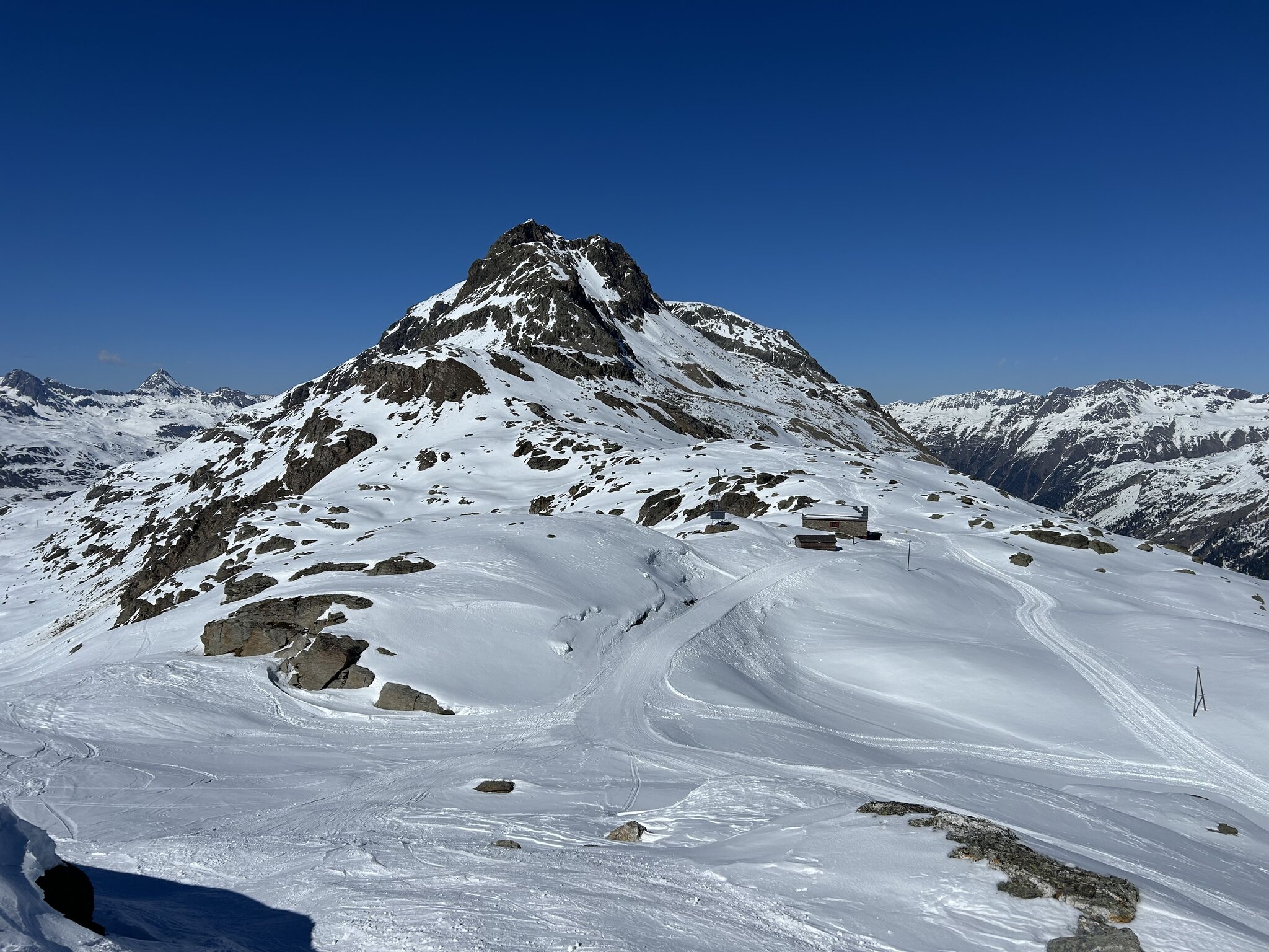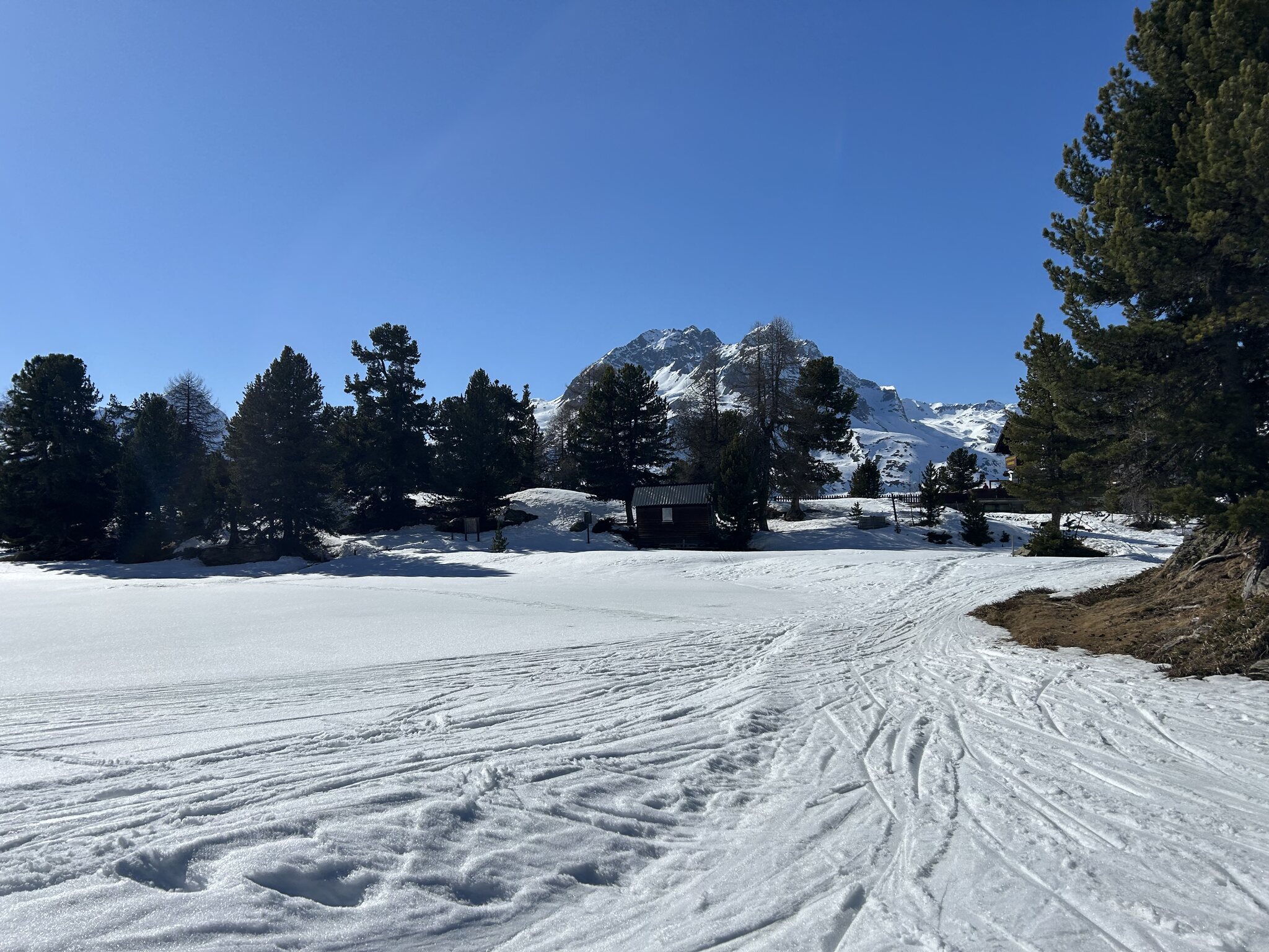 Die Piste über die Fuorcla Surlej war geschlossen, aber eine Raupenbreite war präpariert. Zu unserer Überraschung war die Hütte offen. Doch die harte und ausgefahrene „Piste“ lohnte sich nur für den Ausblick, nicht des Skifahrens wegen.