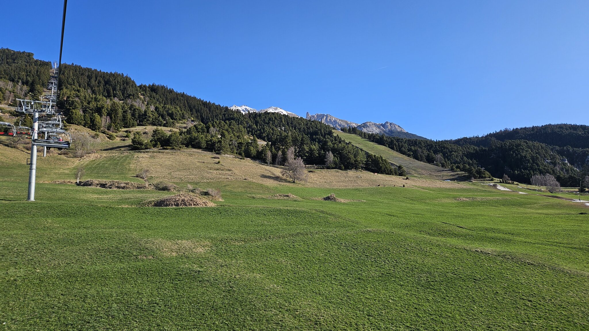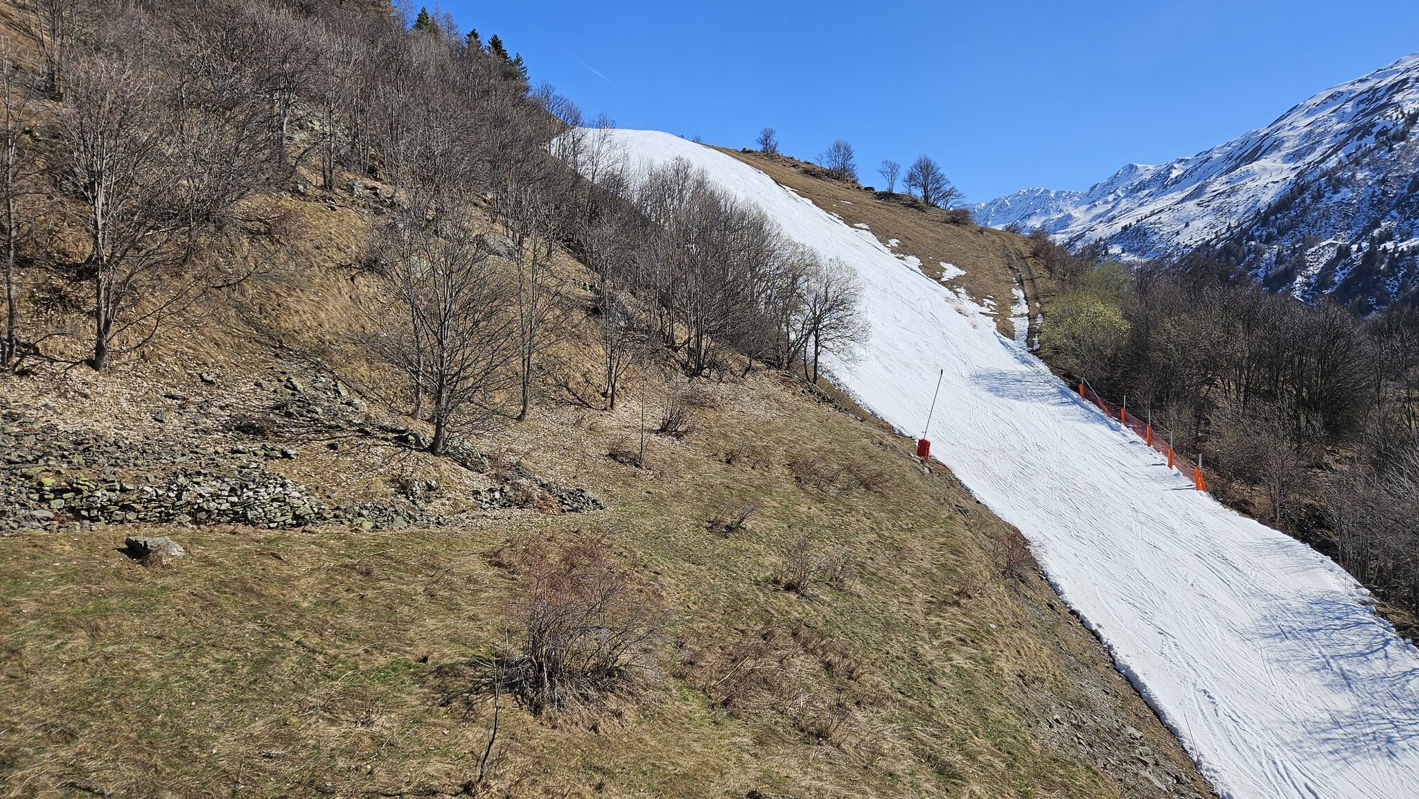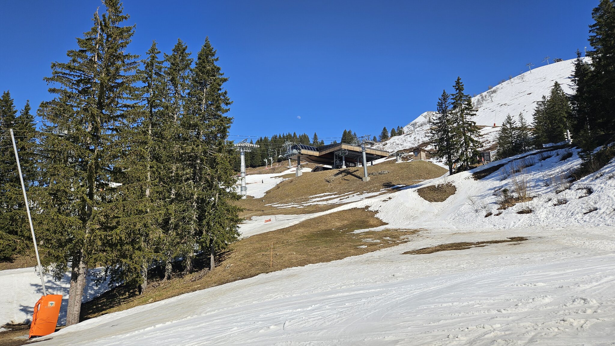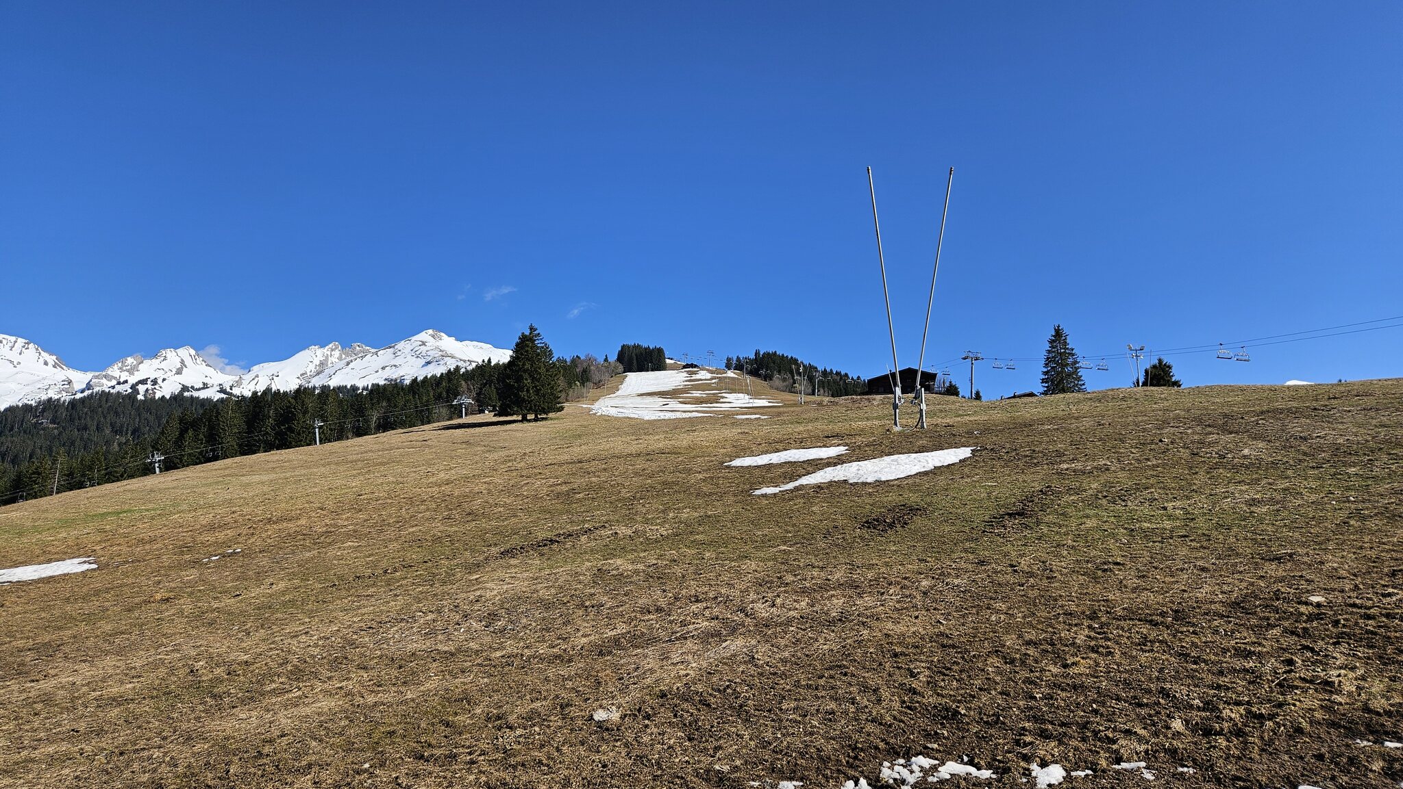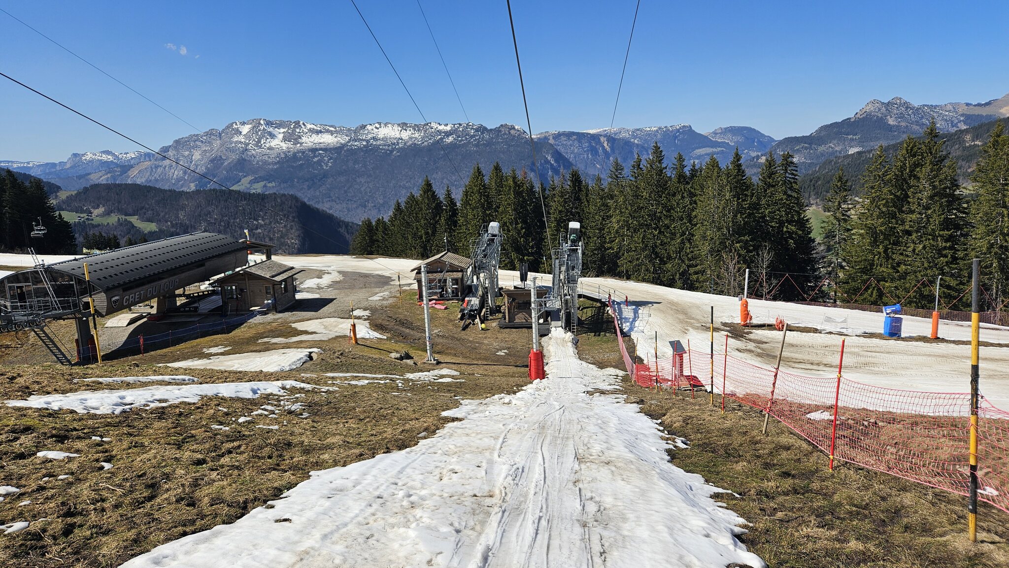 Obwohl schon saftig Grün (rechts sieht man die zweite Talabfahrtsvariante, welche sogar Beschneiung hätte)