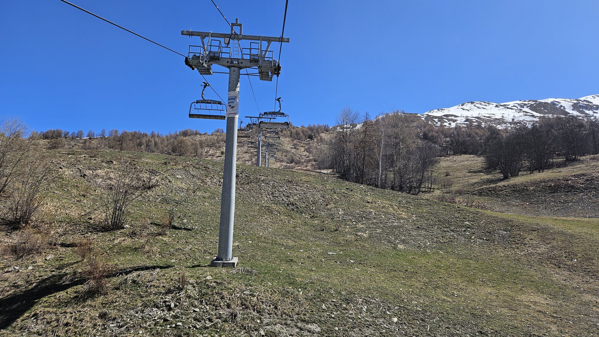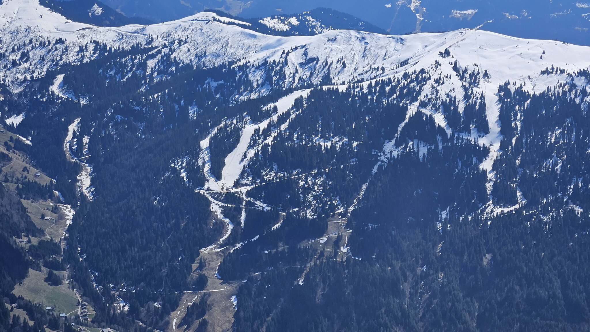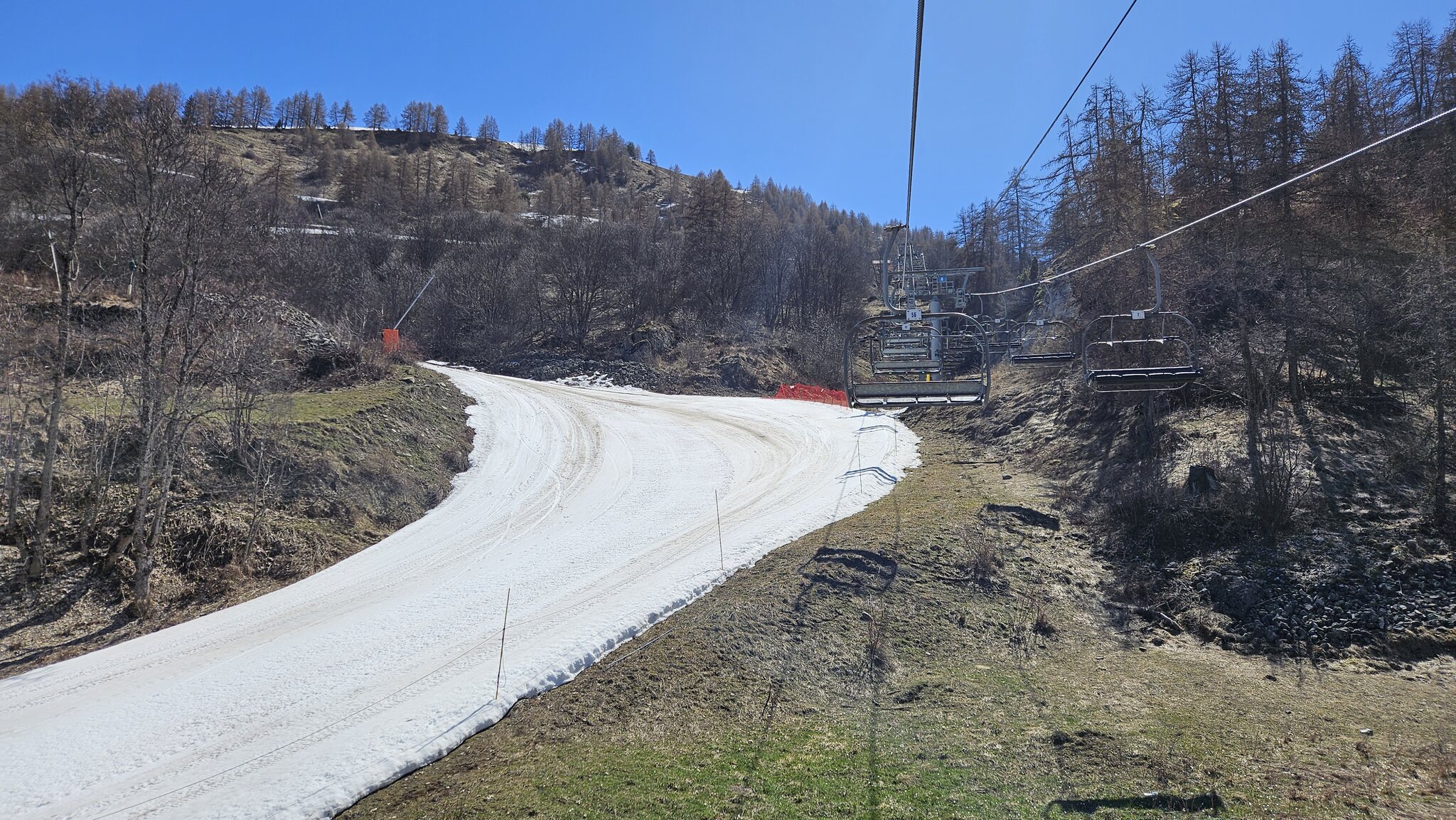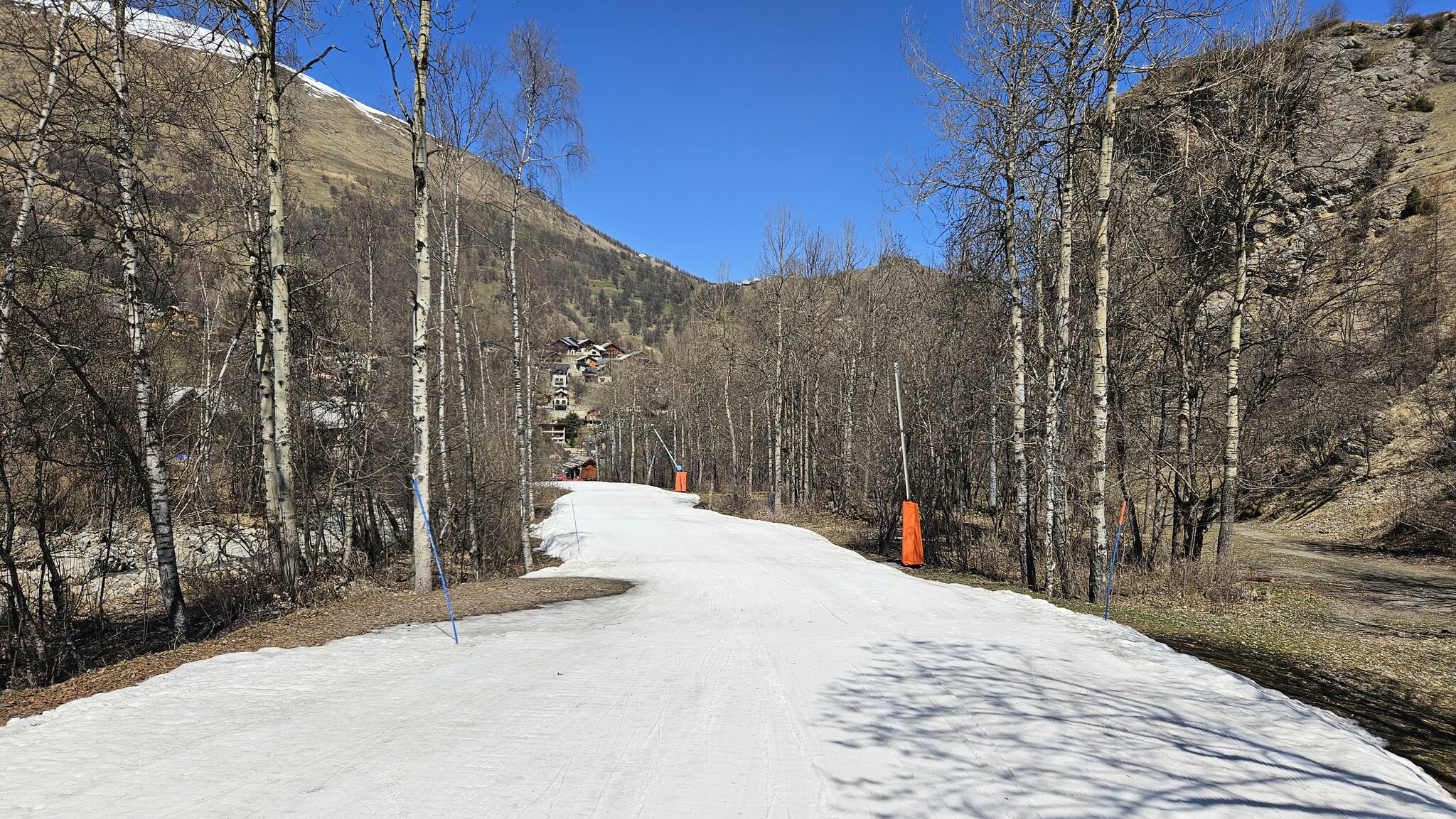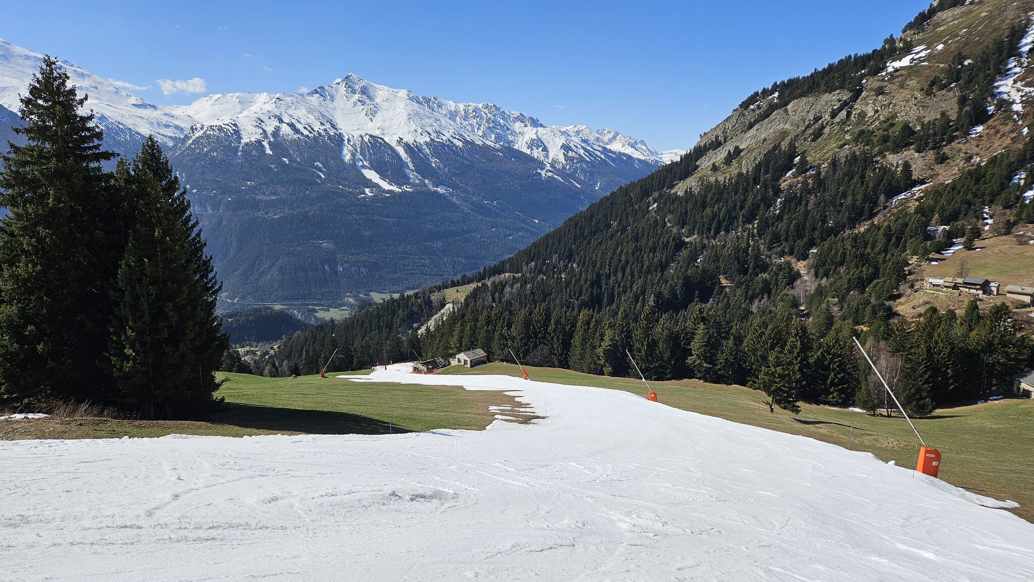 Obwohl schon saftig Grün (rechts sieht man die zweite Talabfahrtsvariante, welche sogar Beschneiung hätte)