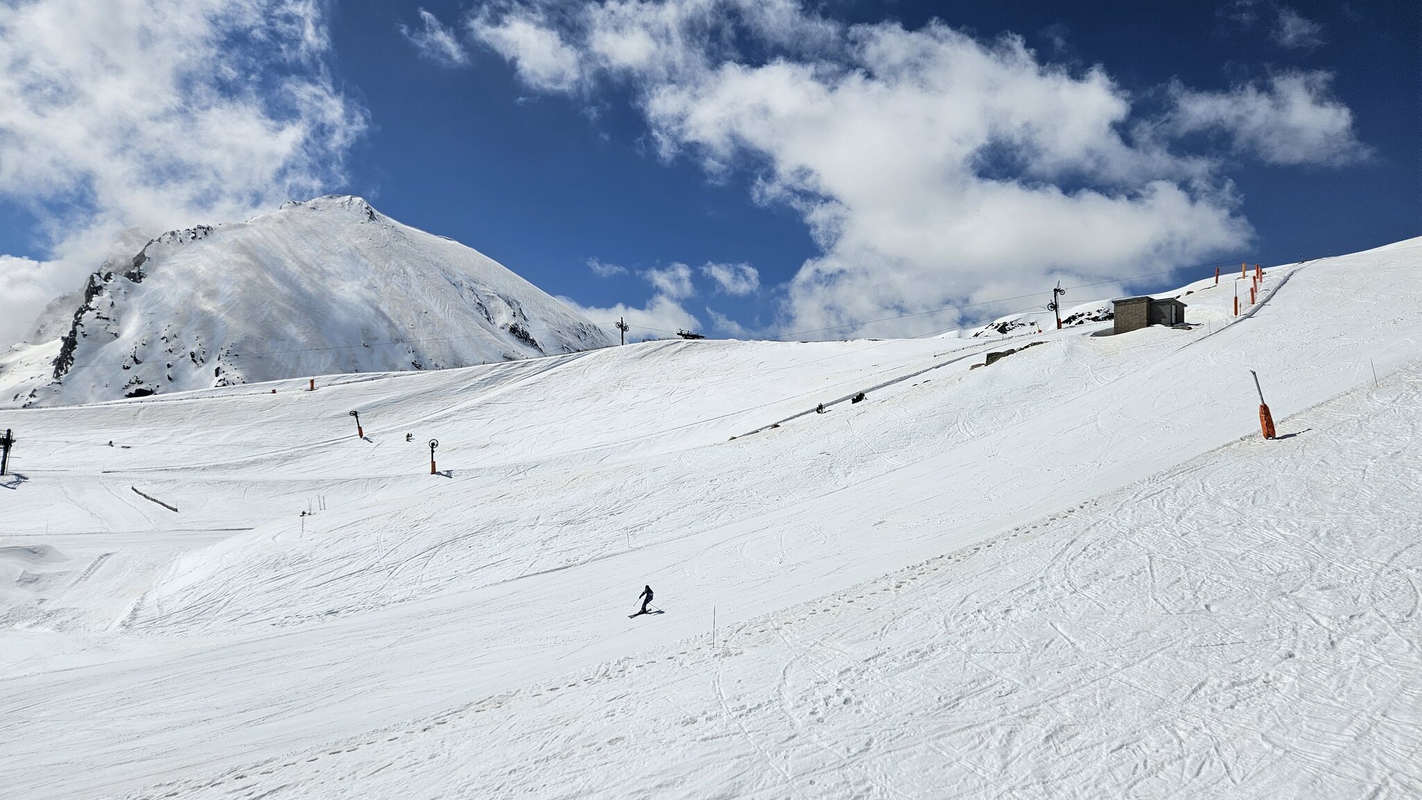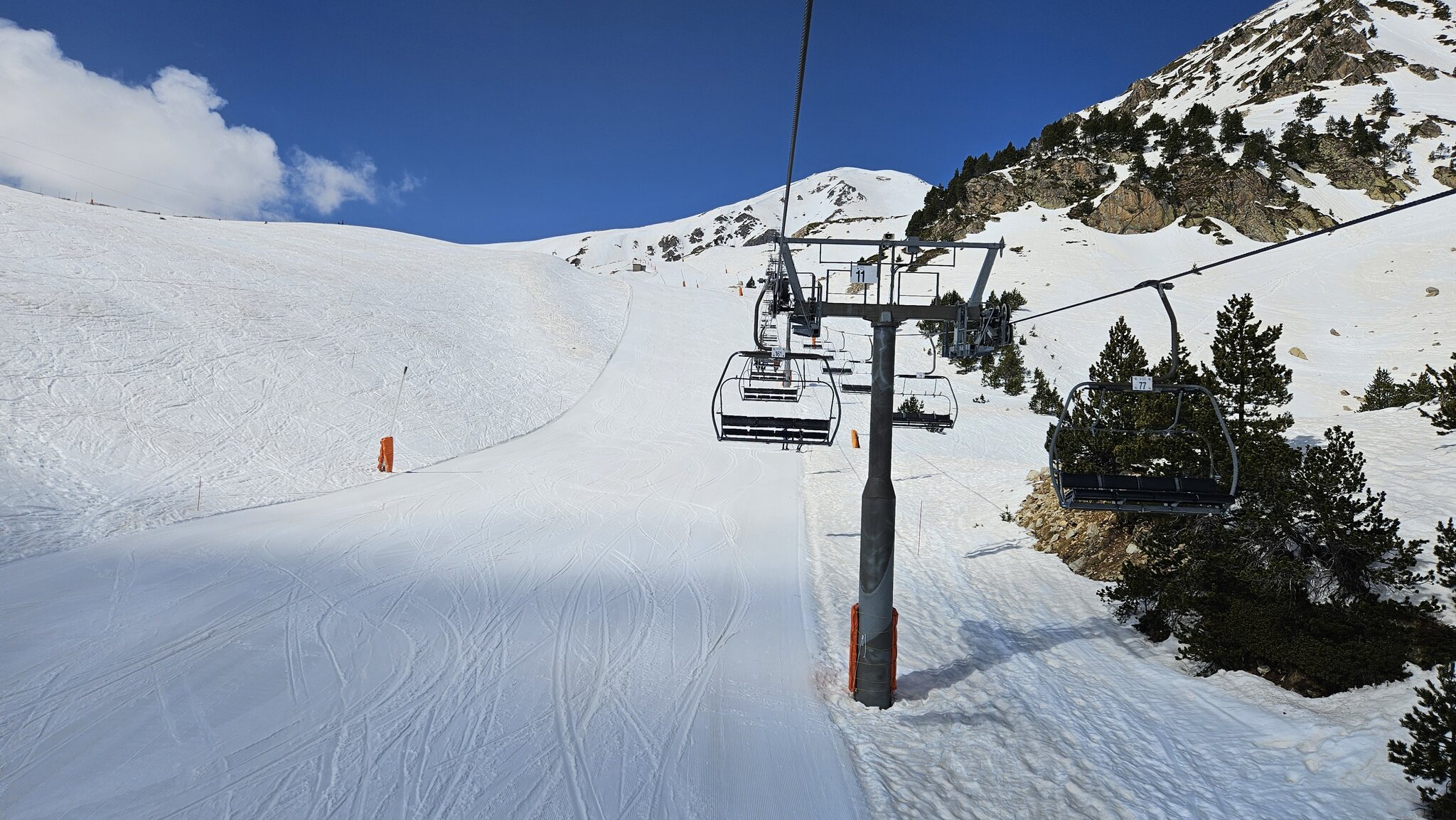 Dank den Schneefällen im März liegt hier immer noch genügend Schnee. Zum glück halten sie hier den Betrieb bis Ostern aufrecht. Nur natürlich jetzt unter der Woche ist ein wenig reduzierter Betrieb. Nur die 4SB und die Übungslifte sind geöffnet. Das stört jedoch nicht gross, da die SB fast alle Pistenvarianten erschliesst. Nur um die 2SB vom unteren Parkplatz ist es ein wenig schade, da so die hintenrum Variante wegfällt. Diese scheint aber schon länger nicht mehr in Betrieb gewesen zu sein, da die Hälfte der Sessel am Seil fehlen.