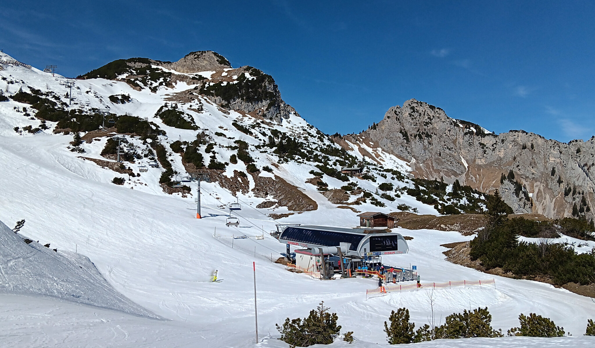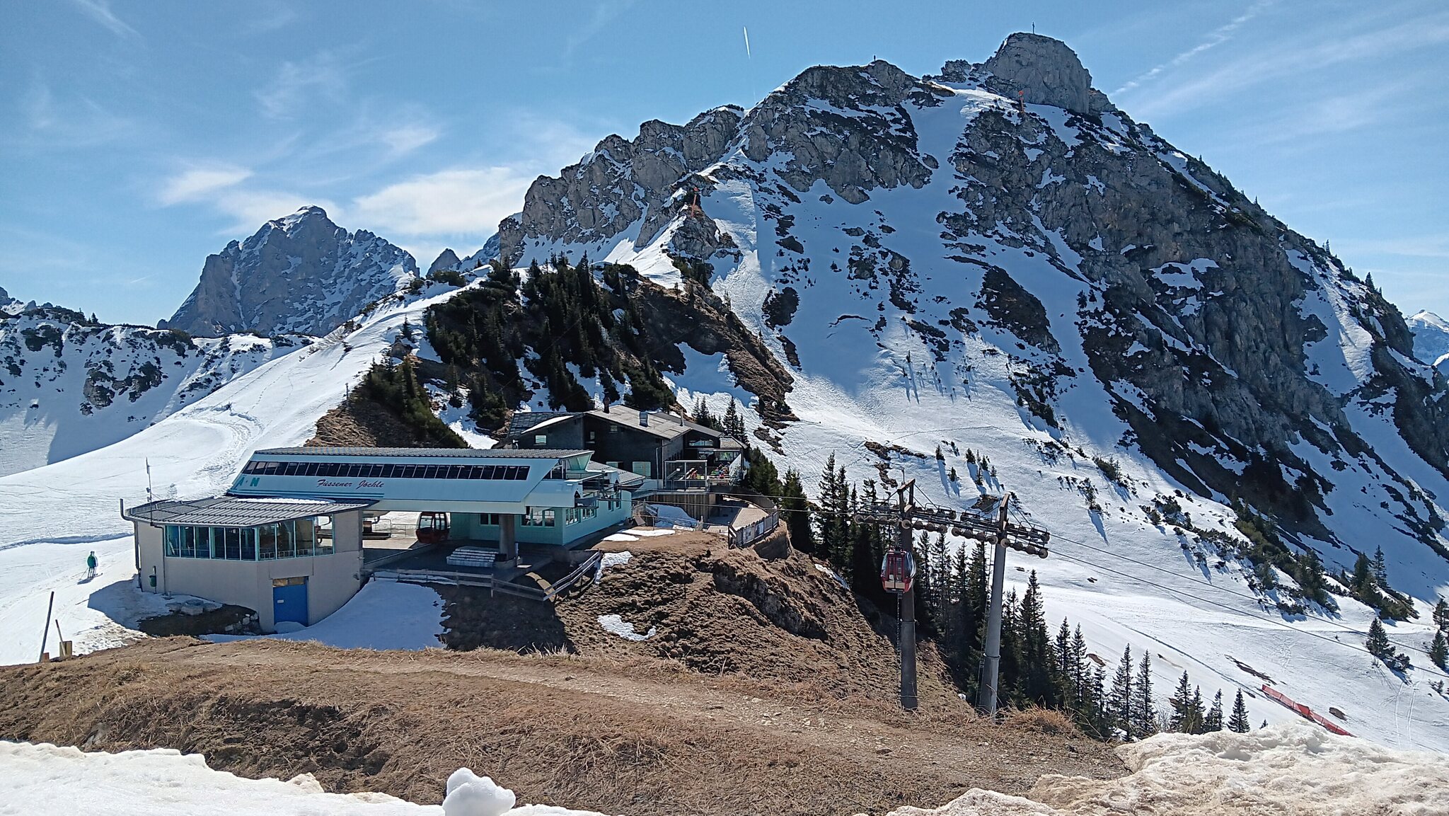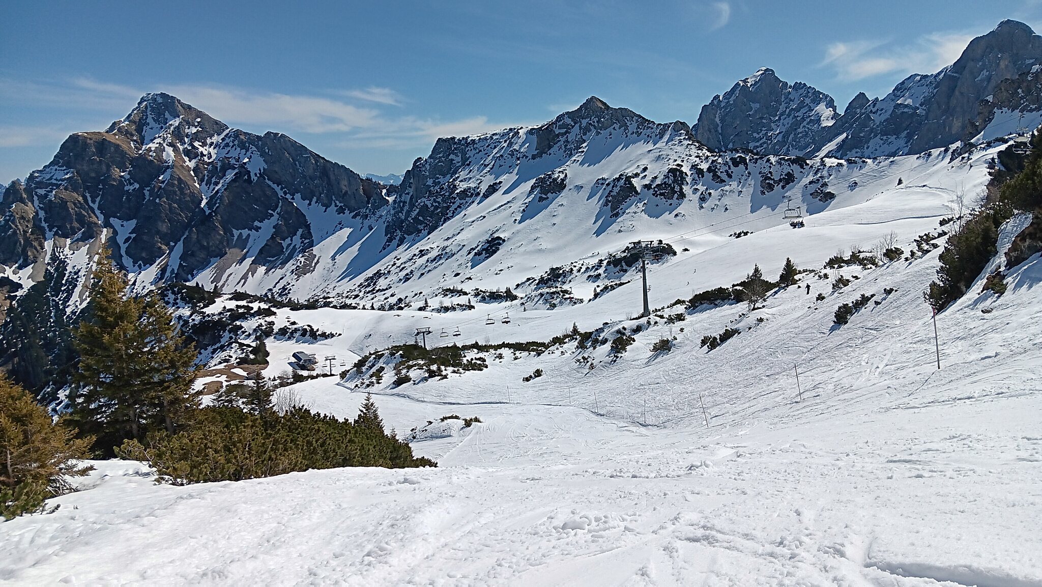 Am Parkplatz unten kurz nach neun etwa 40 Autos. Geöffnet waren nur die Pisten unter dem Sessellift, sonst war keine Piste mehr geöffnet. Trotzdem keine Wartezeiten am Sessel. Frühjahrstypisch gab es am Morgen griffige Pisten, die dann aber schon gegen zehn bis elf Uhr recht weich wurden. Aufgrund der wenigen Gäste im Gebiet kam es jedoch kaum zur Aufbuckelung. Gegen Mittag waren dann nur noch etwa 30 Personen im Gebiet unterwegs, mehrheitlich Snowboarder.