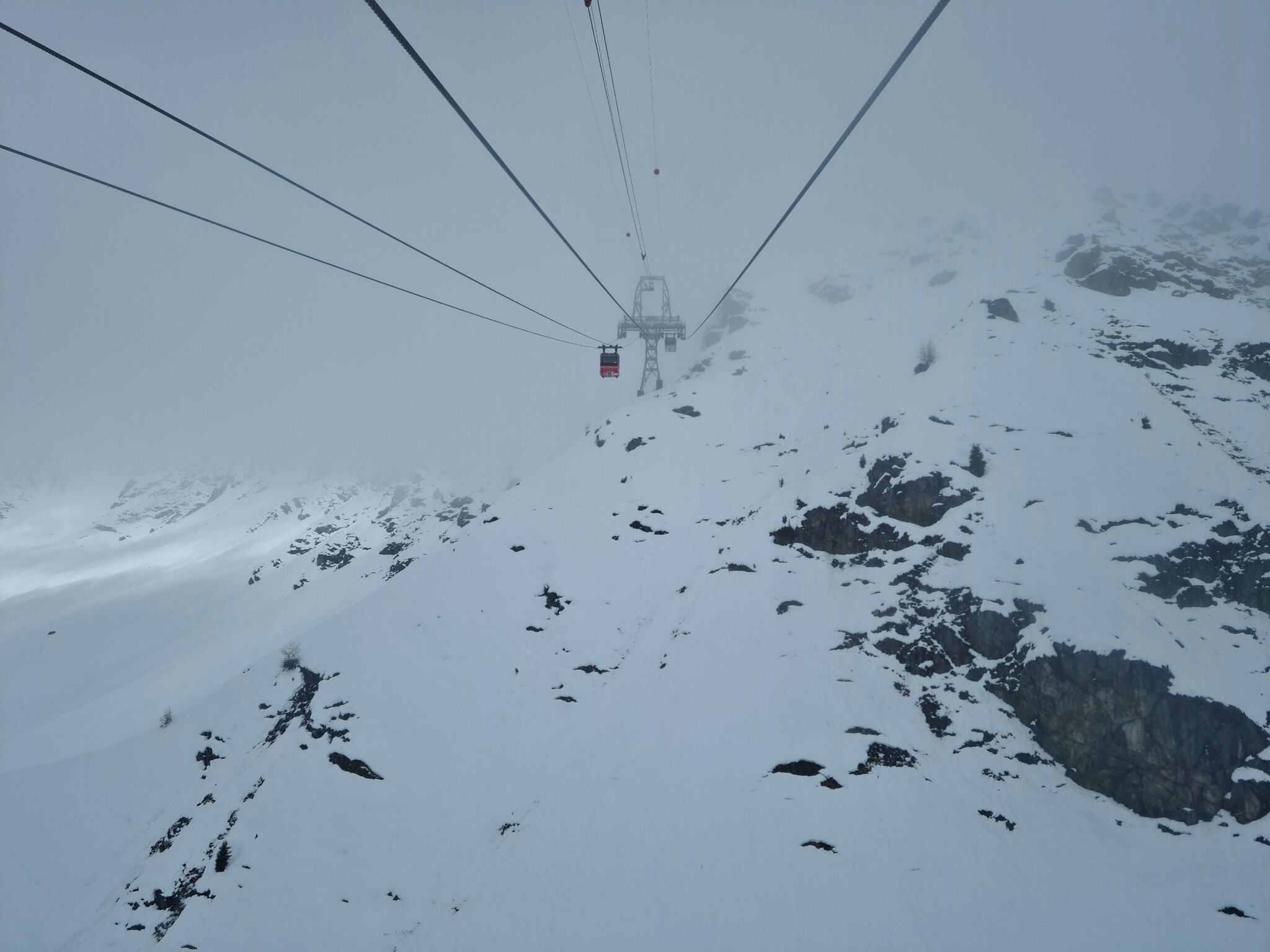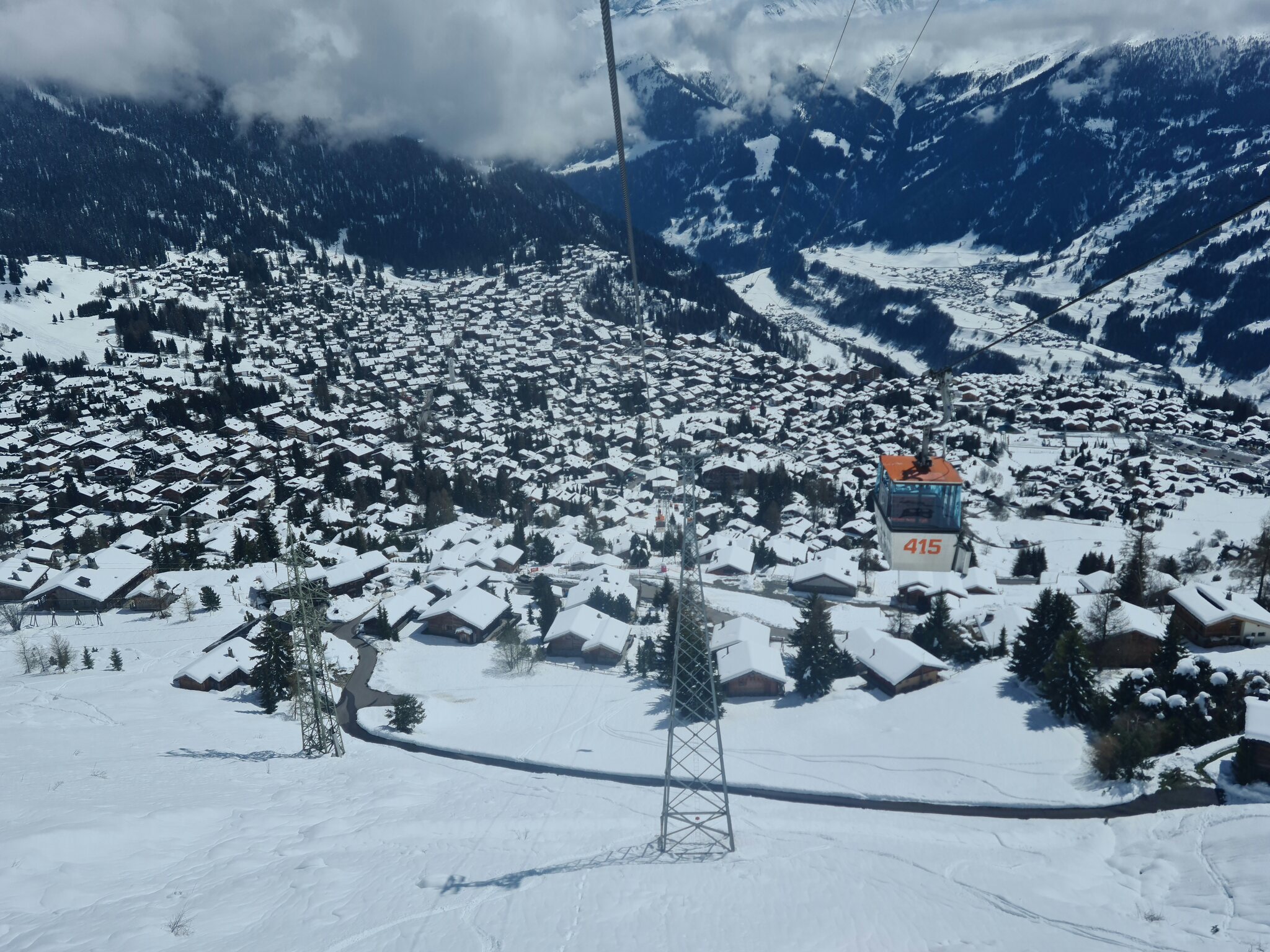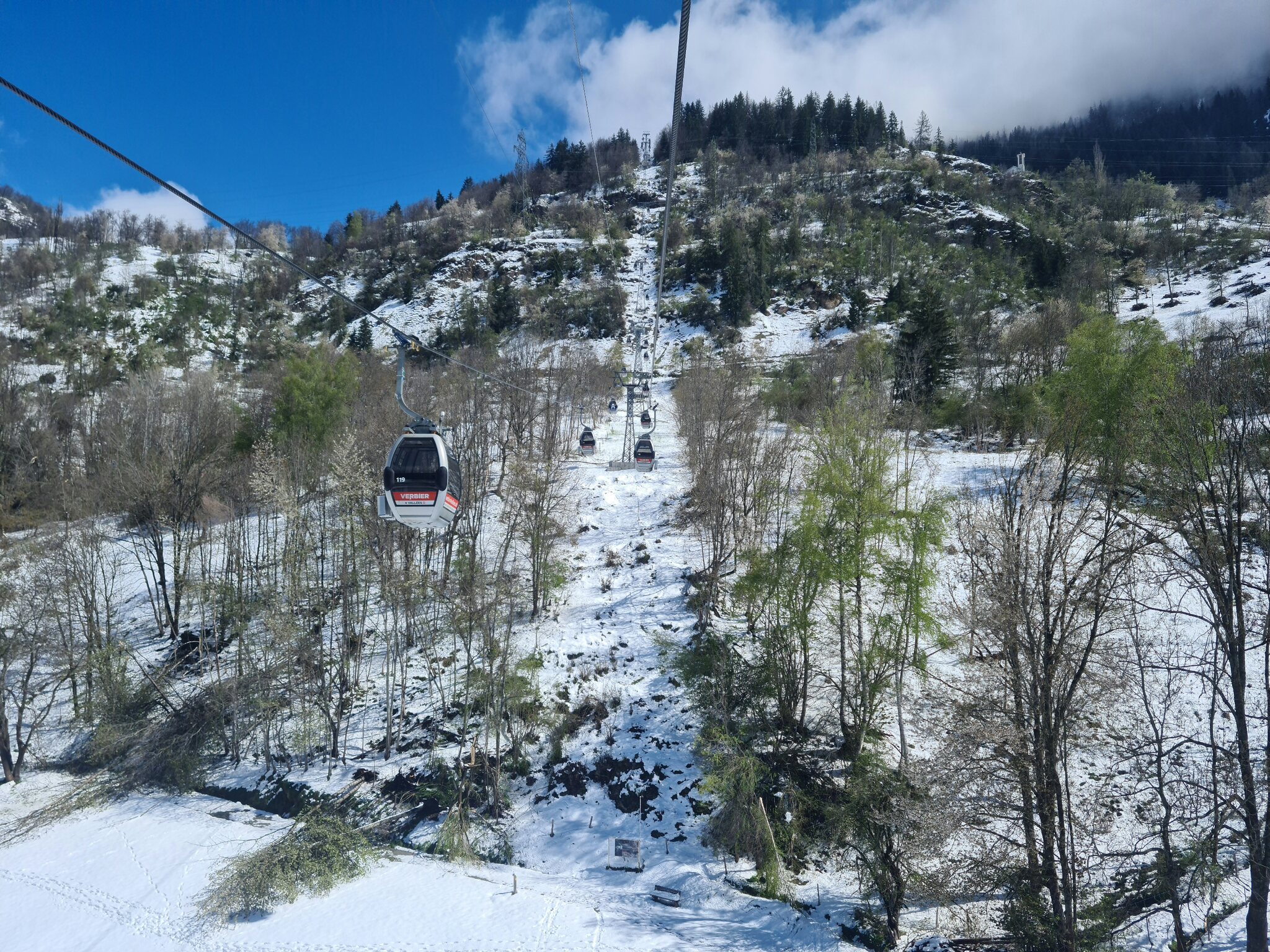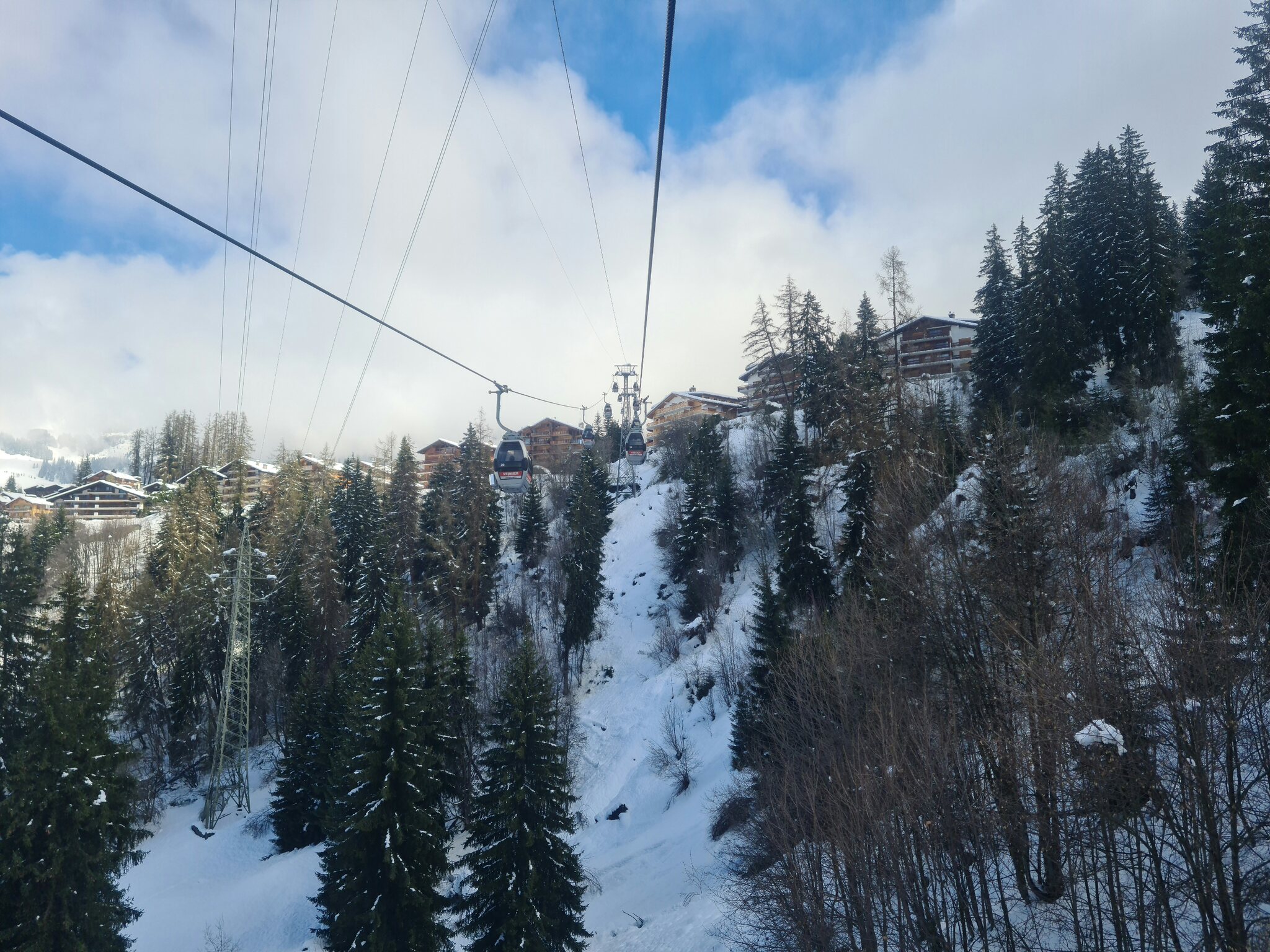 #1- In der Kabinenbahn Le Châble-Verbier. Vor ein paar Tagen hätte ich nicht gedacht, dass es so tief runter schneit.