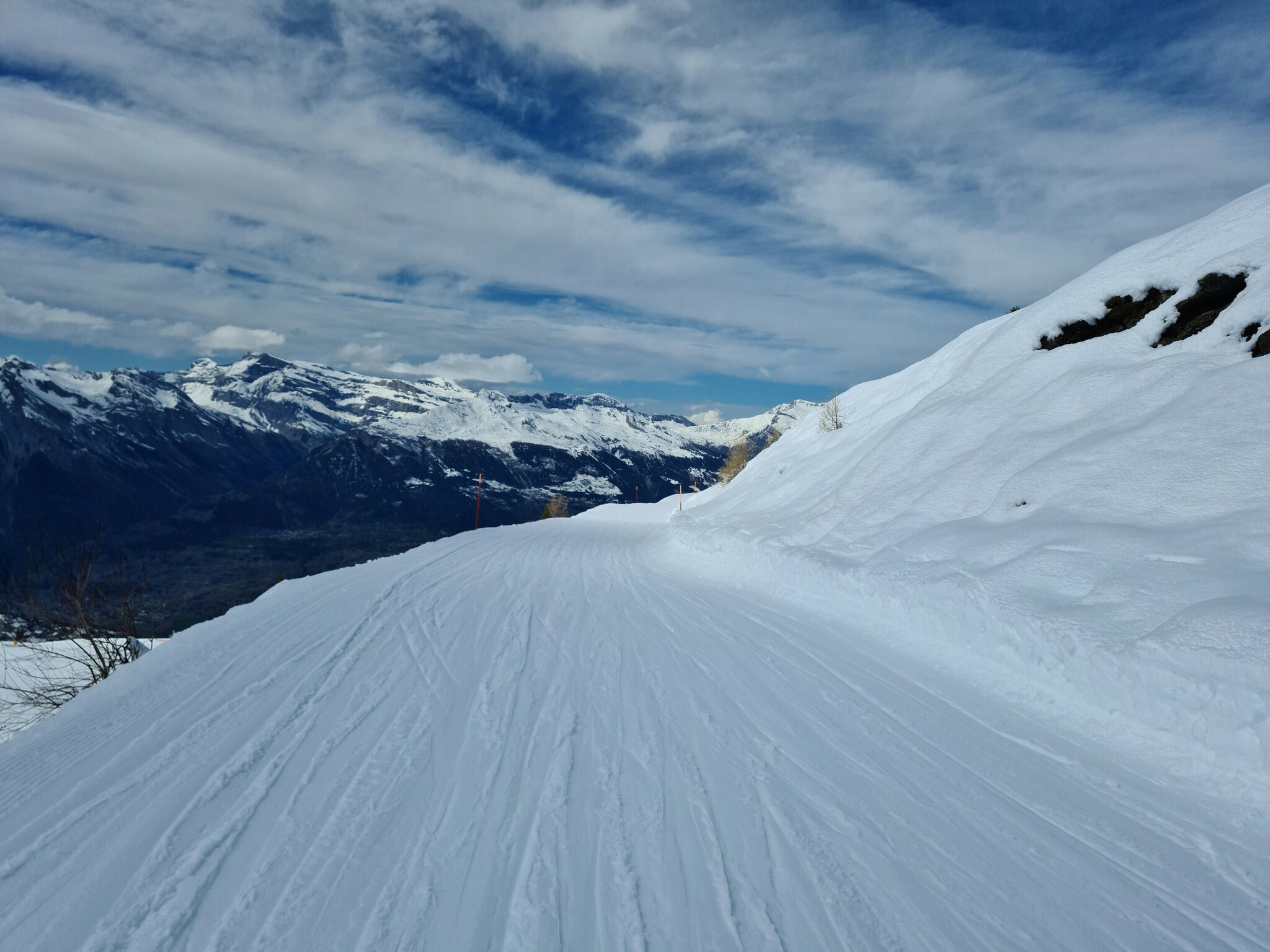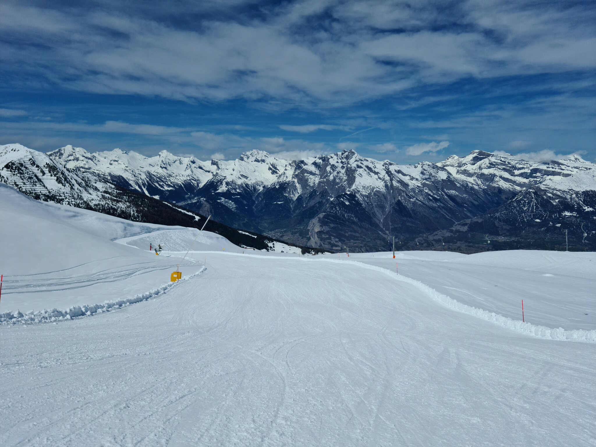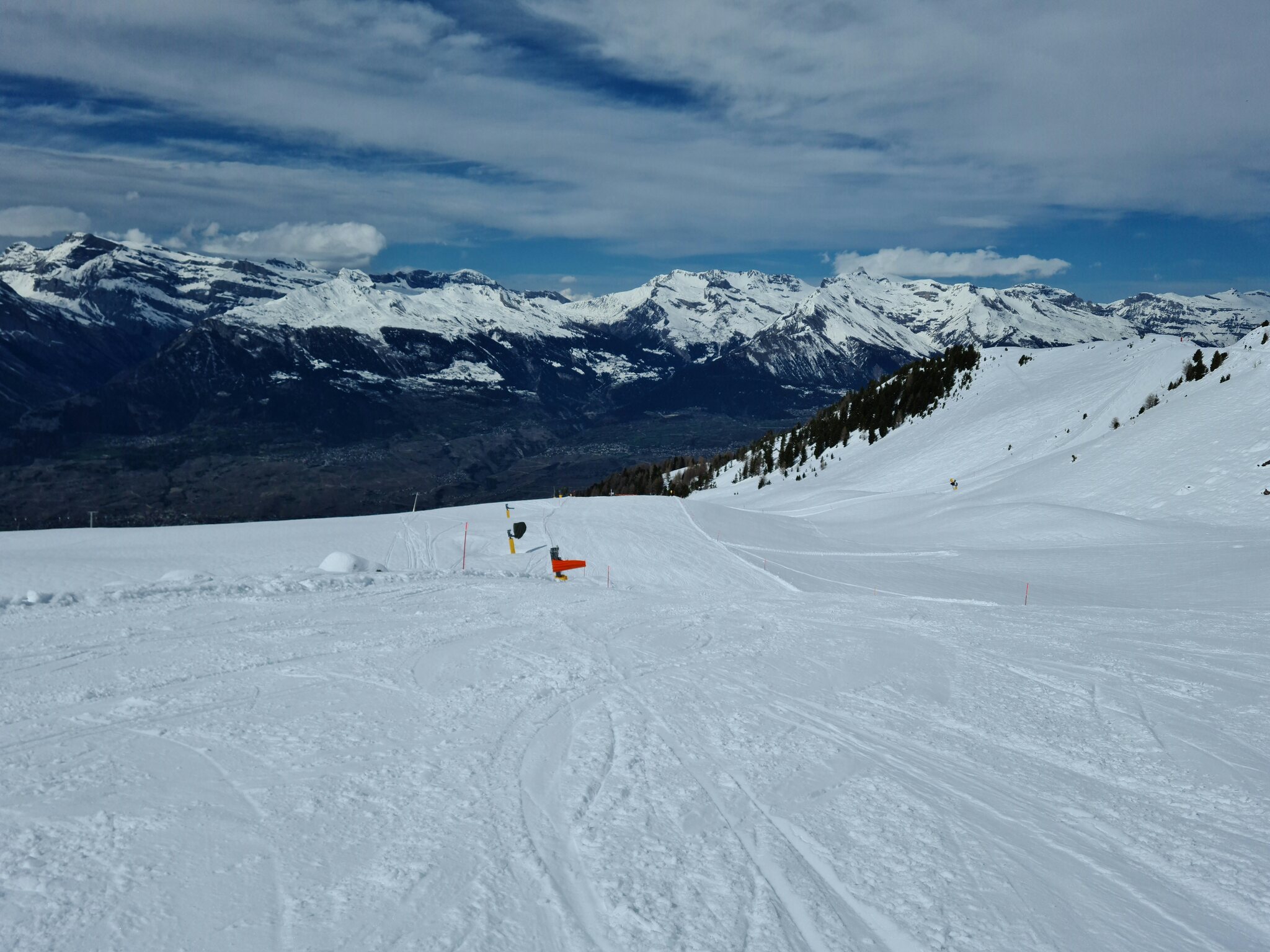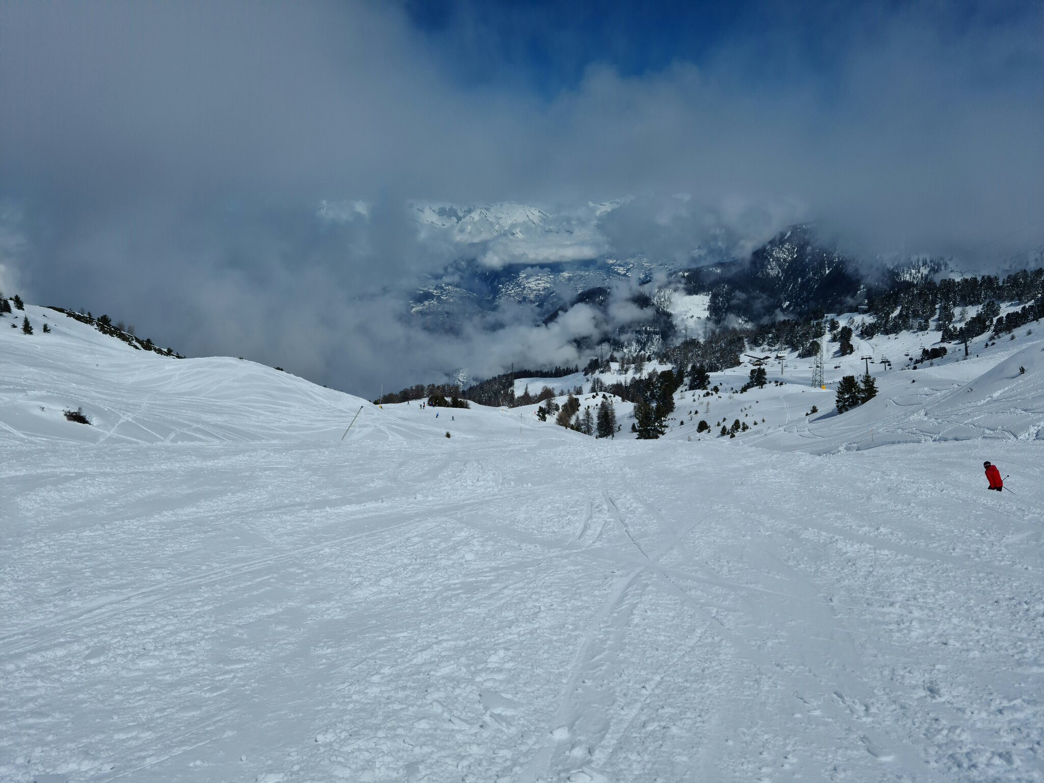 Heute war ich ab Veysonnaz bis Tortin unterwegs. Das Wetter war ähnlich zu gestern sehr gut, wobei gegen Nachmittag einige dünnere Wolken kamen. Weiterhin war es angenehm leer, wirklich anstehen musste ich nie, die einzige Schlange, die ich gesehen habe, war an der Pendelbahn Tortin- Col des Gentianes. Die Pisten waren meist in einem guten, oft recht weichen Zustand, sodass sie am Nachmittag teils zerfahren waren.