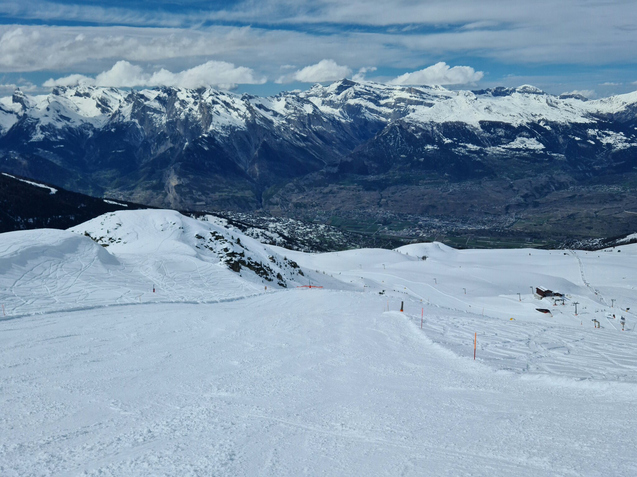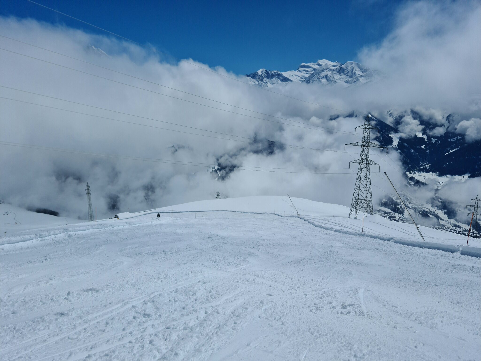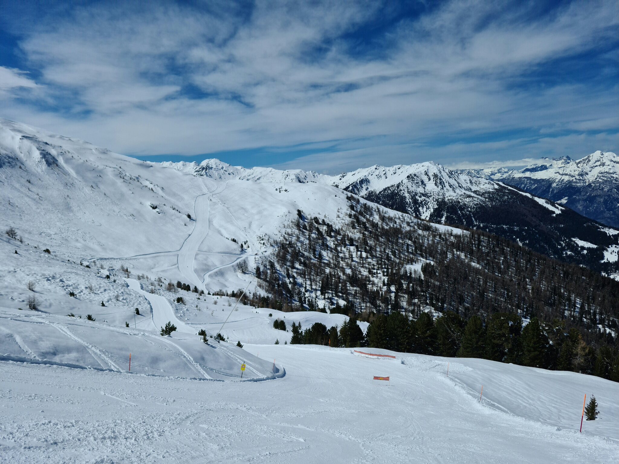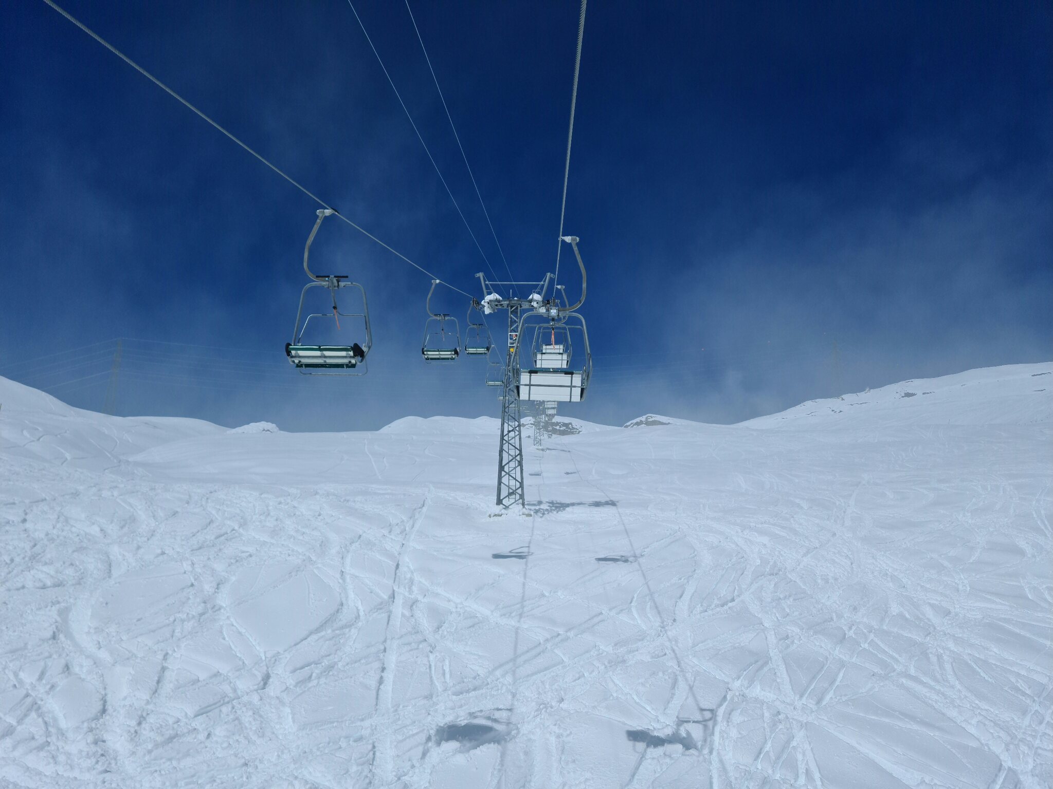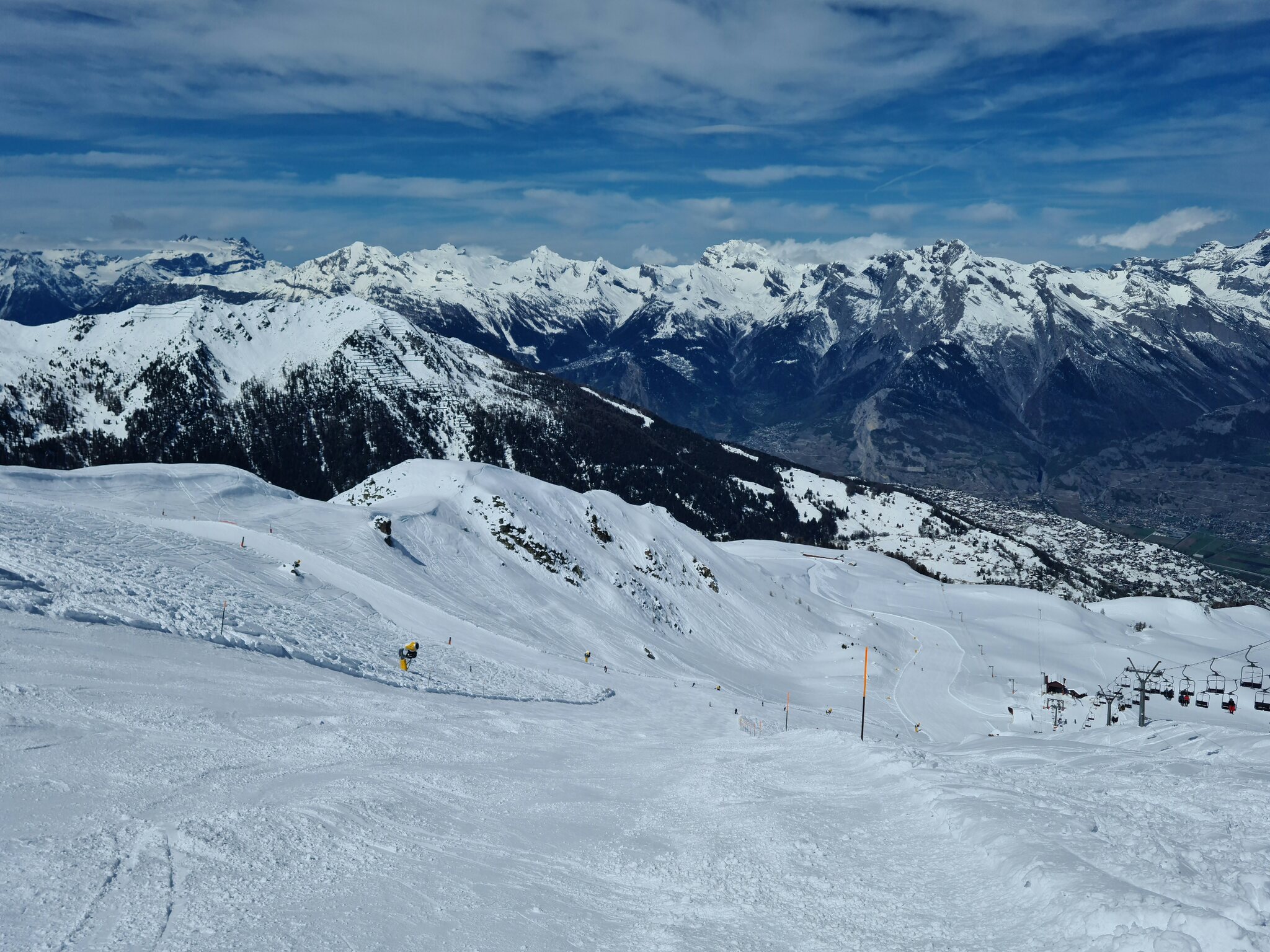 Heute war ich ab Veysonnaz bis Tortin unterwegs. Das Wetter war ähnlich zu gestern sehr gut, wobei gegen Nachmittag einige dünnere Wolken kamen. Weiterhin war es angenehm leer, wirklich anstehen musste ich nie, die einzige Schlange, die ich gesehen habe, war an der Pendelbahn Tortin- Col des Gentianes. Die Pisten waren meist in einem guten, oft recht weichen Zustand, sodass sie am Nachmittag teils zerfahren waren.