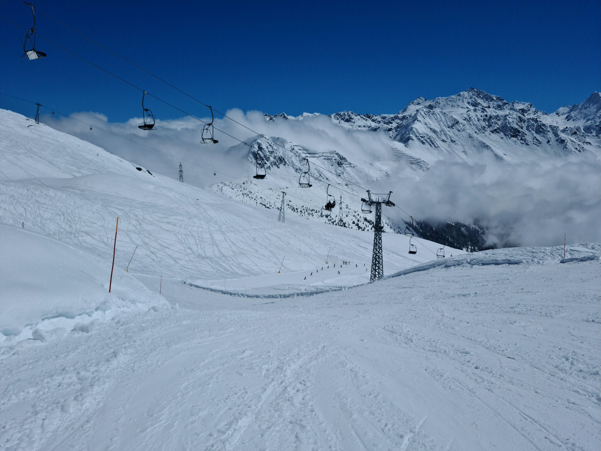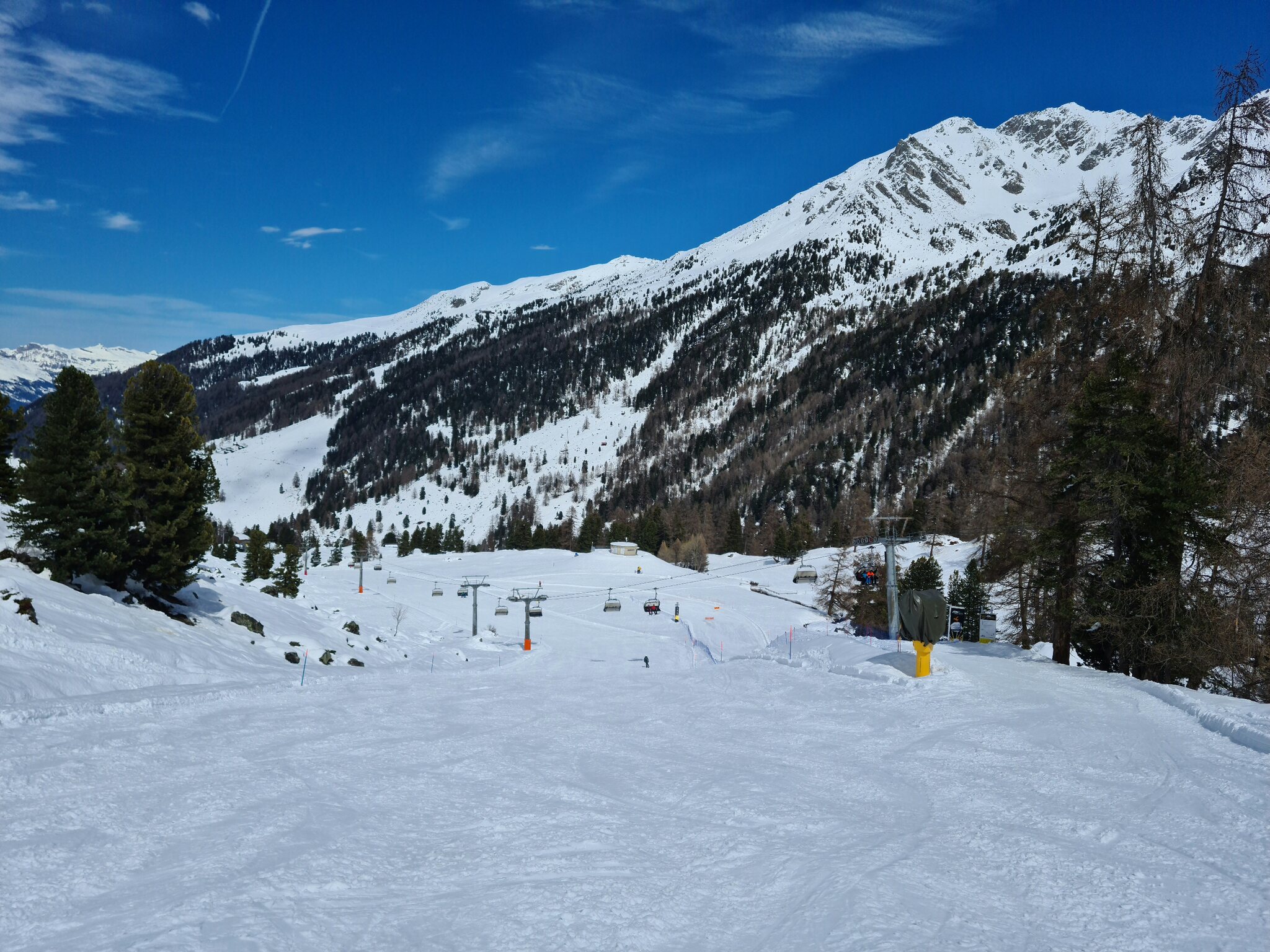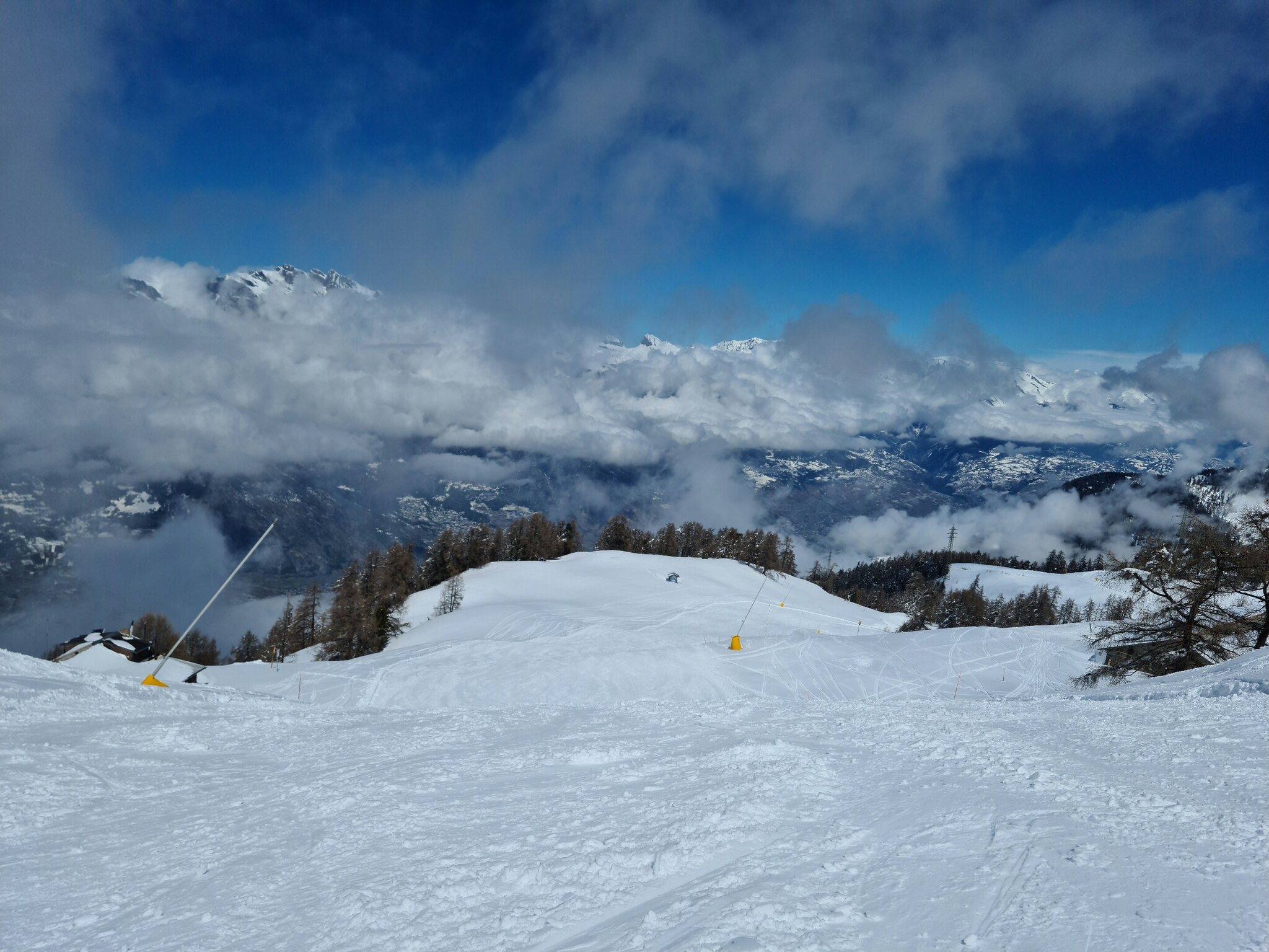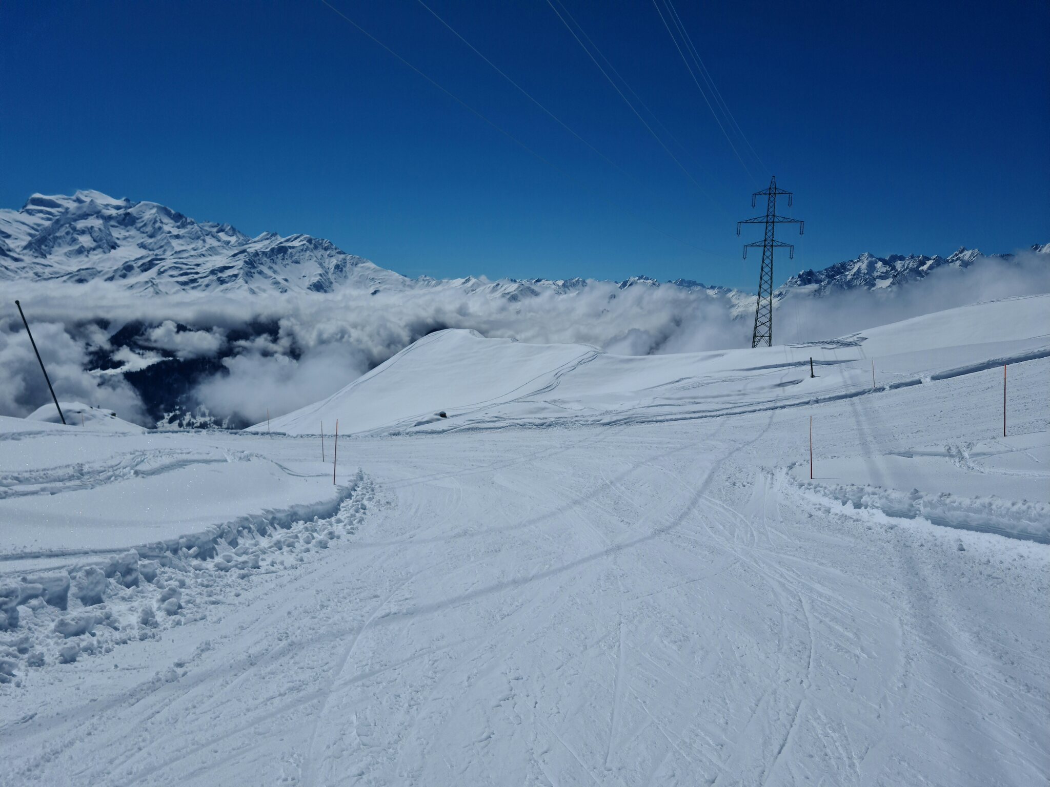 Heute war ich ab Veysonnaz bis Tortin unterwegs. Das Wetter war ähnlich zu gestern sehr gut, wobei gegen Nachmittag einige dünnere Wolken kamen. Weiterhin war es angenehm leer, wirklich anstehen musste ich nie, die einzige Schlange, die ich gesehen habe, war an der Pendelbahn Tortin- Col des Gentianes. Die Pisten waren meist in einem guten, oft recht weichen Zustand, sodass sie am Nachmittag teils zerfahren waren.