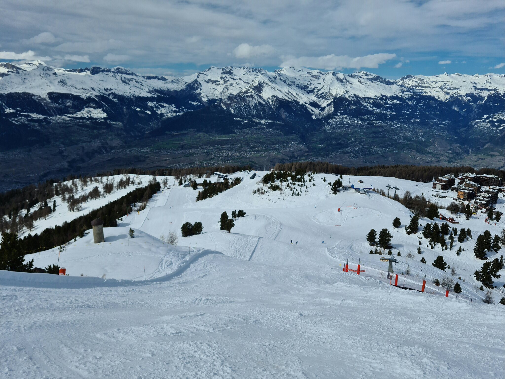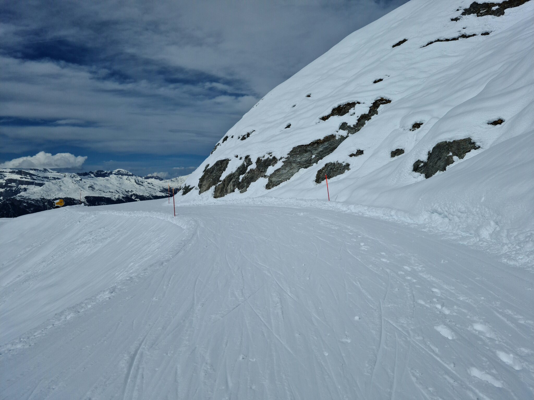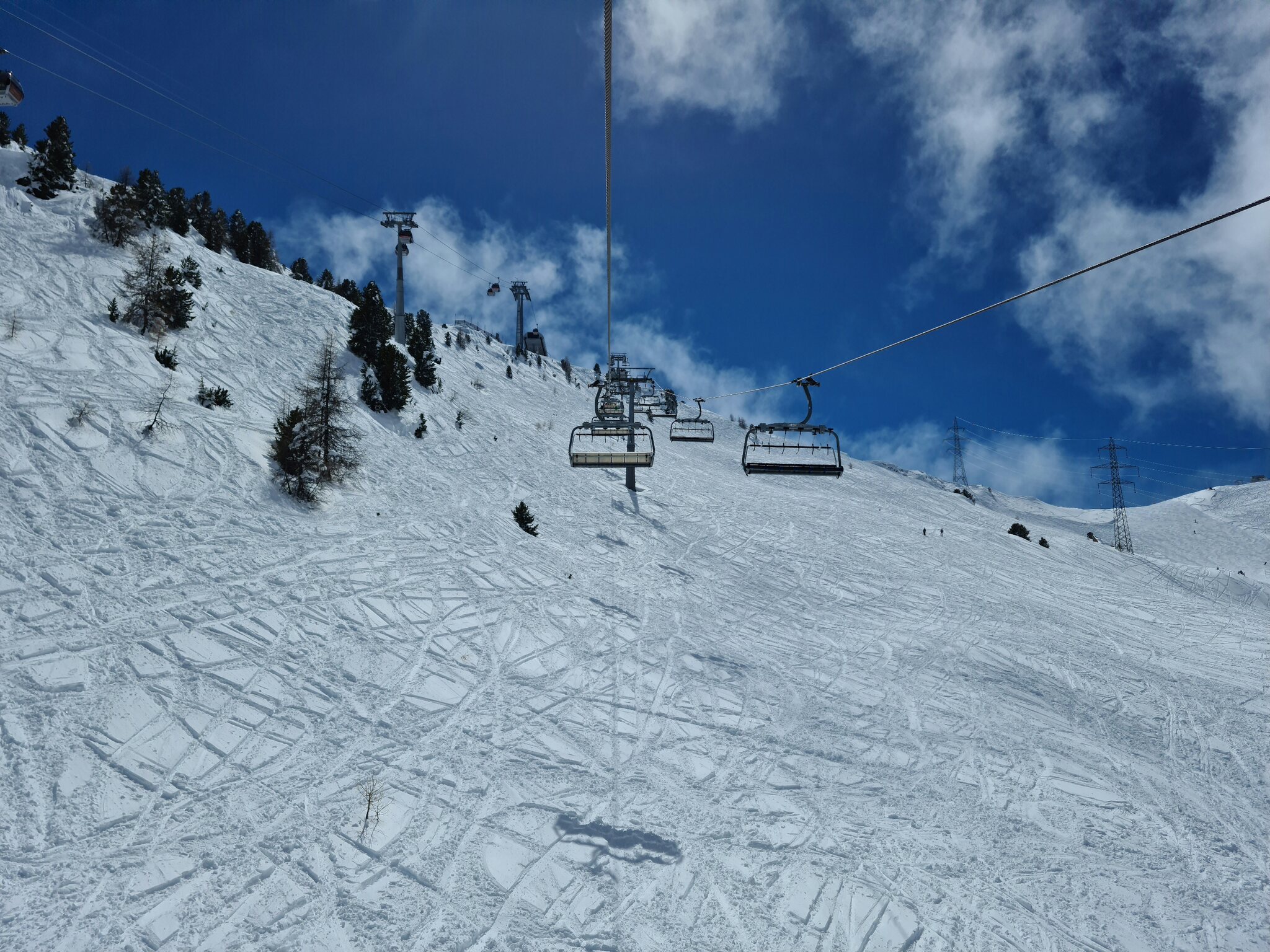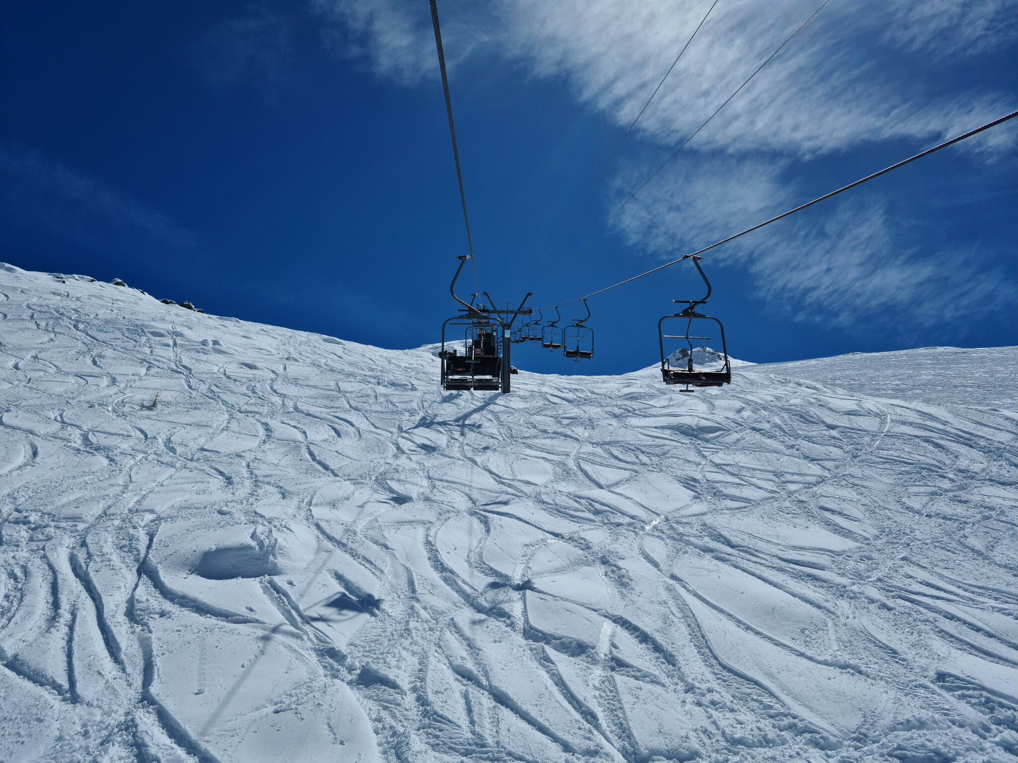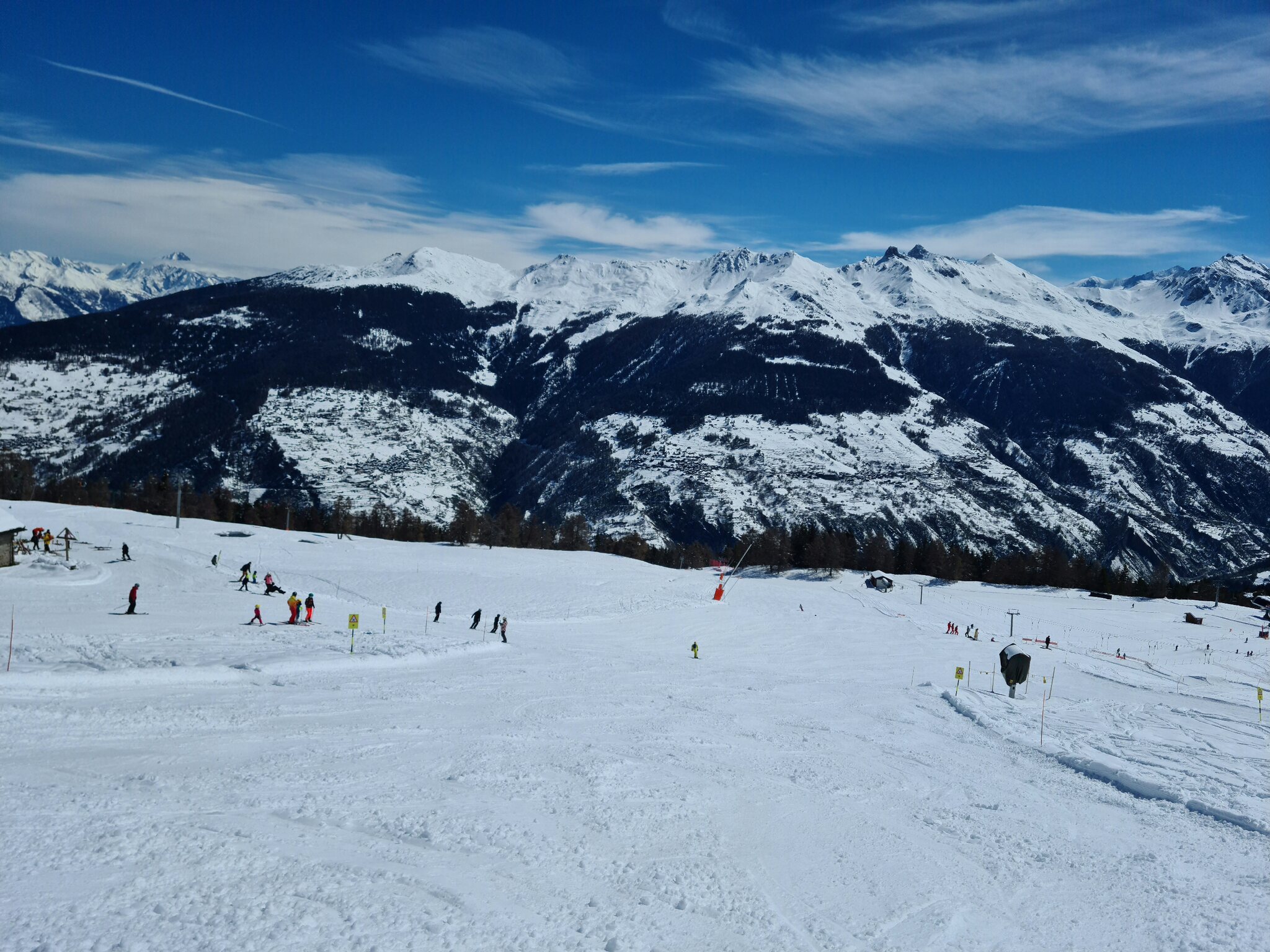 Heute war ich ab Veysonnaz bis Tortin unterwegs. Das Wetter war ähnlich zu gestern sehr gut, wobei gegen Nachmittag einige dünnere Wolken kamen. Weiterhin war es angenehm leer, wirklich anstehen musste ich nie, die einzige Schlange, die ich gesehen habe, war an der Pendelbahn Tortin- Col des Gentianes. Die Pisten waren meist in einem guten, oft recht weichen Zustand, sodass sie am Nachmittag teils zerfahren waren.