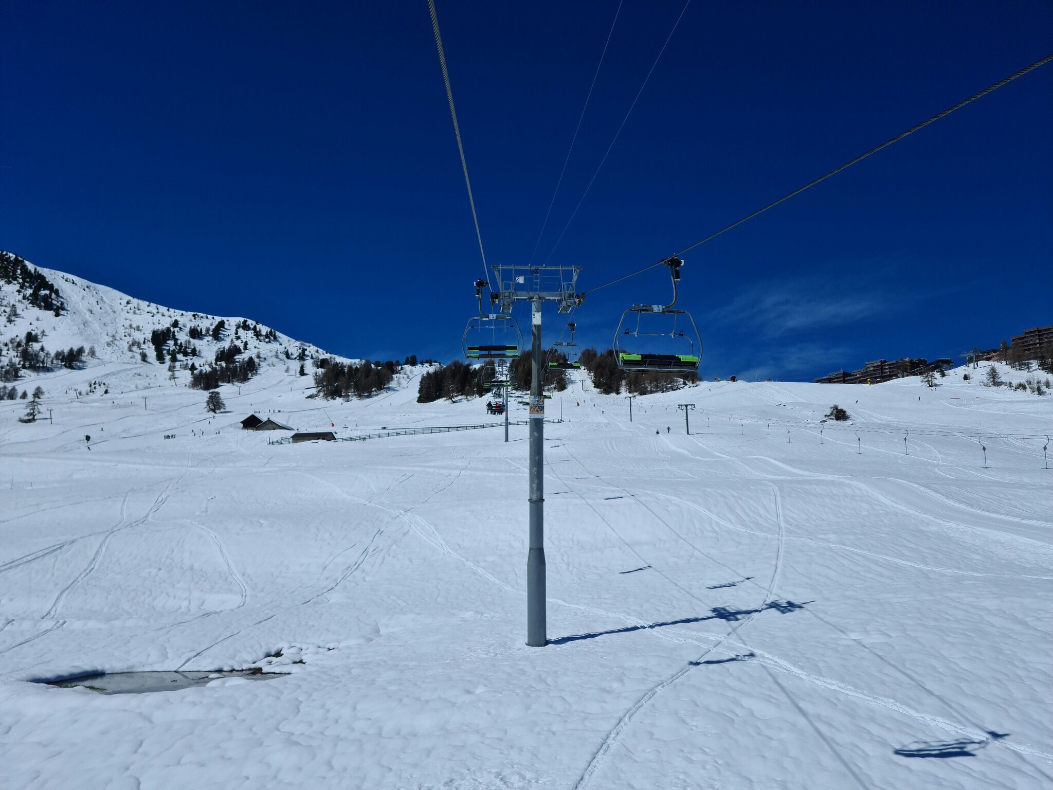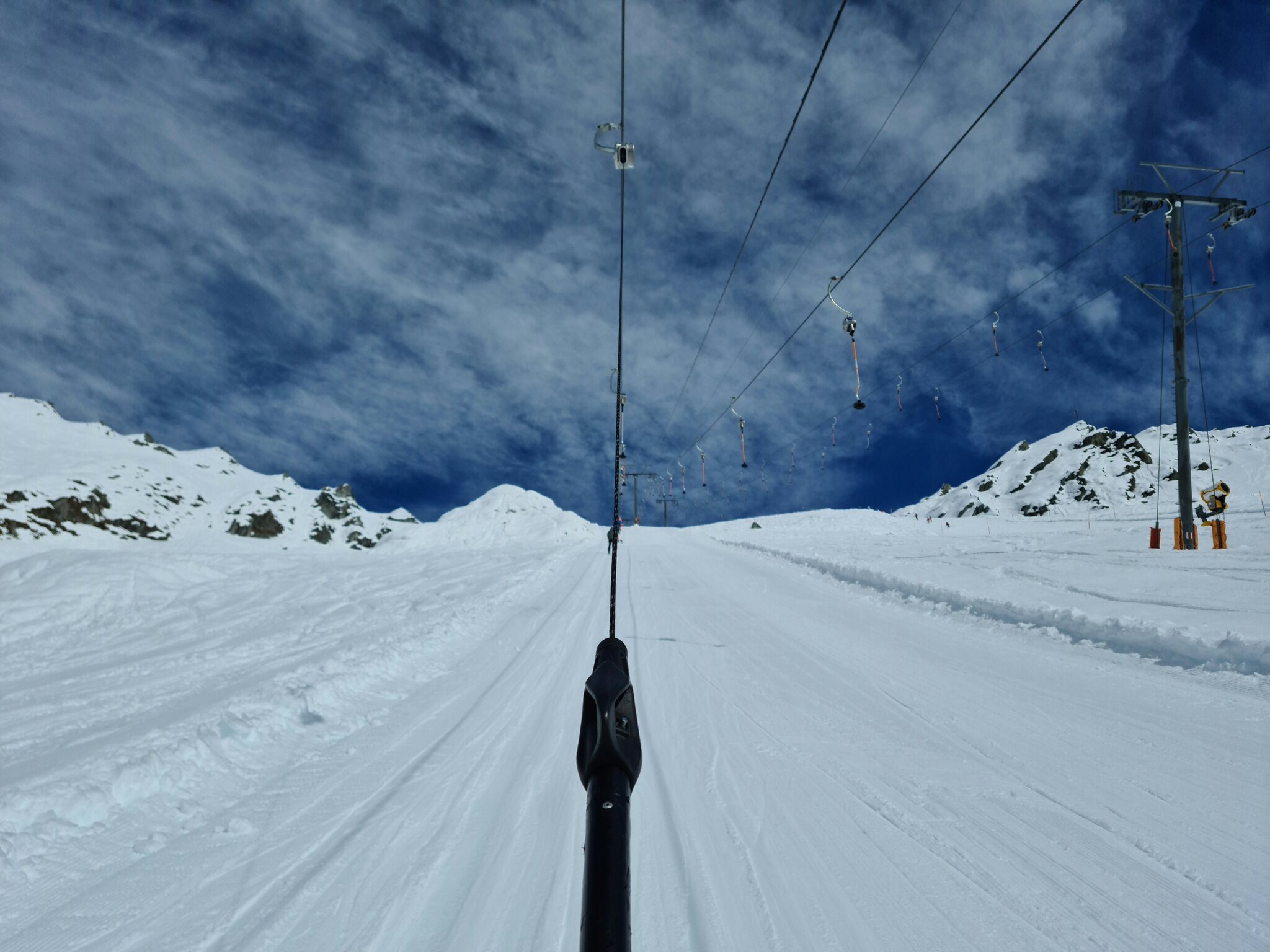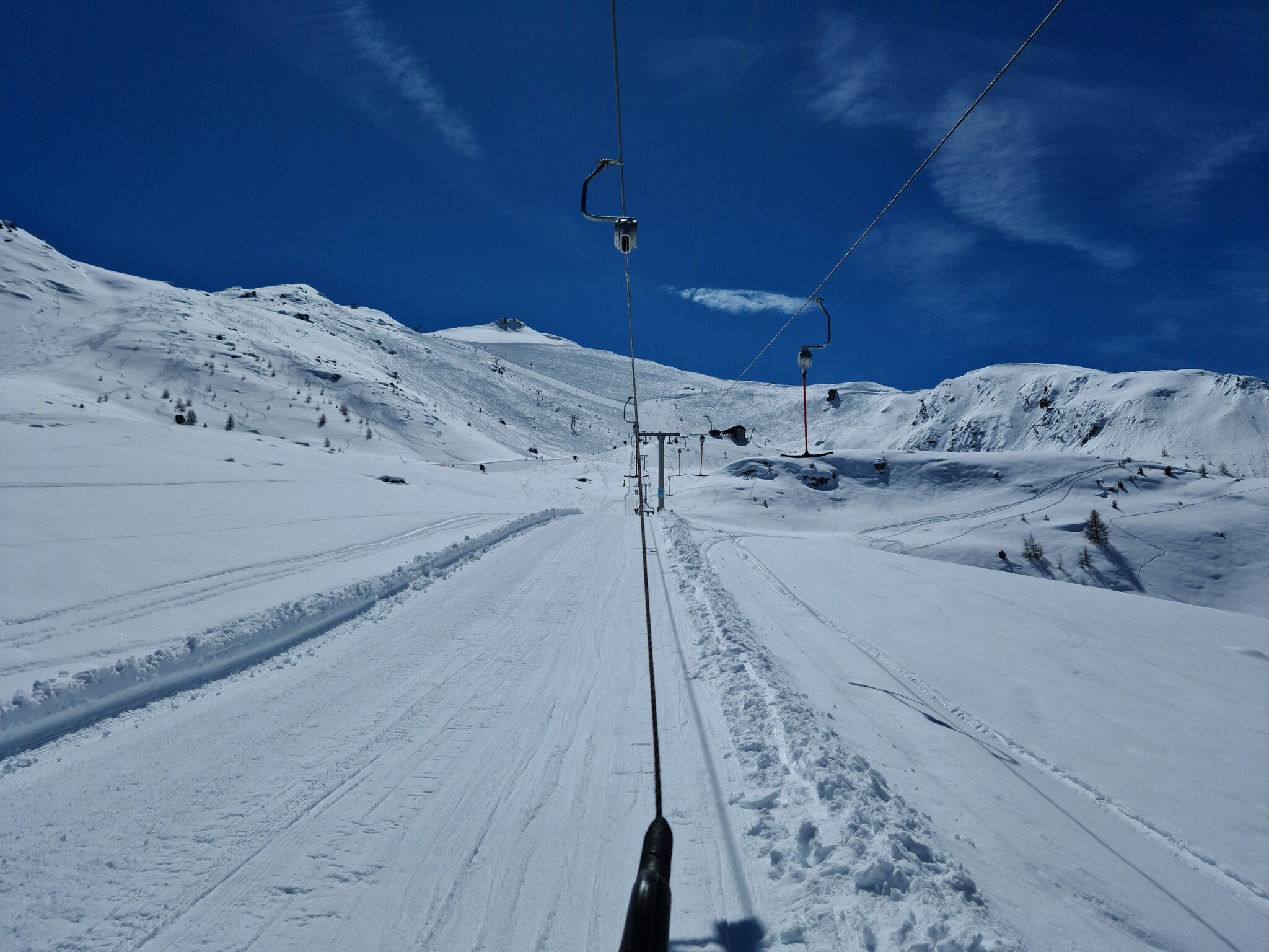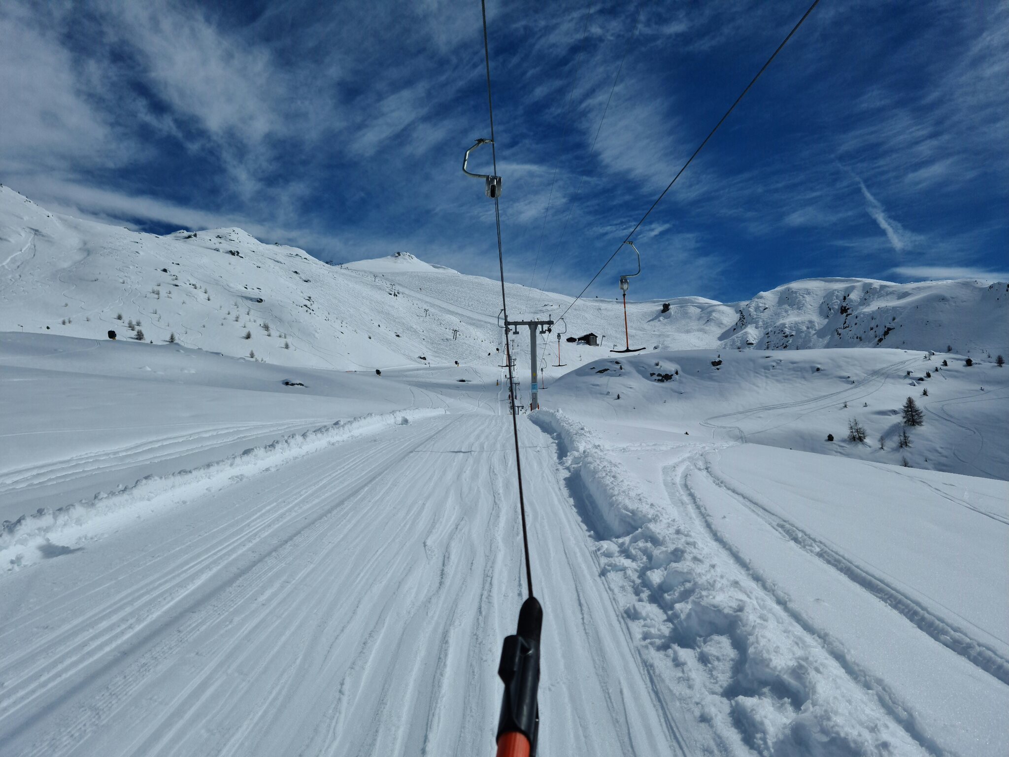 #13- Nach einer Fahrt mit dem Schlepplift Cheminée fuhr ich weiter in Richtung La Tsa. Genial, der Ausblick von Schlepplift zu Schlepplift, besonders mit den dahinterliegenden Schleppliften Les Chottes und Greppon Blanc!