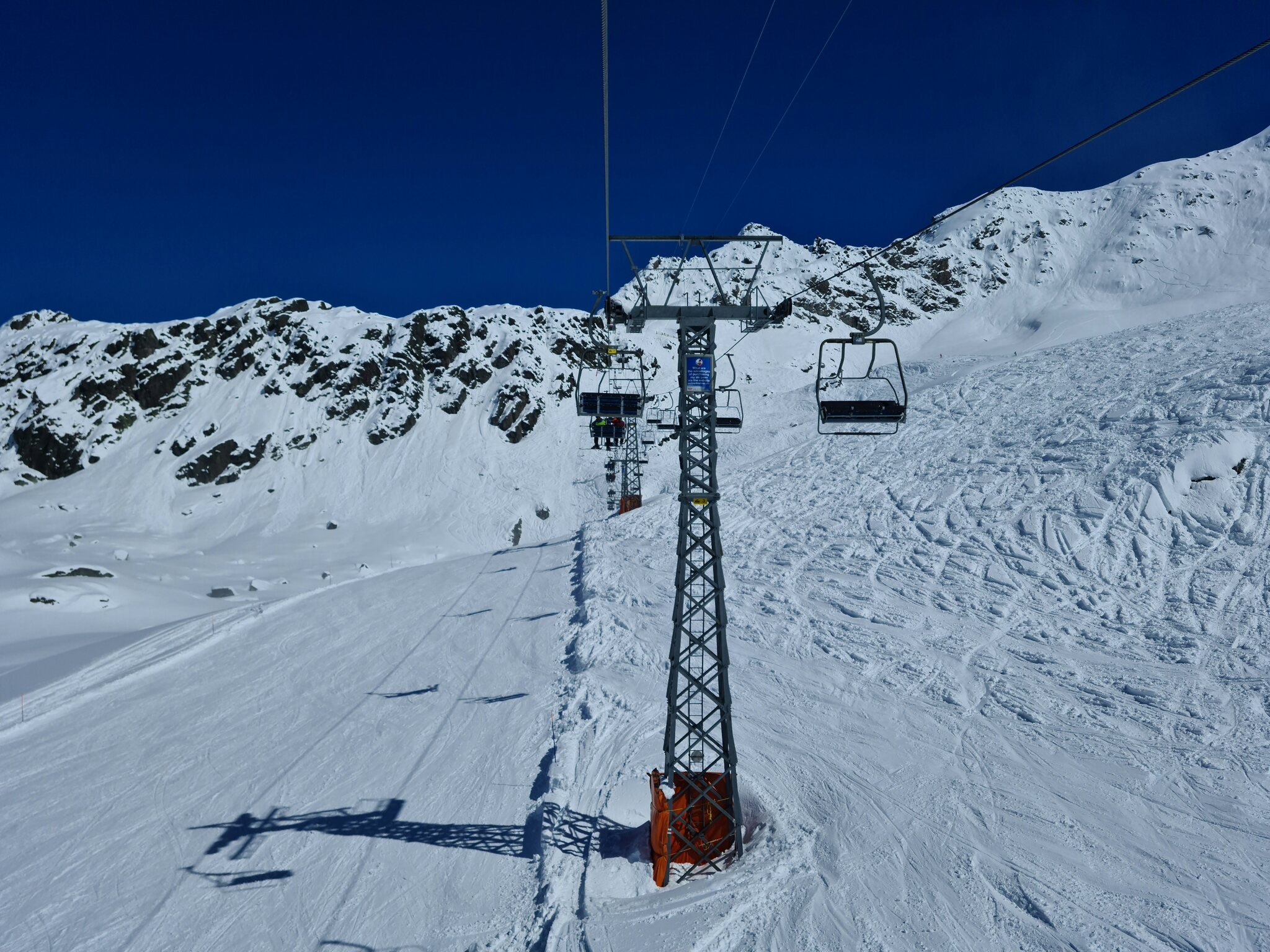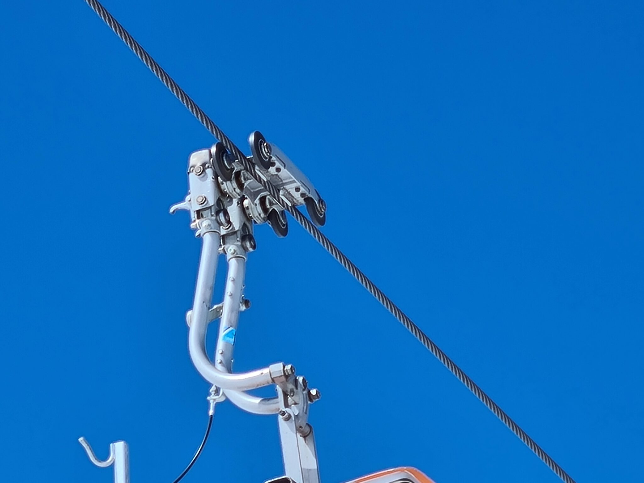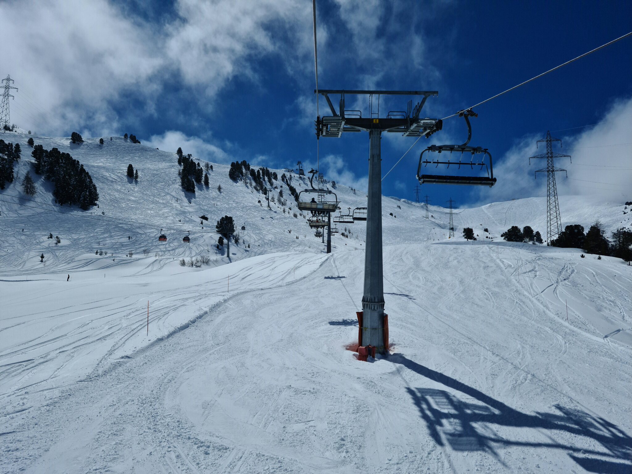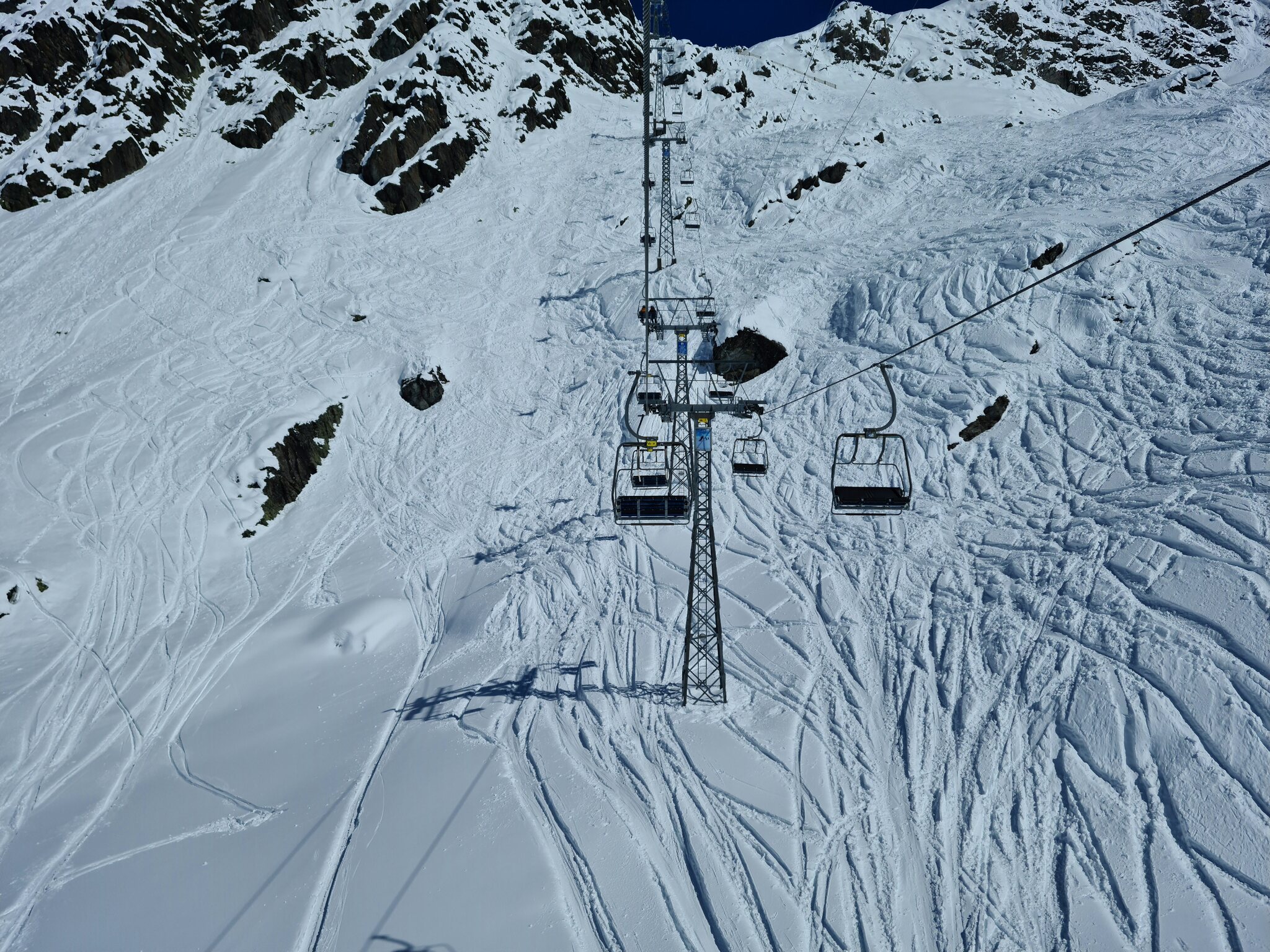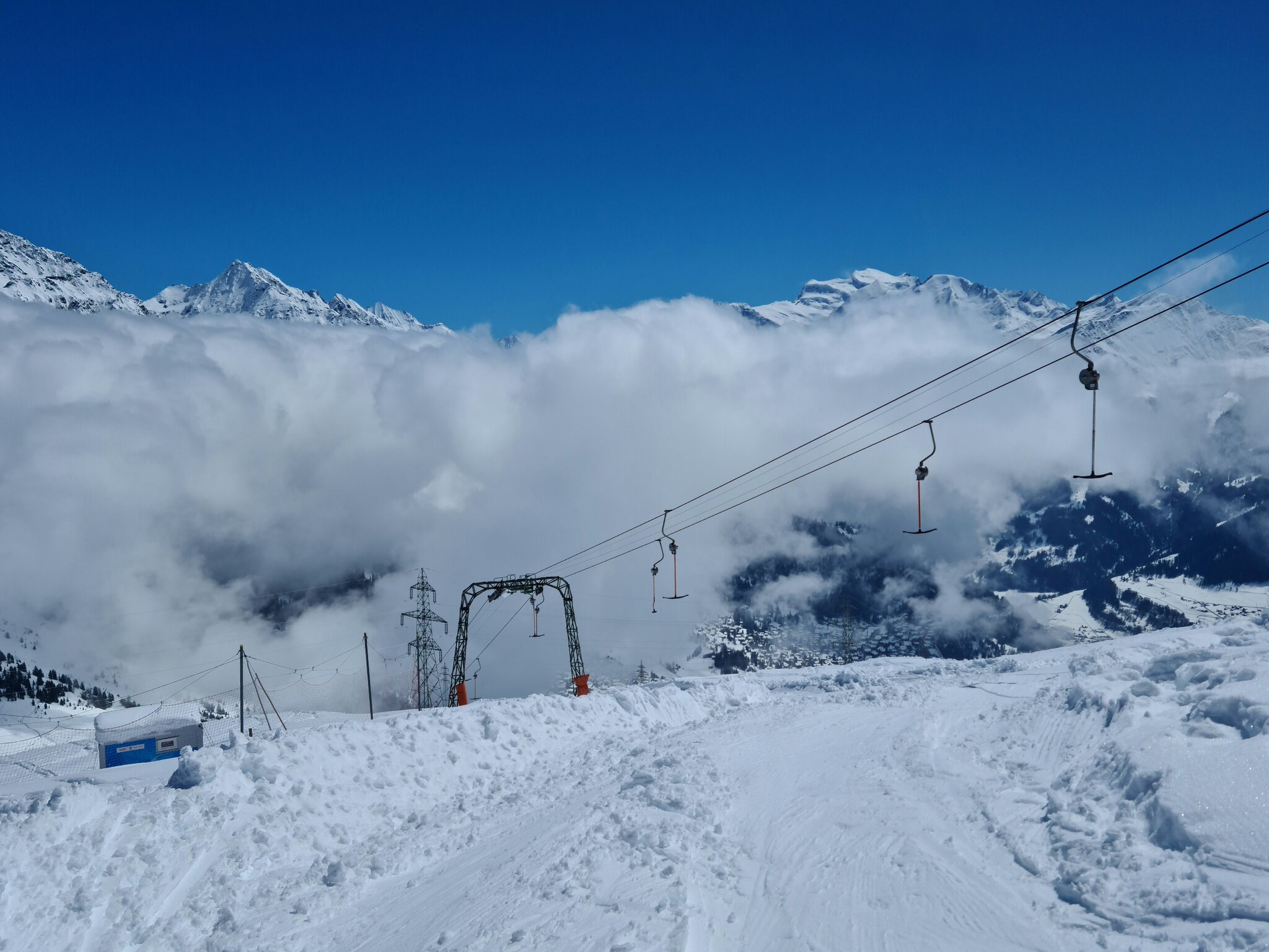 #11- Oben ist dann wieder blauer Himmel. Bei den Stützen fällt auf, dass sie vom Aufbau her jenen der Kabinenbahn Savoleyres gleichen. Das ist auch kein Wunder, stammen auch sie von Giovanola. Somit ist diese Bahn eine der seltenen Sesselbahnen mit Stützen von Giovanola, wenngleich heute mach einem Umbau ein großer Teil der Bahn von Garaventa aus dem Jahre 1996 stammt.