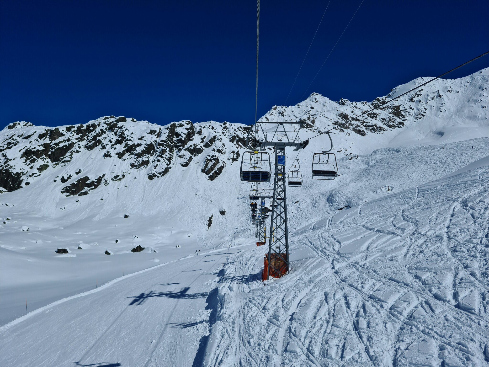#19- Die deutlich modernere Sesselbahn Savoleyres Nord. Allerdings ist hier auch etwas mehr los als auf der Südseite, wobei sich der Andrang noch im Rahmen hält.
