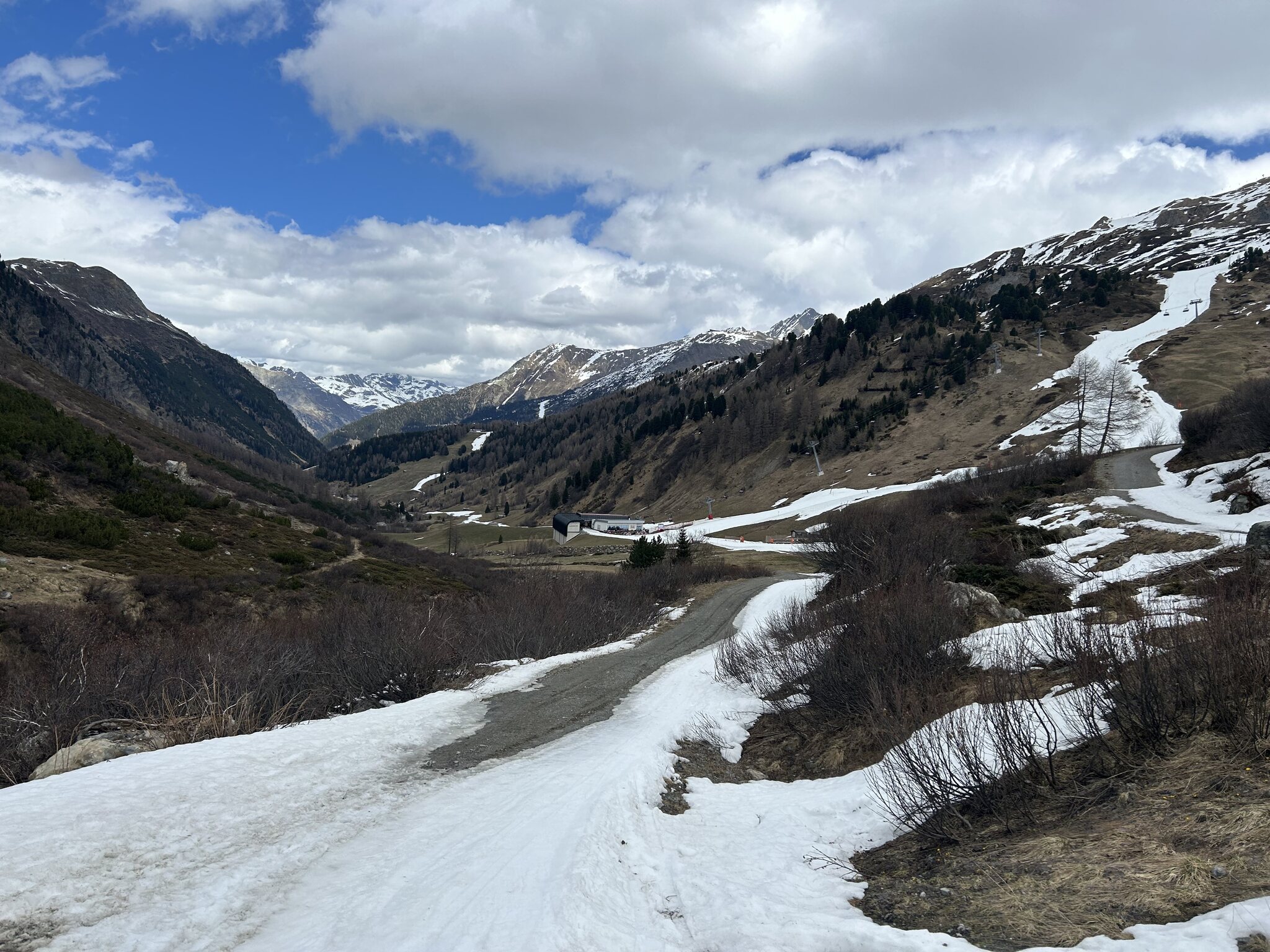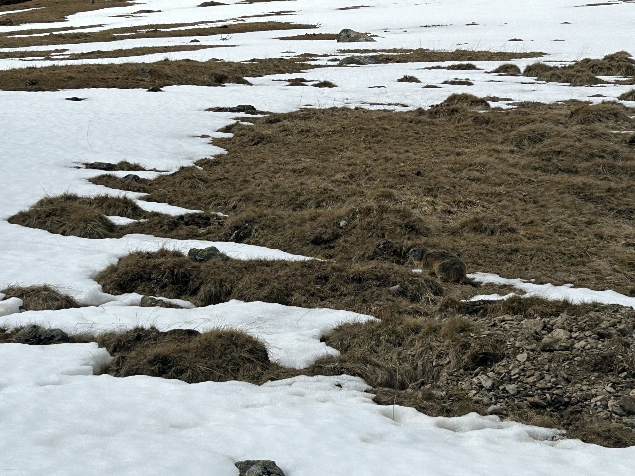 Der Weg zurück ins Skigebiet ist teilweise aper. Und Murmeltiere sind auch schon unterwegs