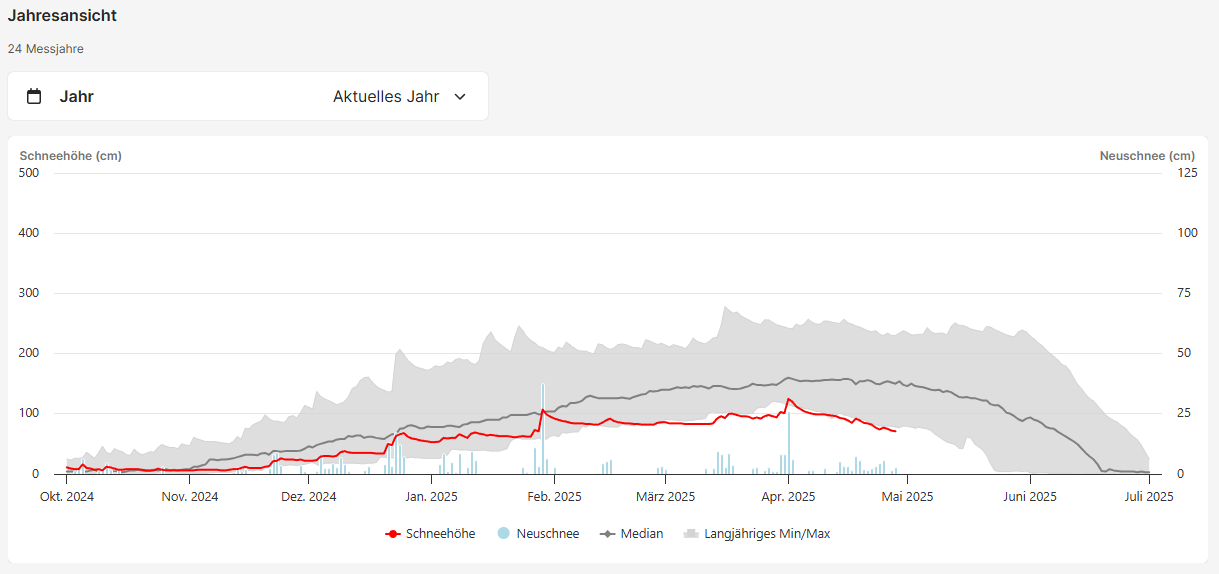 Hier mal ne SLF Station (Ravaischer Salaas): Das ist auf jeden Fall Rekord für die letzten 24 Jahre....Schneefuchs hat geschrieben: 27.04.2025, 18:10 Ich war schon oft um diese Zeit hier. Die Schneelage ist rekordverdächtig niedrig. Die Hauptachse vom Pardatschgrat zum Alp-Trida-Sattel wird schon halten, ebenso Höllkar und Palinkopf, Greitspitz nur die 70 und 13. Auf alle anderen Pisten würde ich für den 04. Mai nicht wetten.