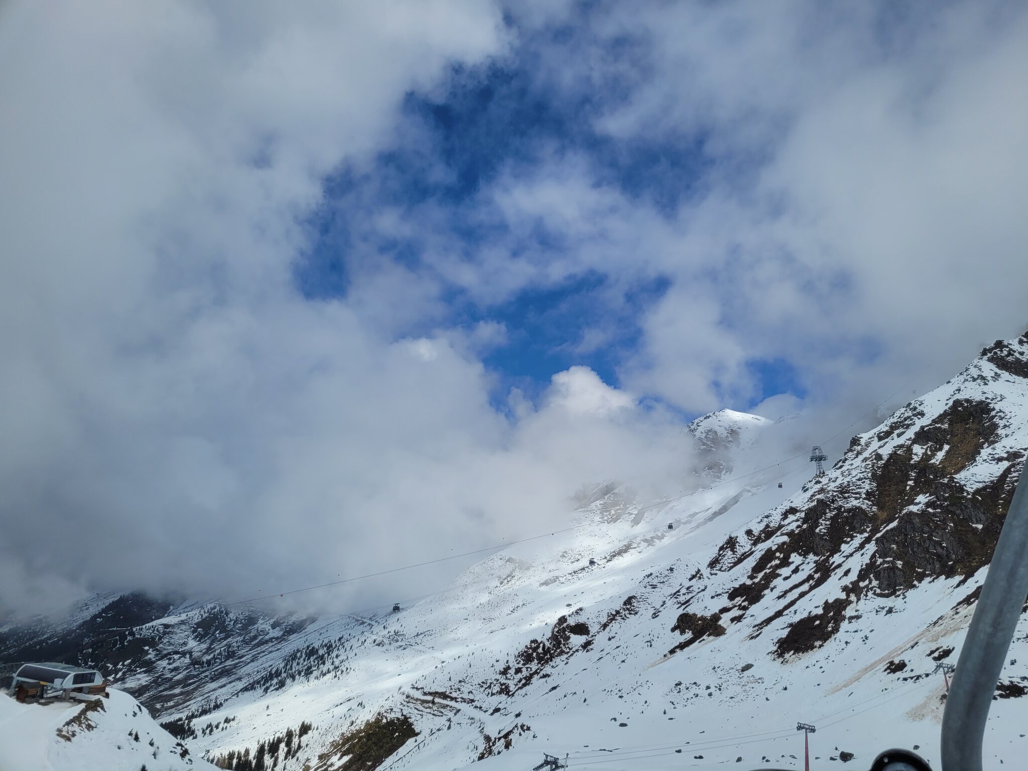 Wetter scheint durchwachsen, in den umliegenden Bergen hängen einige Wolken, das Skigebiet jedoch (noch) nicht.