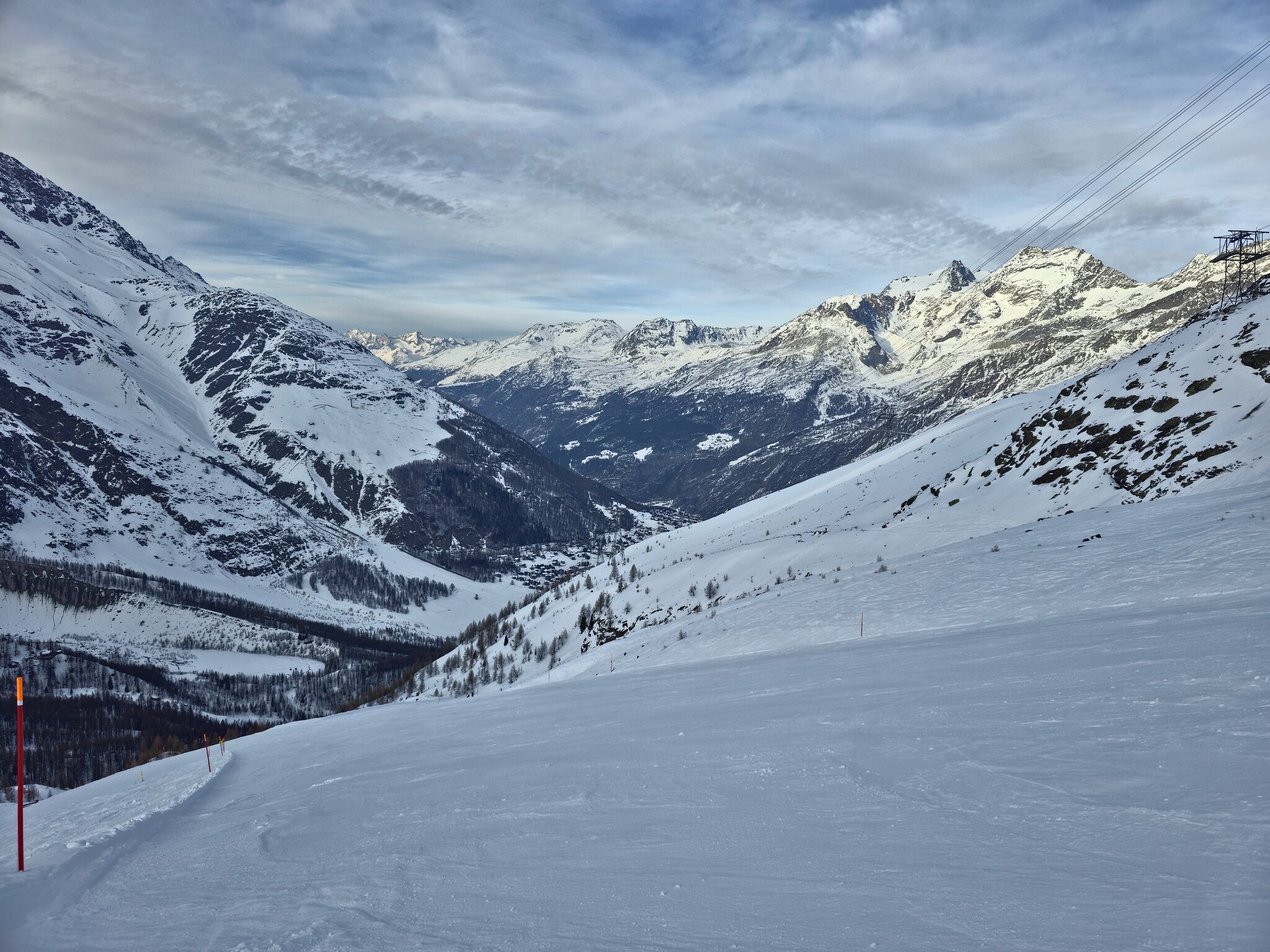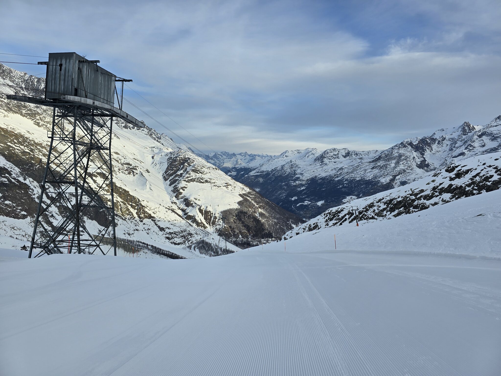 Heute ist es bewölkt. Oberhalb Morenia schneit es. Die Bodensicht ist darunter aber OK. Die Talabfahrt ab Morenia ist ein Traum, Plattjen ist entgegen den Anzeigen leider noch geschlossen.