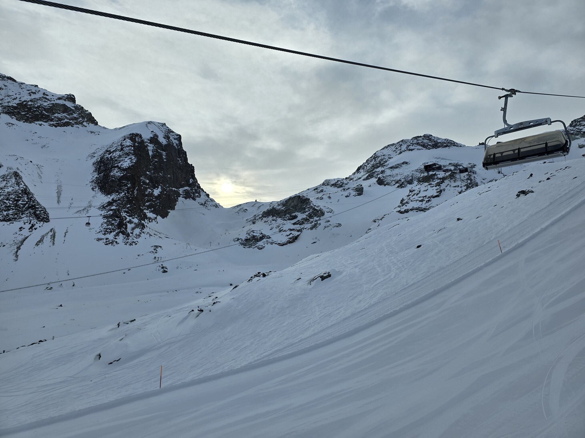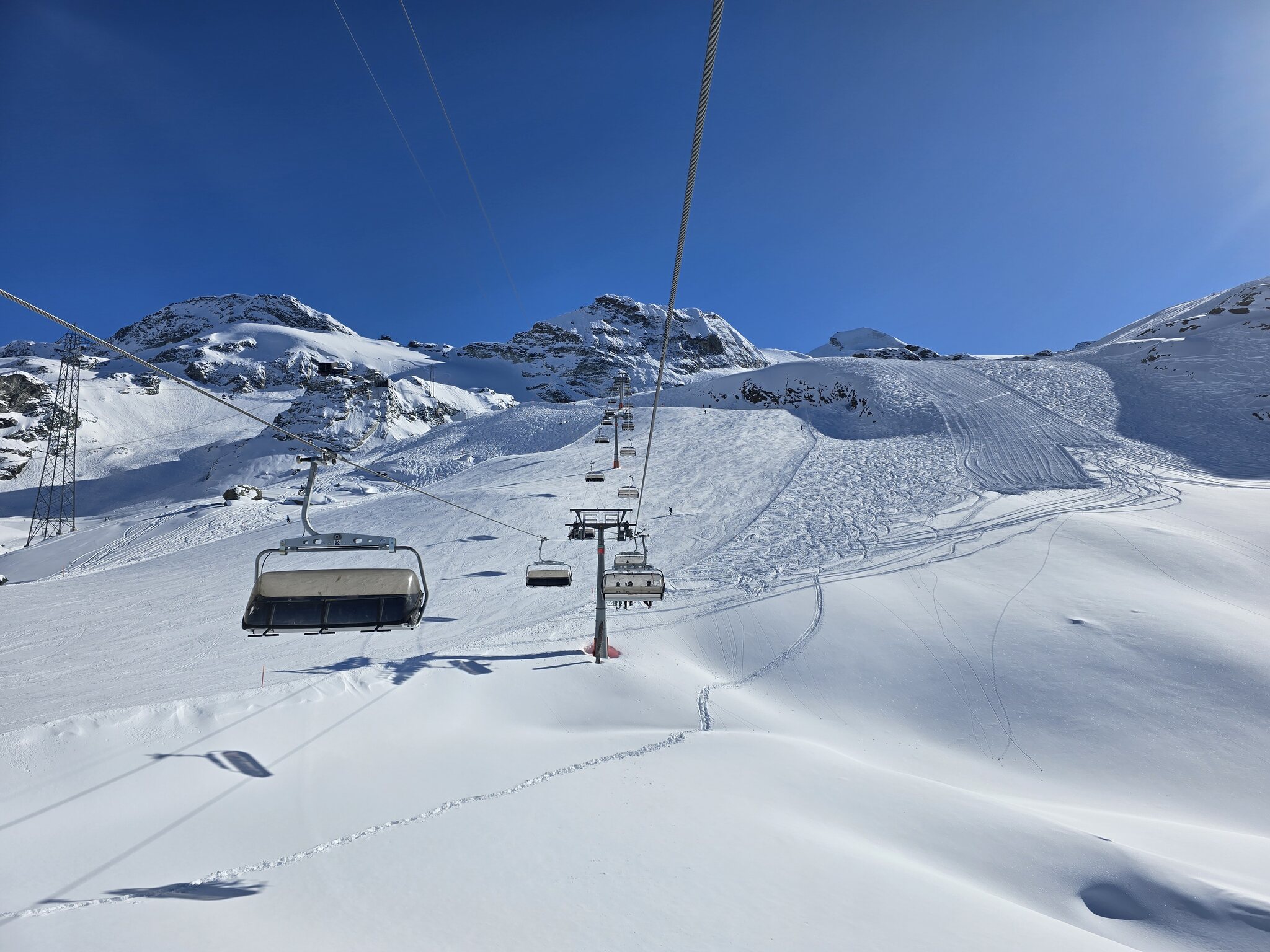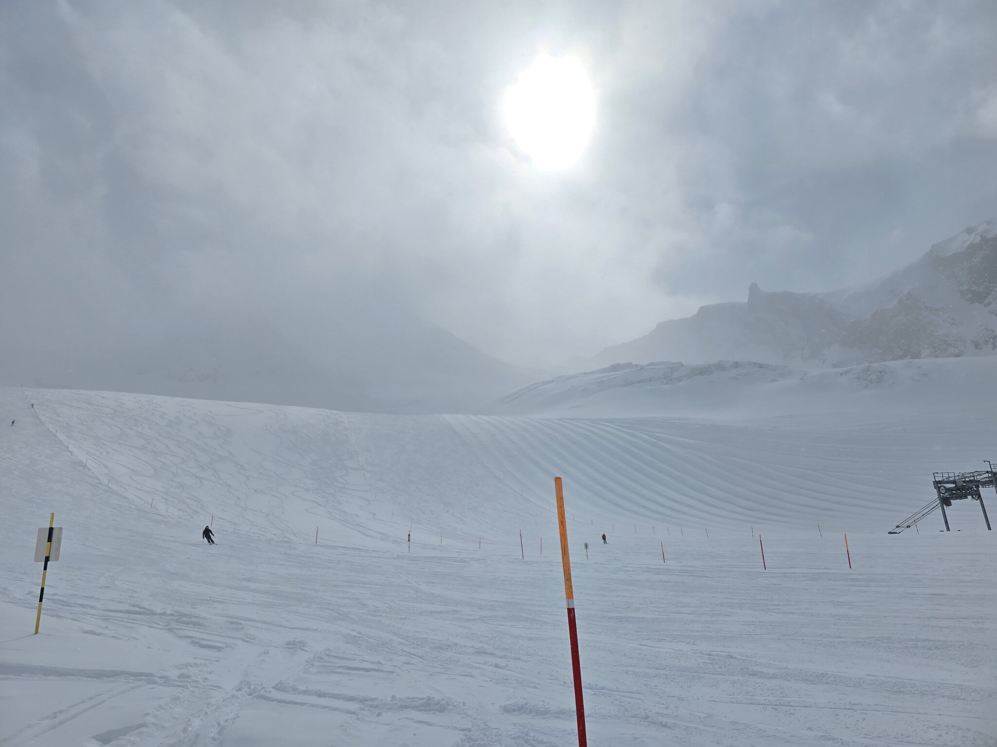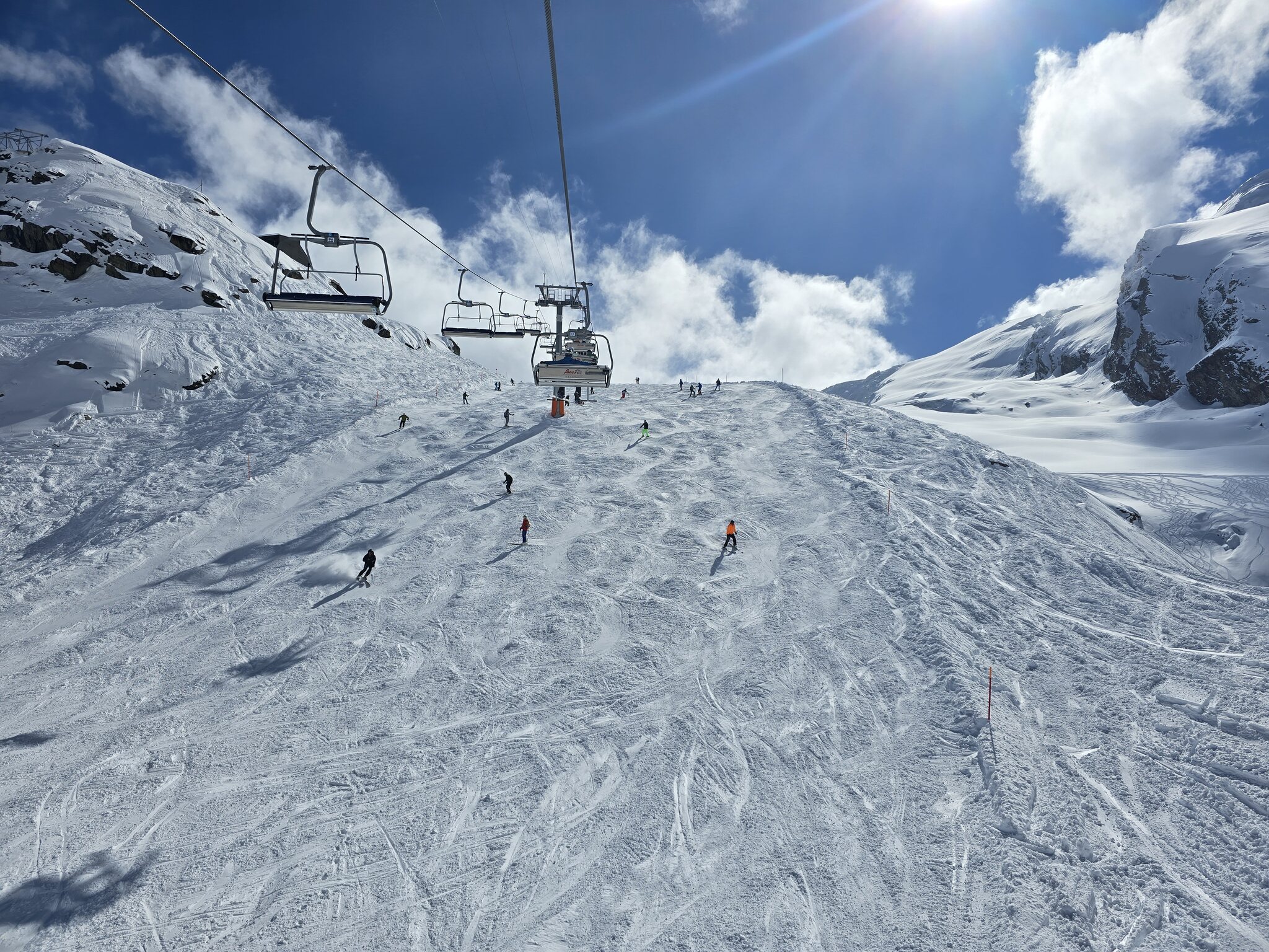 Ebenfalls zu lange Warteschlangen am Gletscher. Der obere Doppelschlepper ist zu, der untere hat nur einen Lift geöffnet. Keine Ahnung, warum bei dem Andrang