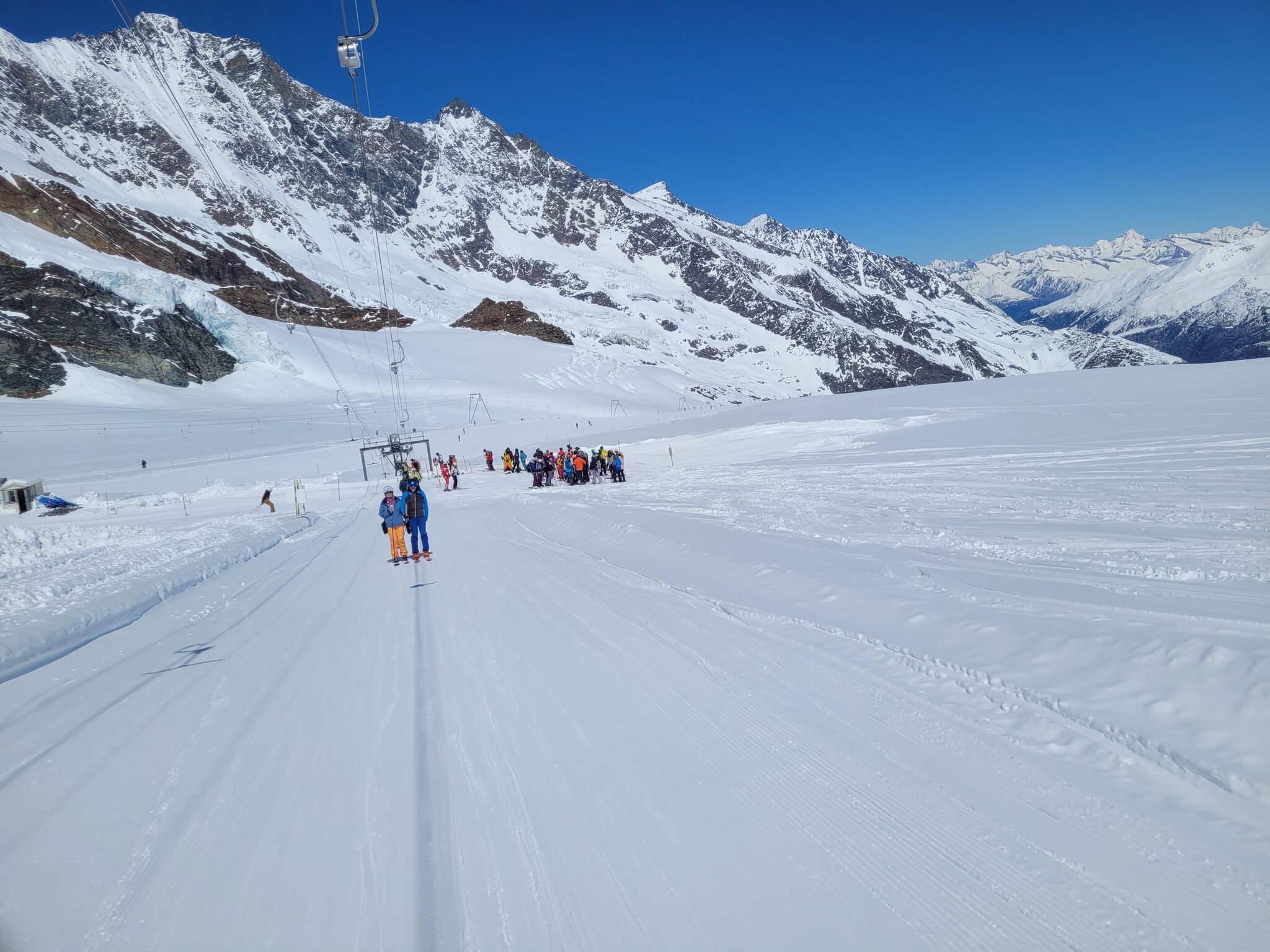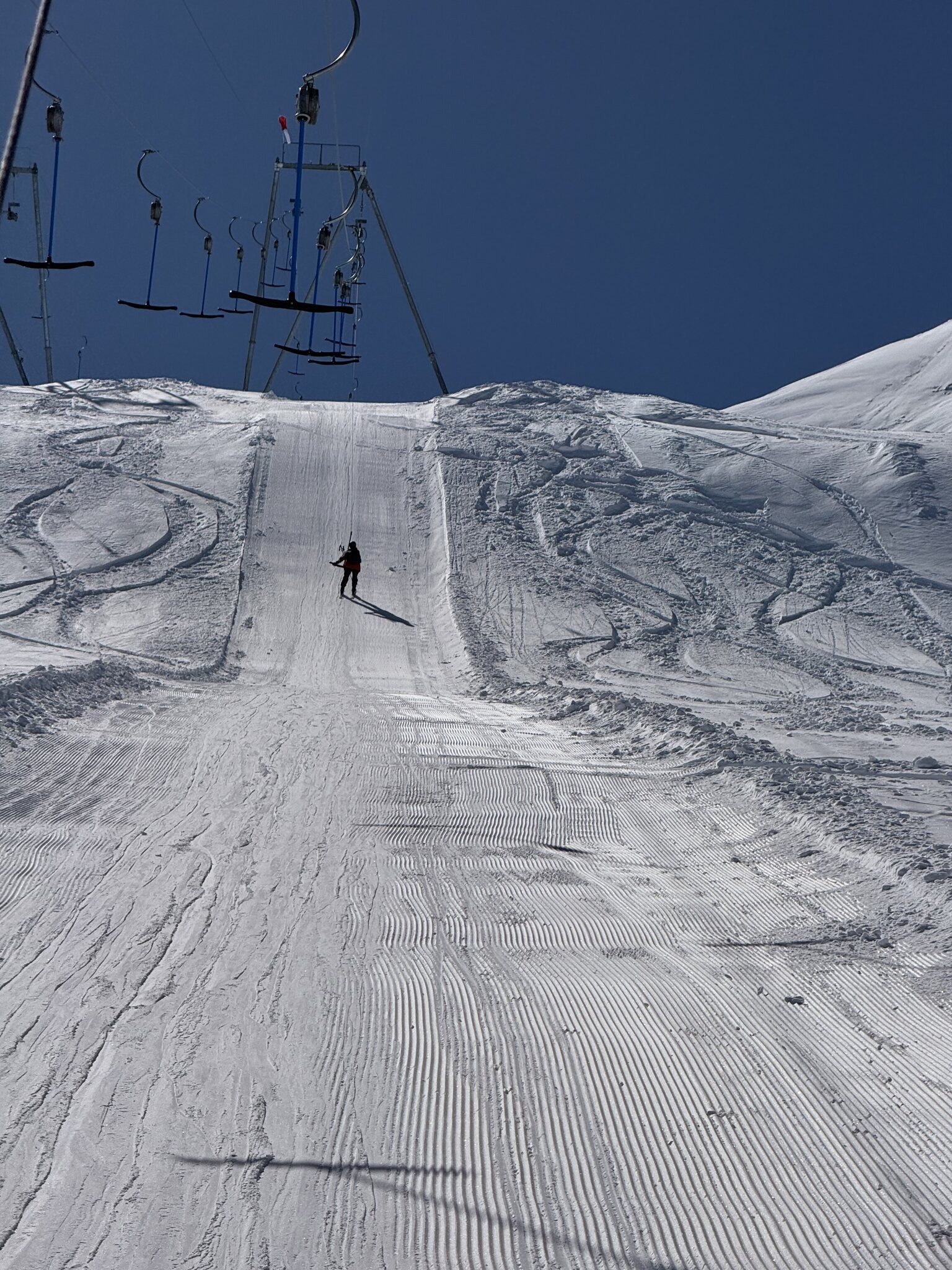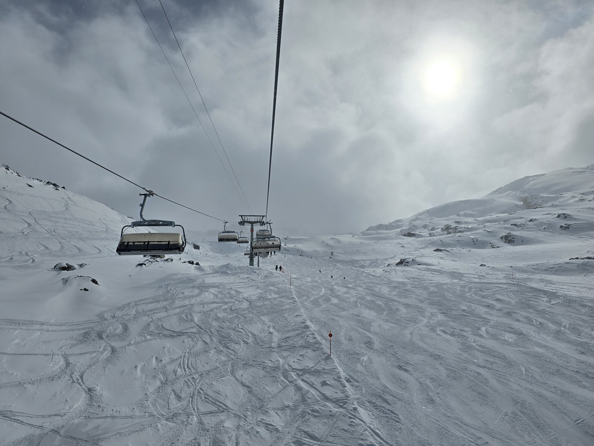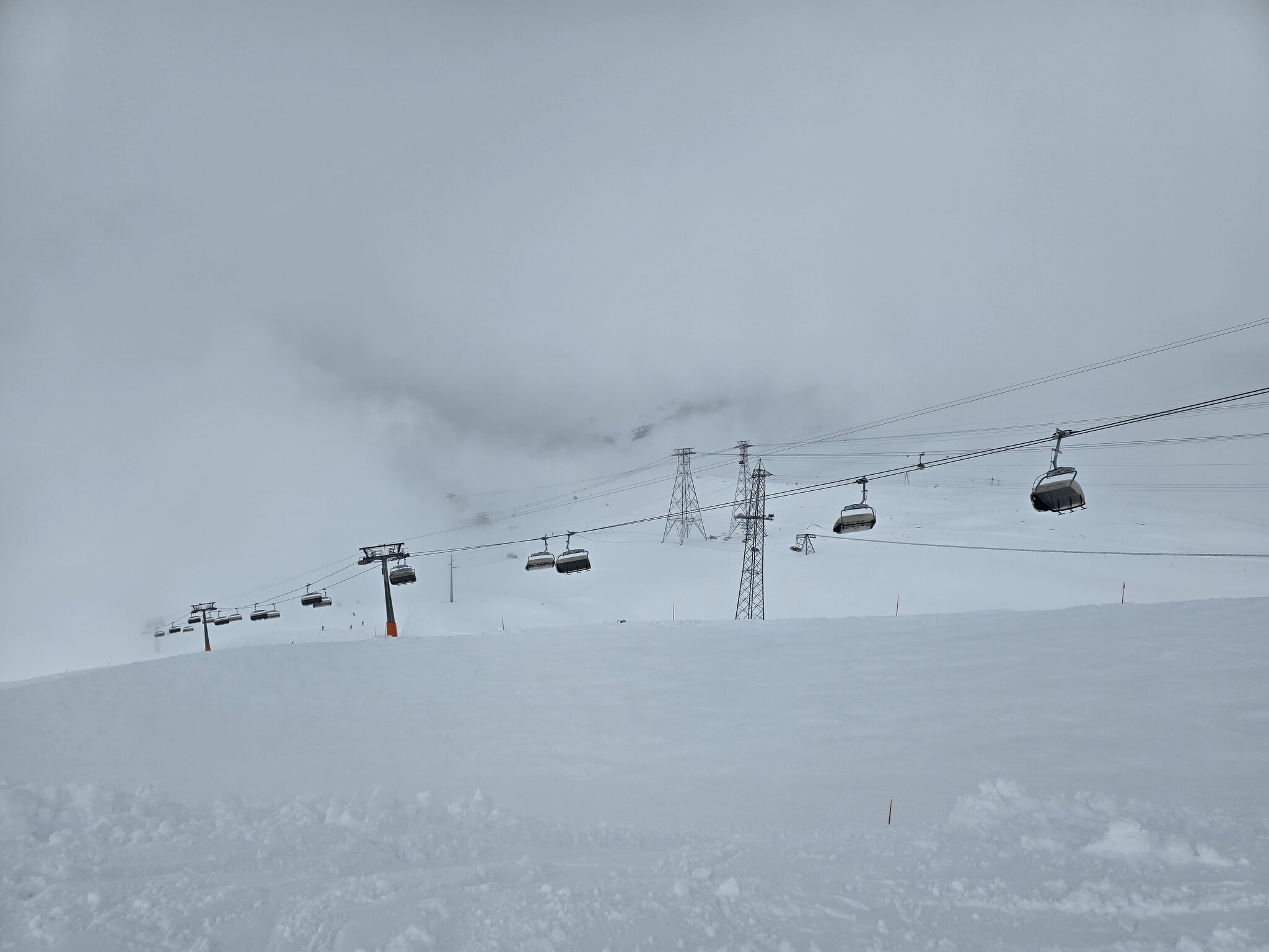 Ebenfalls zu lange Warteschlangen am Gletscher. Der obere Doppelschlepper ist zu, der untere hat nur einen Lift geöffnet. Keine Ahnung, warum bei dem Andrang