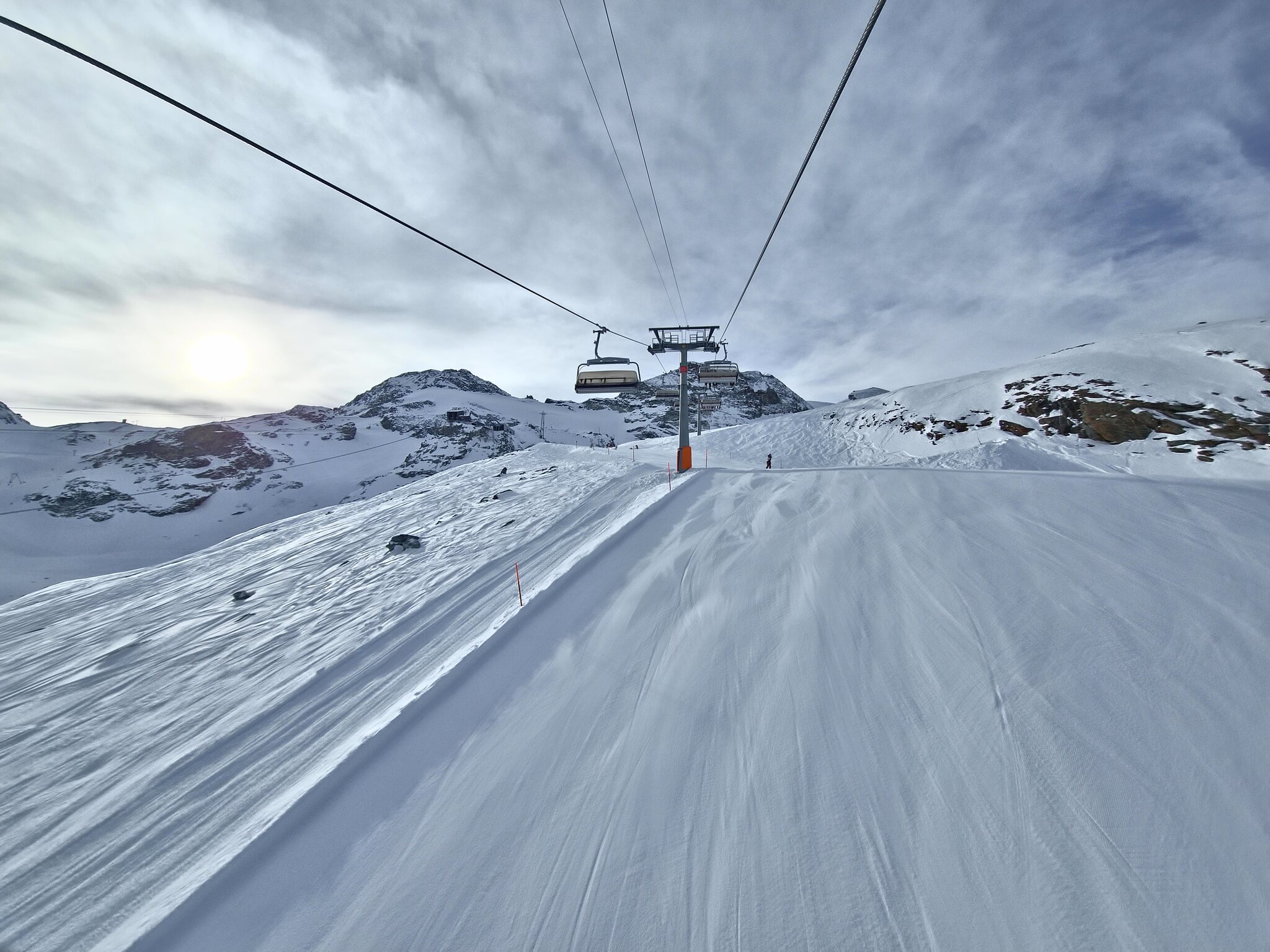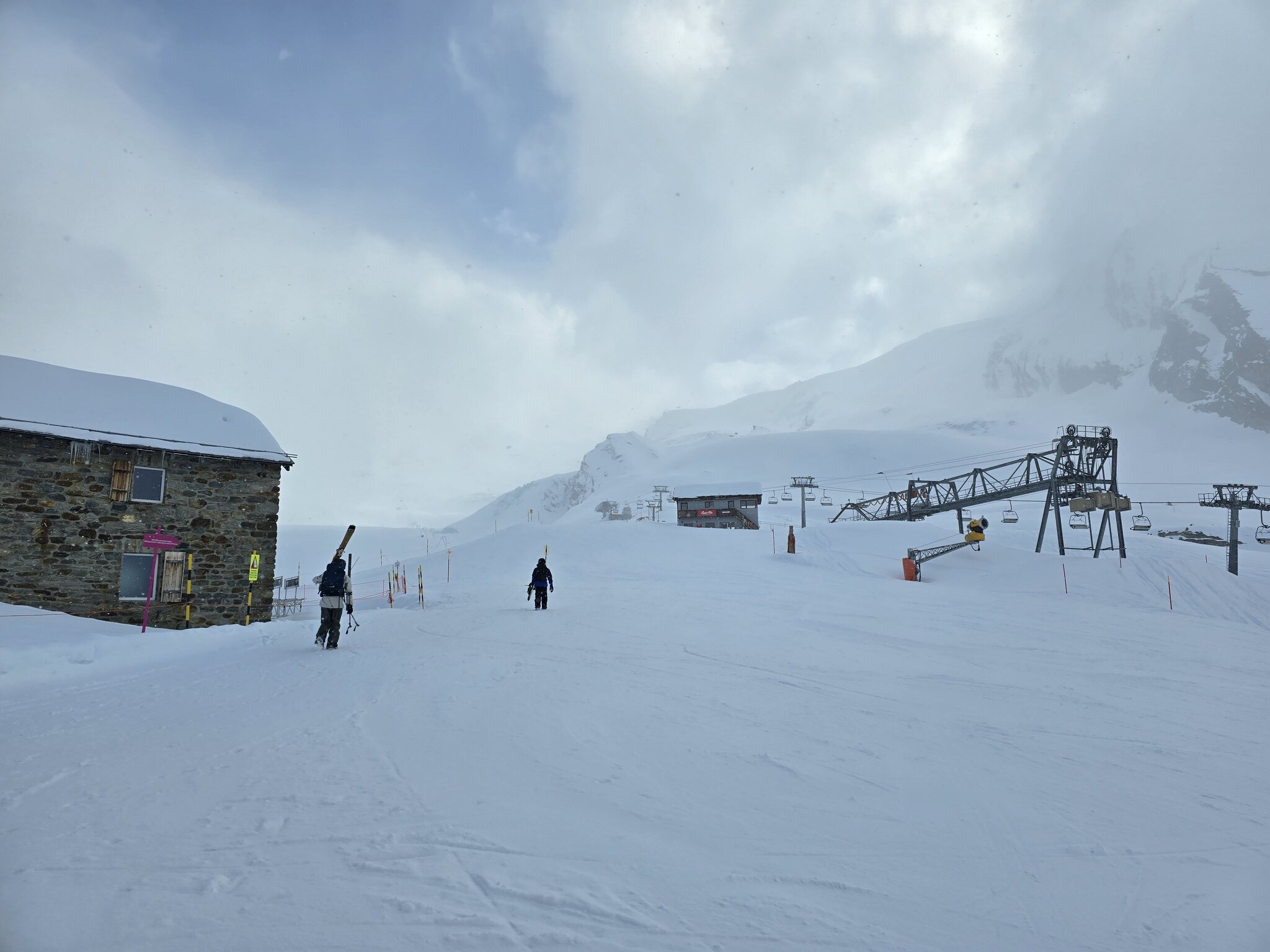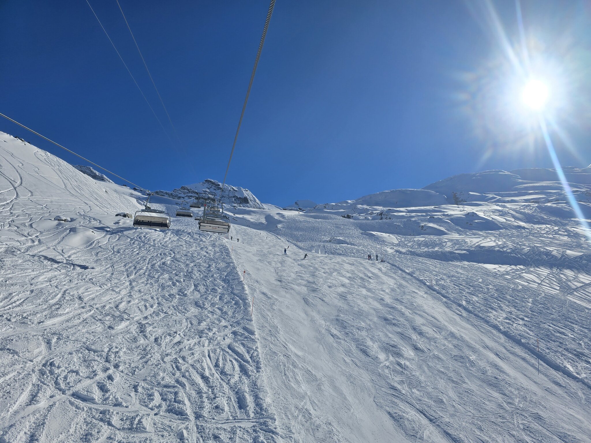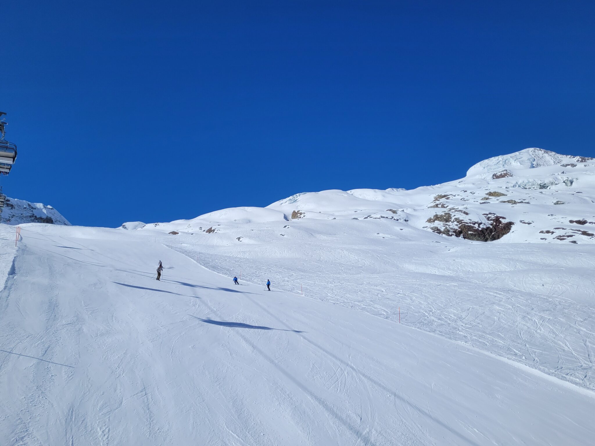 Ebenfalls zu lange Warteschlangen am Gletscher. Der obere Doppelschlepper ist zu, der untere hat nur einen Lift geöffnet. Keine Ahnung, warum bei dem Andrang
