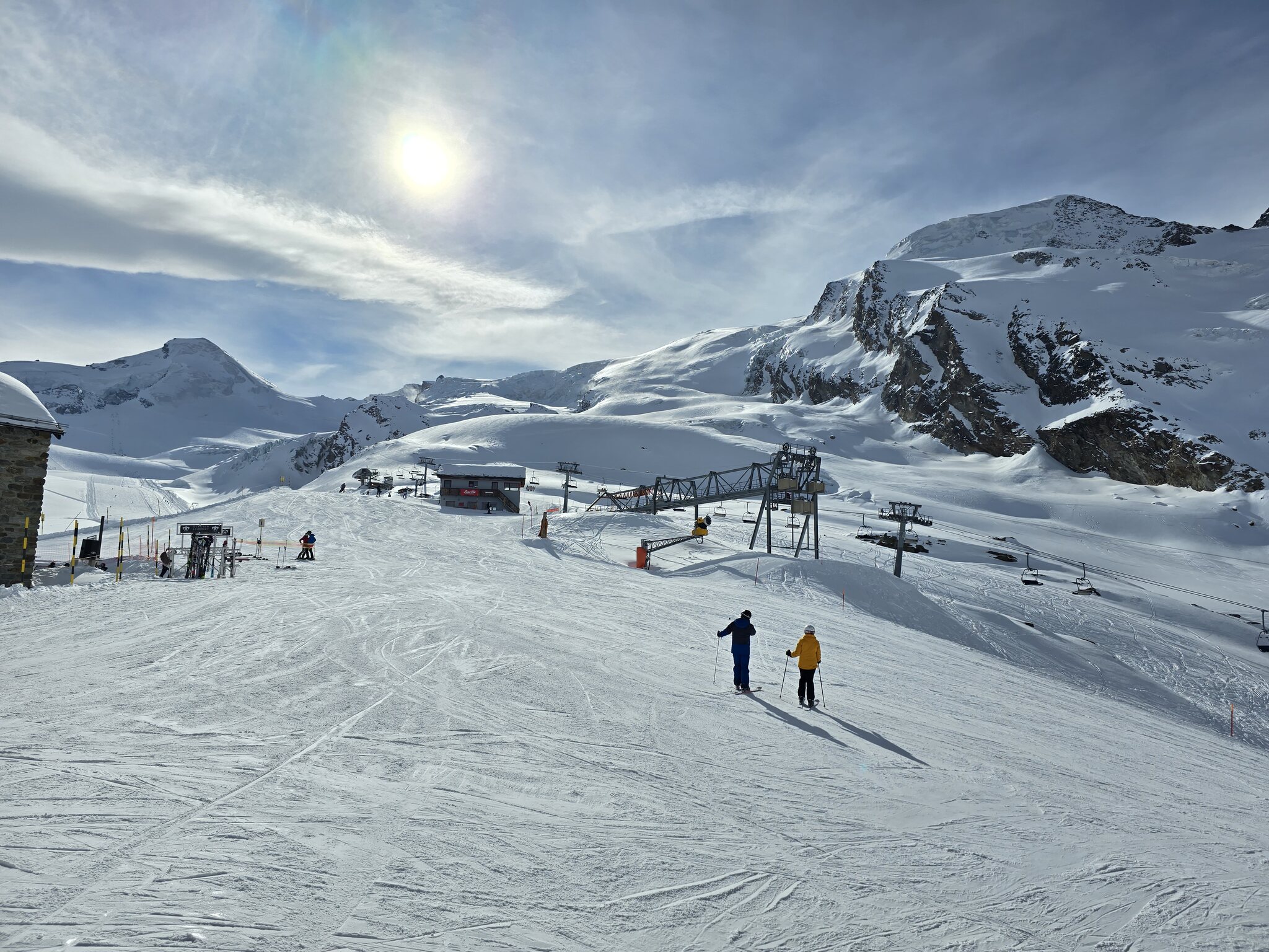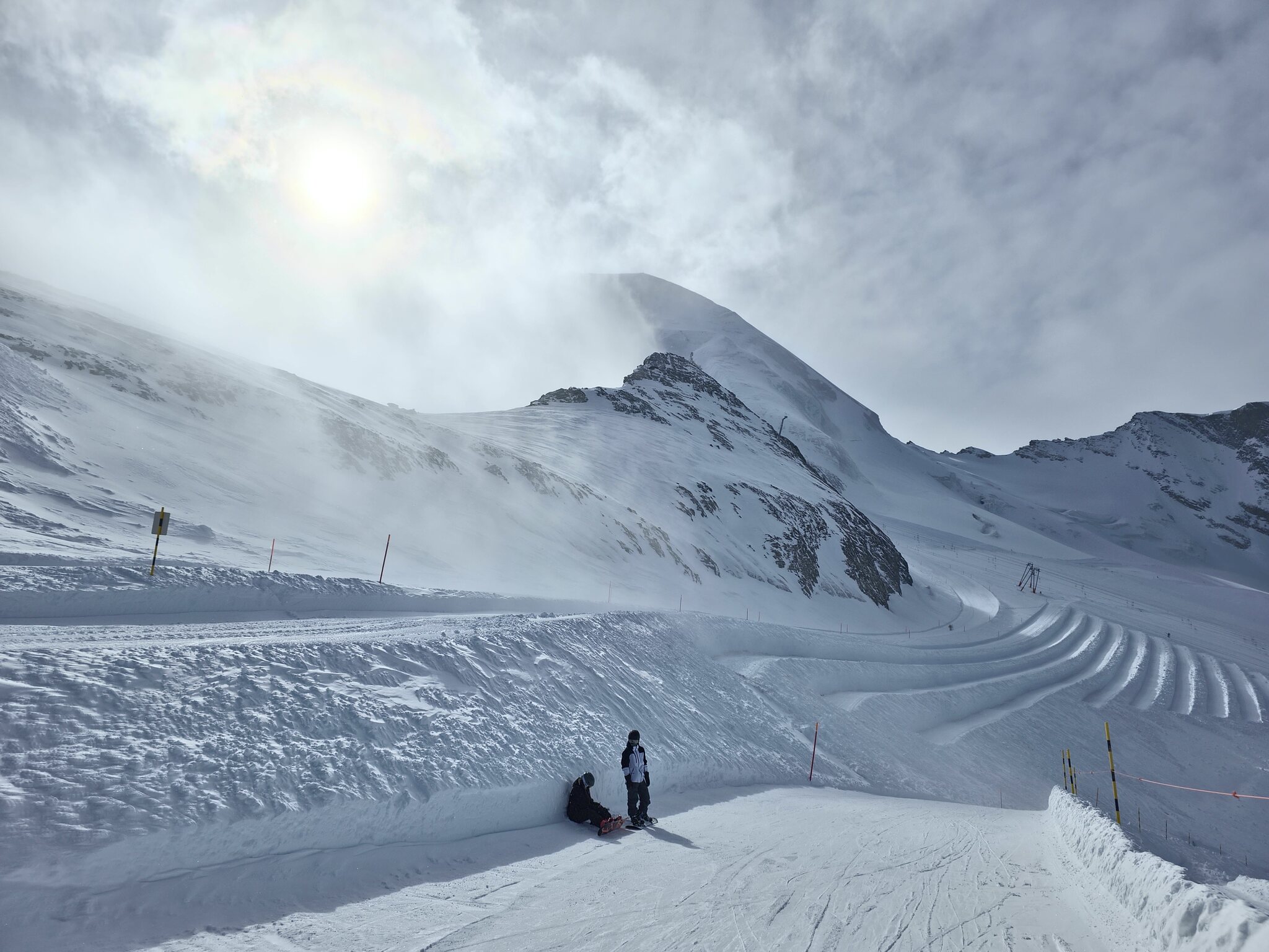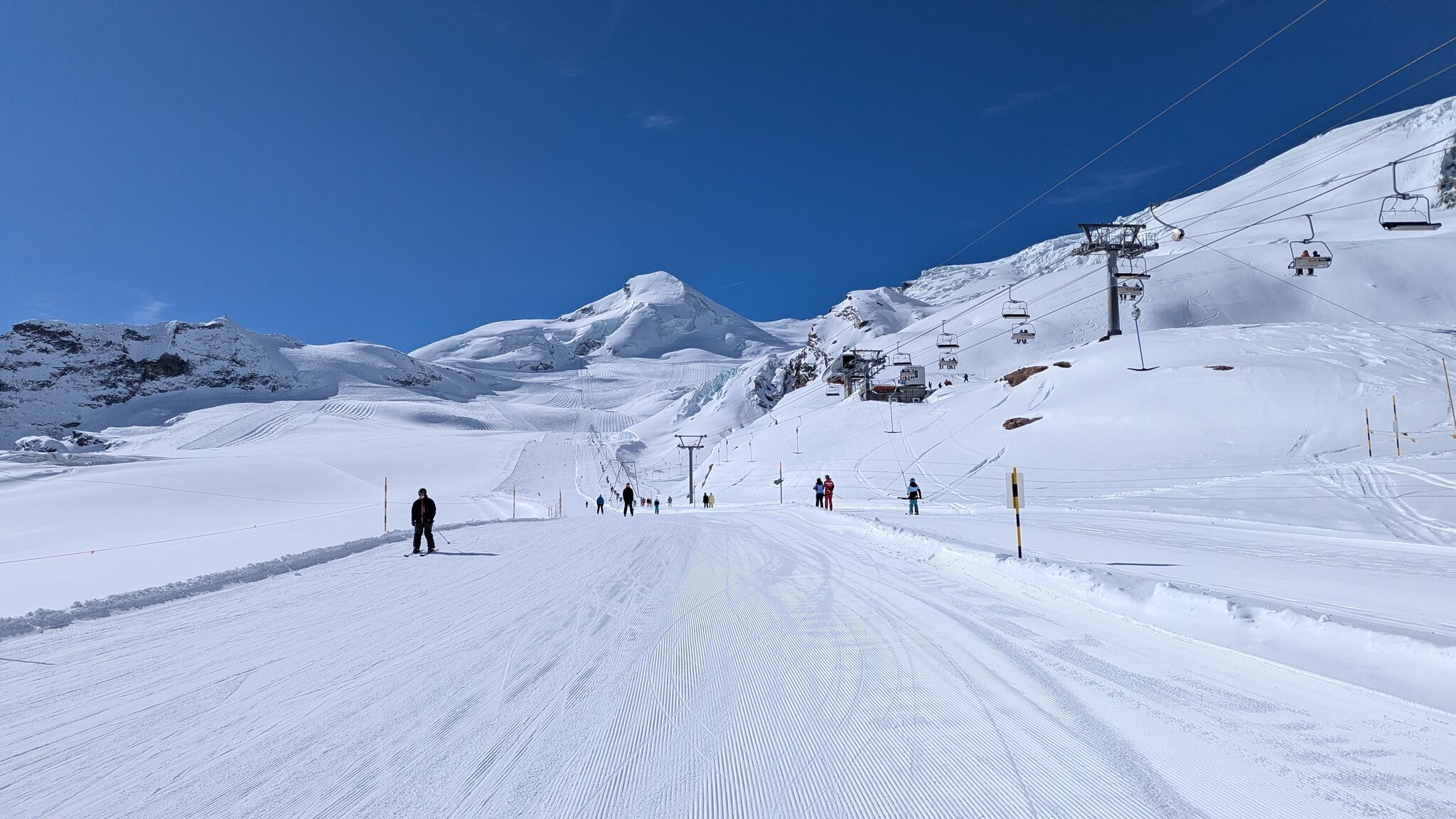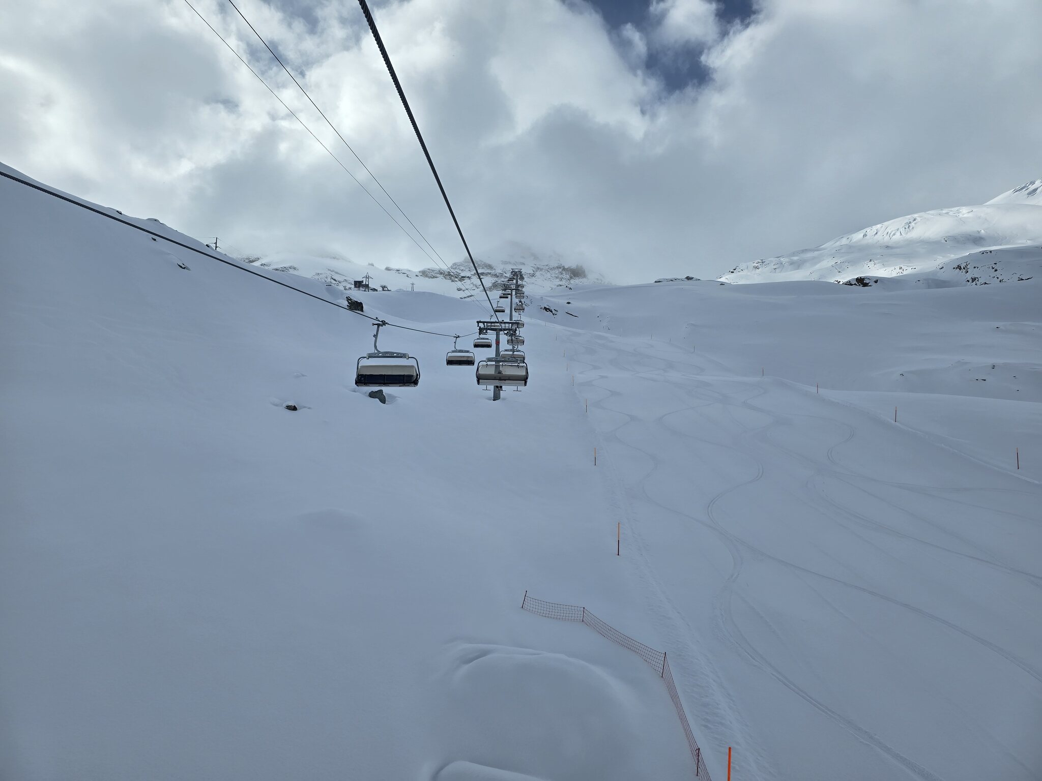 Ebenfalls zu lange Warteschlangen am Gletscher. Der obere Doppelschlepper ist zu, der untere hat nur einen Lift geöffnet. Keine Ahnung, warum bei dem Andrang