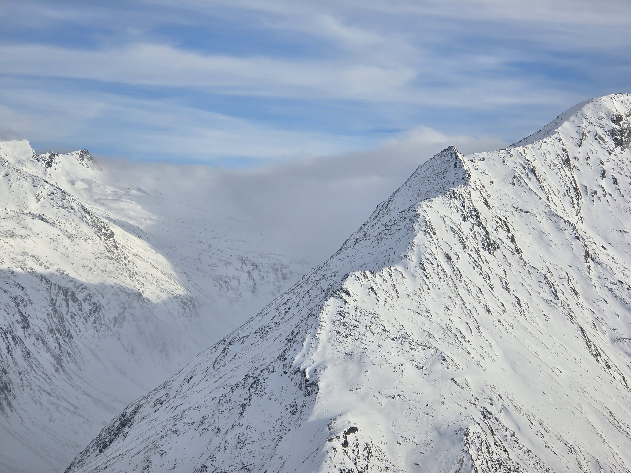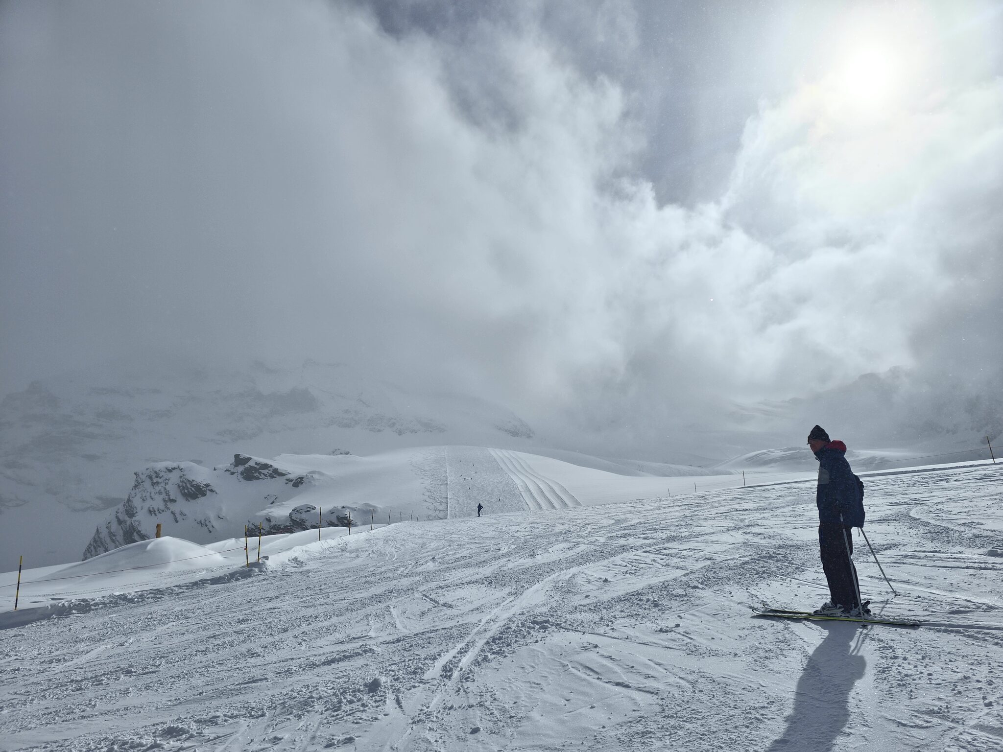 Bei der letzten Fahrt am Plattjen sind wir noch einige Meter bis auf den Berggrat gegangen. Von dort liessen sich die Wolken beobachten, welche von Süden über den Antronapass ins Furggtal drücken:
