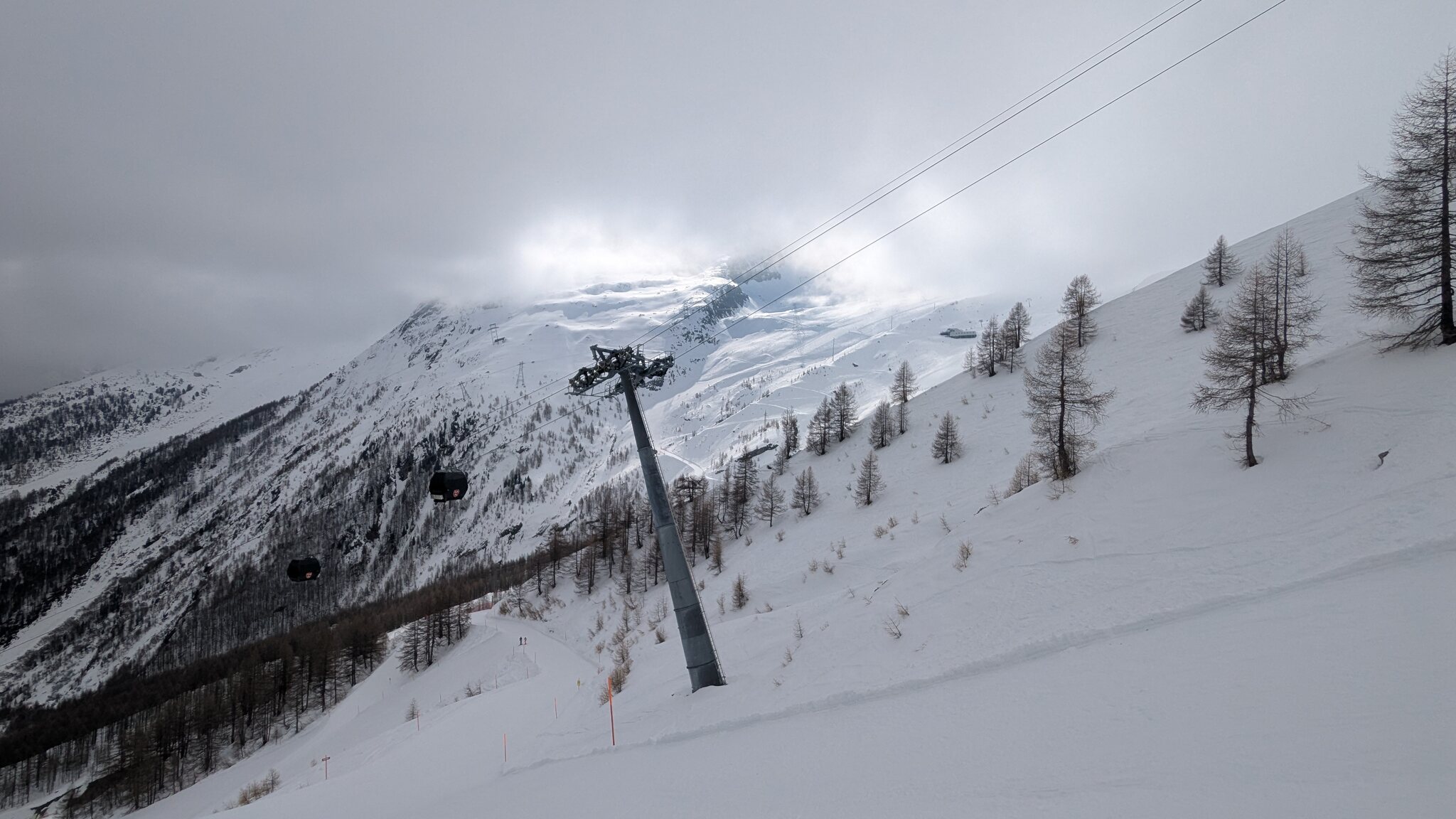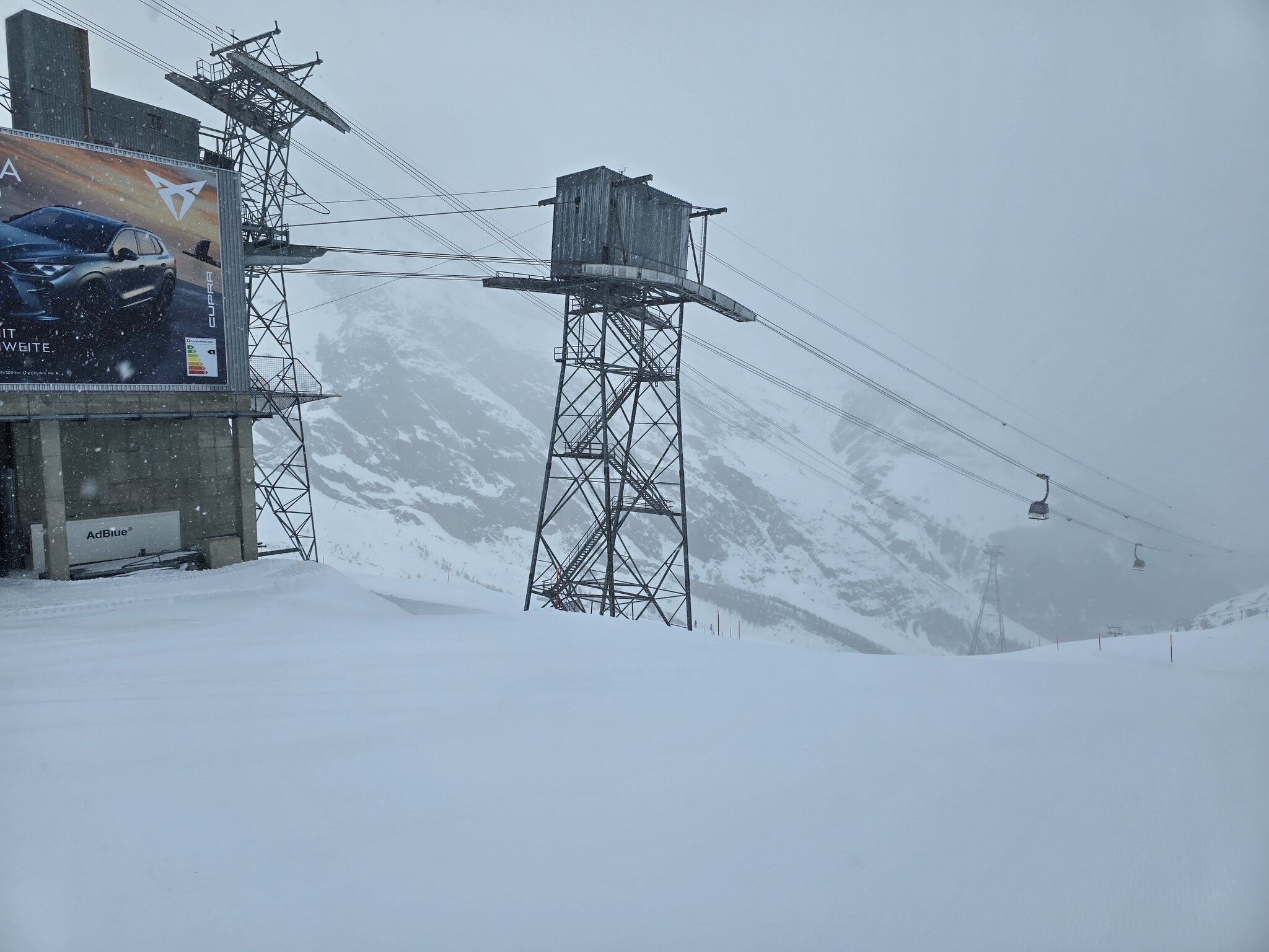 Nach einer Abfahrt Längfluh - Saas-Fee ist Schluss. Es sei zu windig. Machte zwar 30 Minuten vorher in der Bahn nicht unbedingt den Eindruck, aber dann gibt es halt etwas Skigebietshopping. Nächster Halt: Saas-Almagell. Immerhin fahren die Busse im 15-Minuten-Takt.