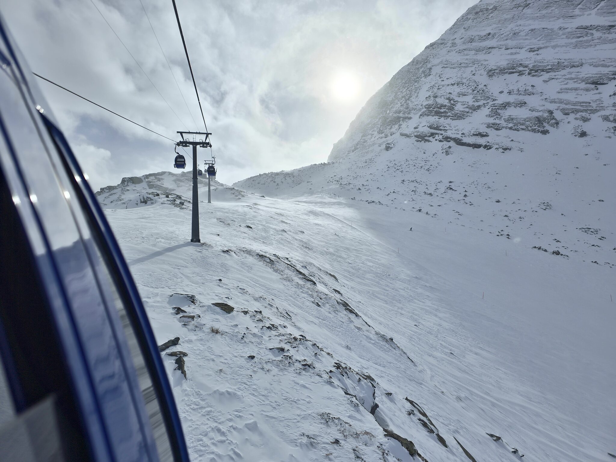 Leider sind wir nicht die einzigen, die das bessere Wetter am Längfluh bemerkt haben. So sind die Pisten relativ voll. Deshalb belassen wir es einer Fahrt und wechseln an den Plattjen, der mittlerweise offen ist. Während es auf dem Längfluh windstill ist, schaukeln hier die Gondeln ordentlich im starken Föhn. Mal sehen wir lange die Gondelbahn durchhält.