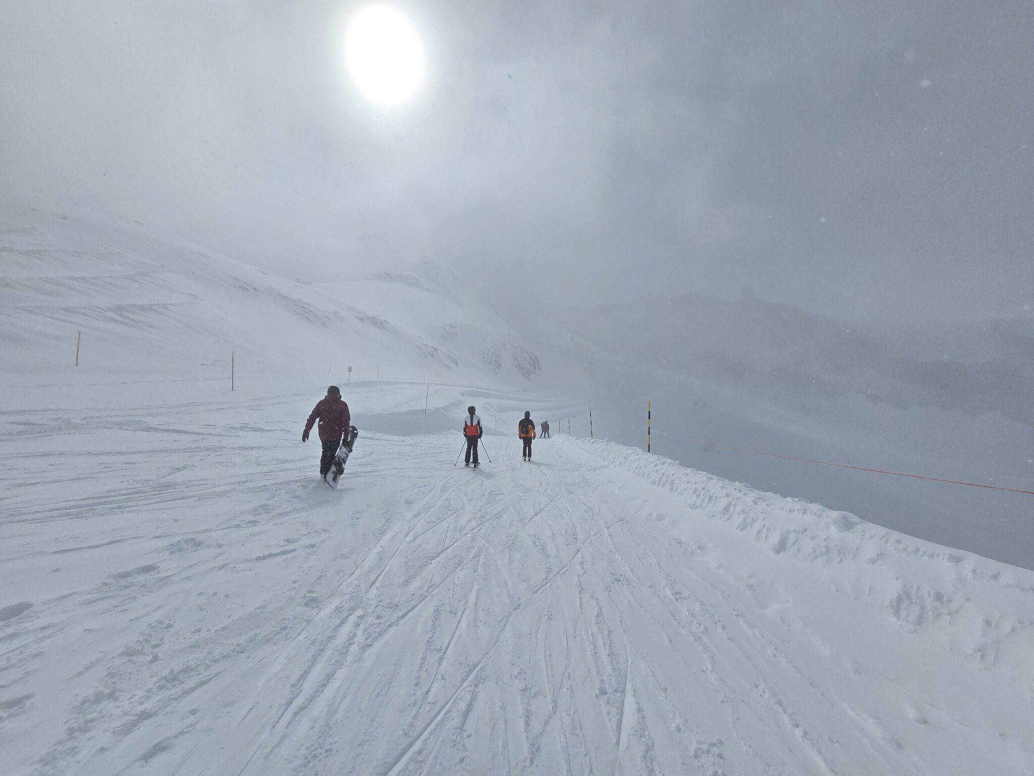 Die Piste am Plattjen ist super gut, die Bodensicht variiert von Fahrt zu Fahrt. Das Wetter wird immer besser, der Wind nimmt aber zu.