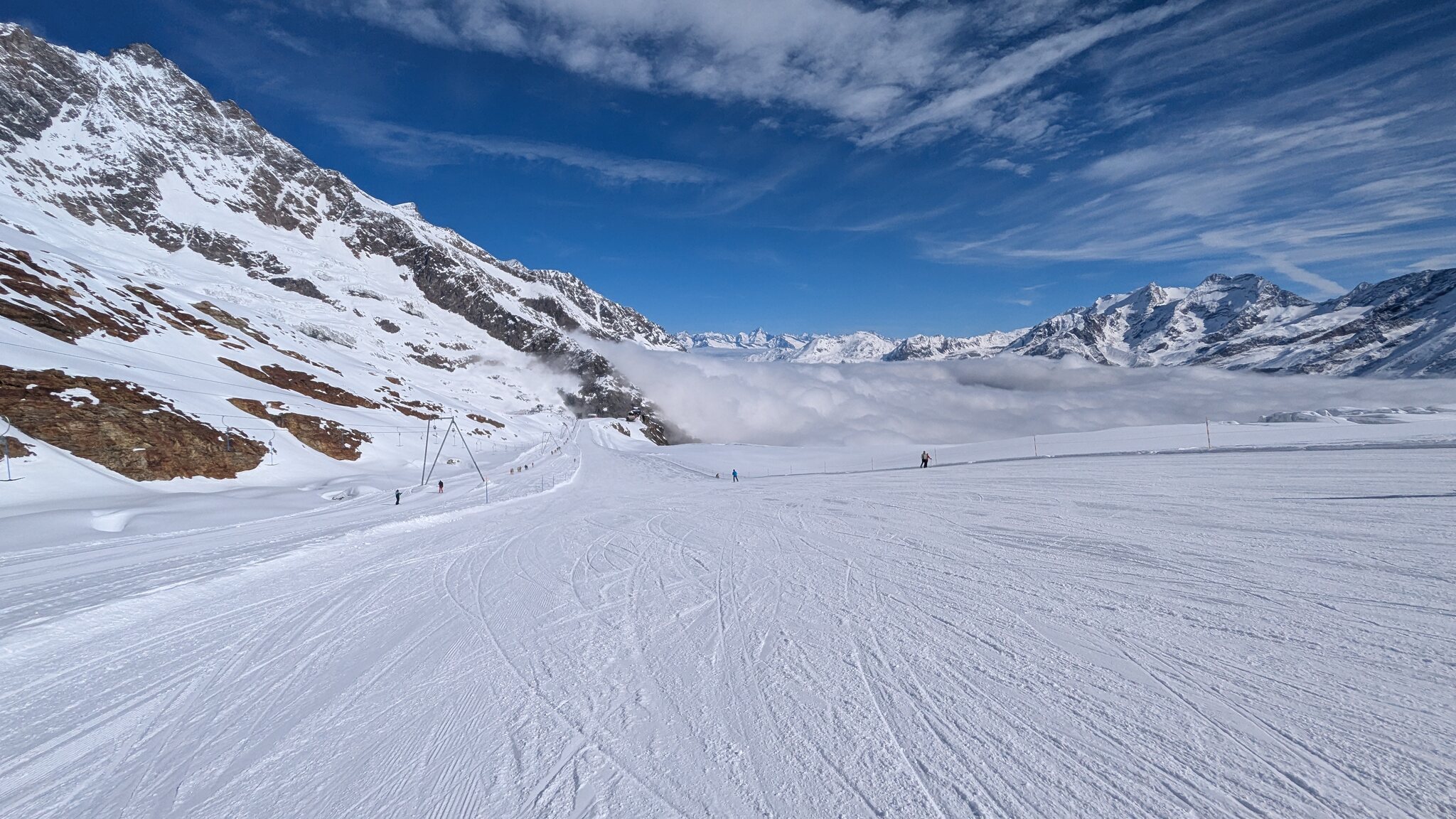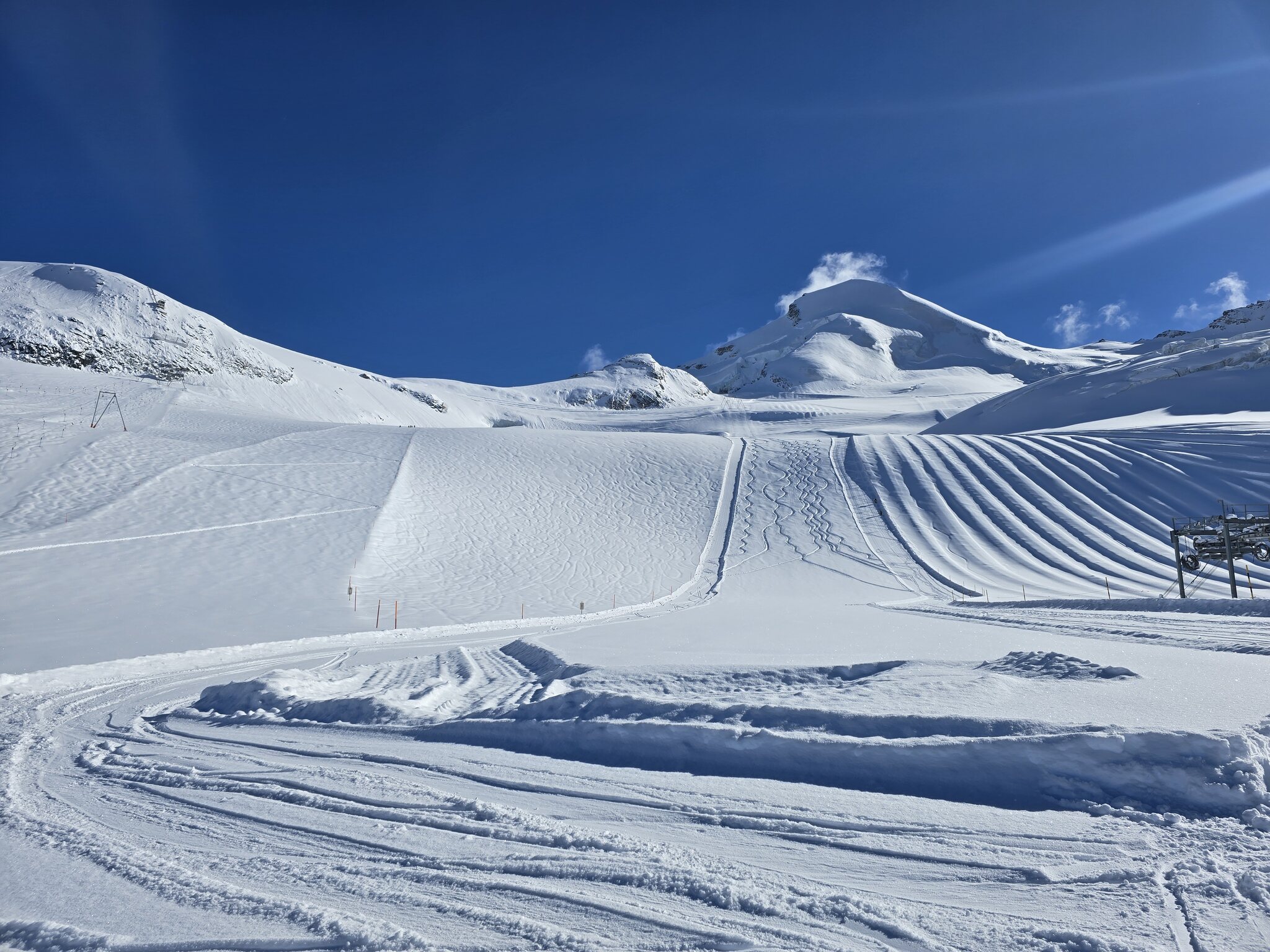 Heute haben wir am morgen die frisch präparierten Pisten auf dem Gletscher genossen. Danach sind wir weiter Richtung Morenia & Egginerjoch. Die Pisten werden allmählich etwas härter und sind heute teilweise etwas knollig. Dennoch sind die Pisten grösstenteils immer noch gut zu fahren.