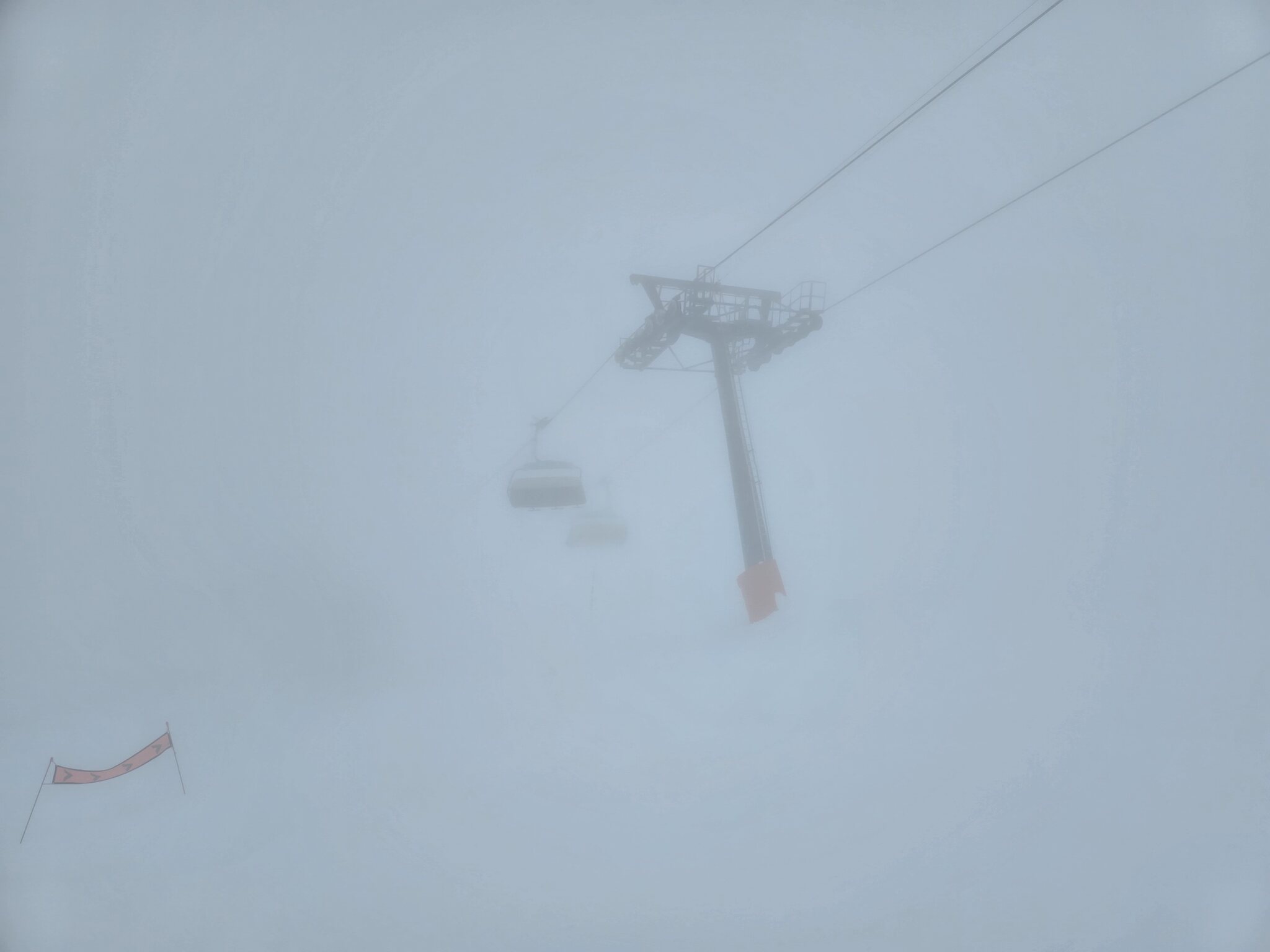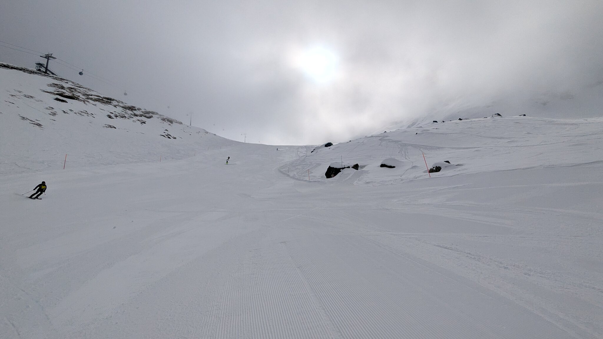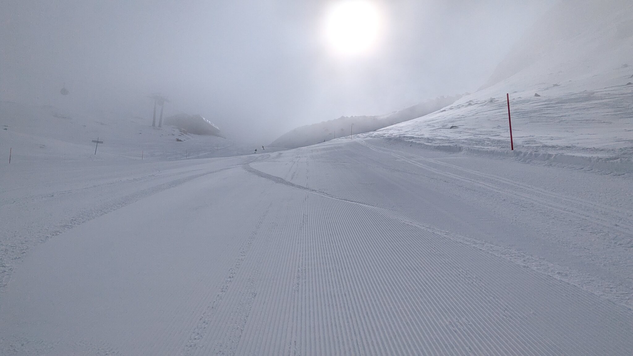 In Kombination mit der ohnehin schattigen Lage der Pisten am Morgen ist die Bodensicht eingeschränkt. Auf den frisch präparierten Pisten ist das aber nicht weiter tragisch. Mal sehen, wie sich das im Verlauf des Tages entwickelt.