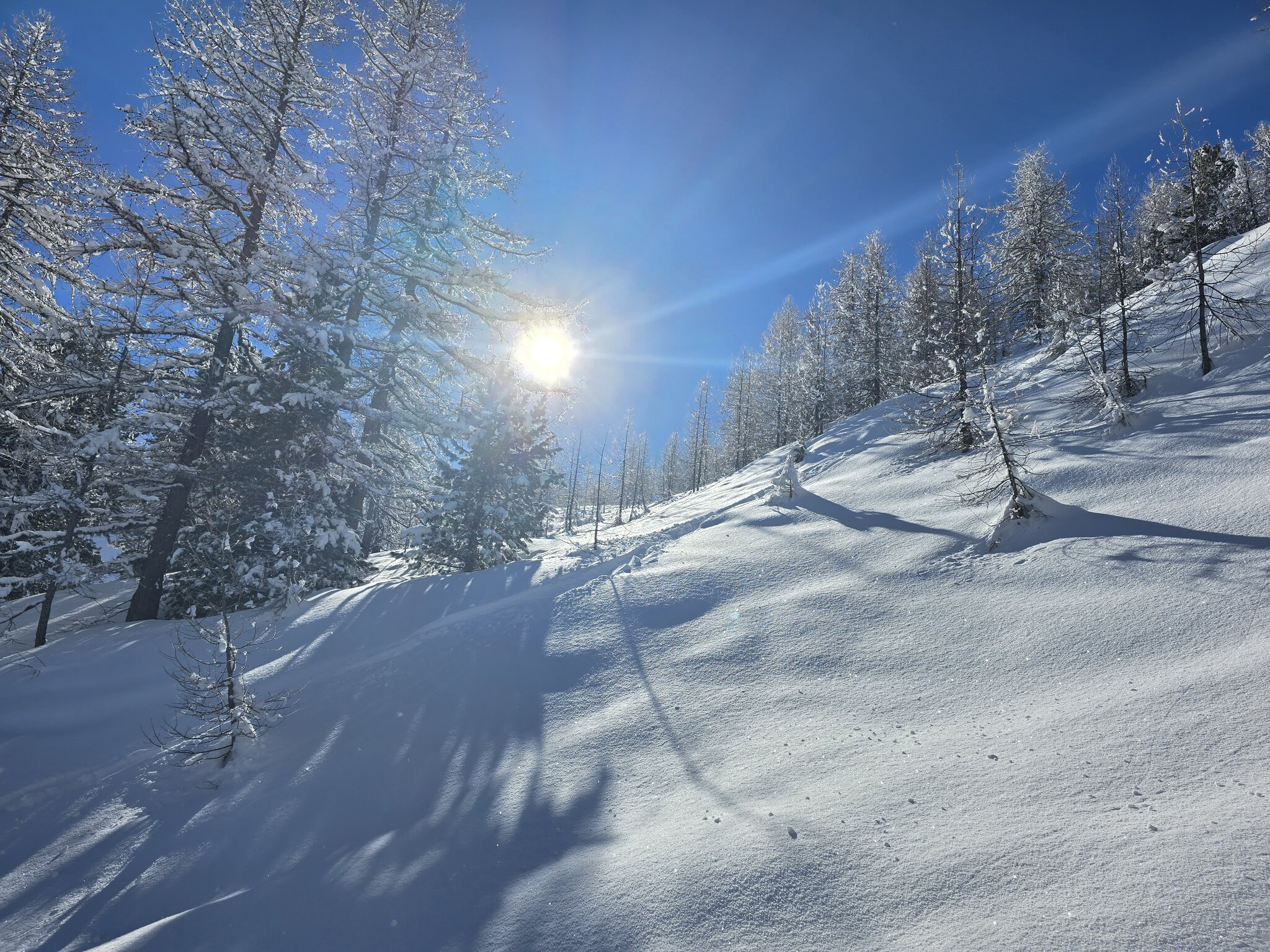 Die erste Abfahrt ist ein Traum. Ca. 5 cm Neuschnee auf hart-griffiger Unterlage.