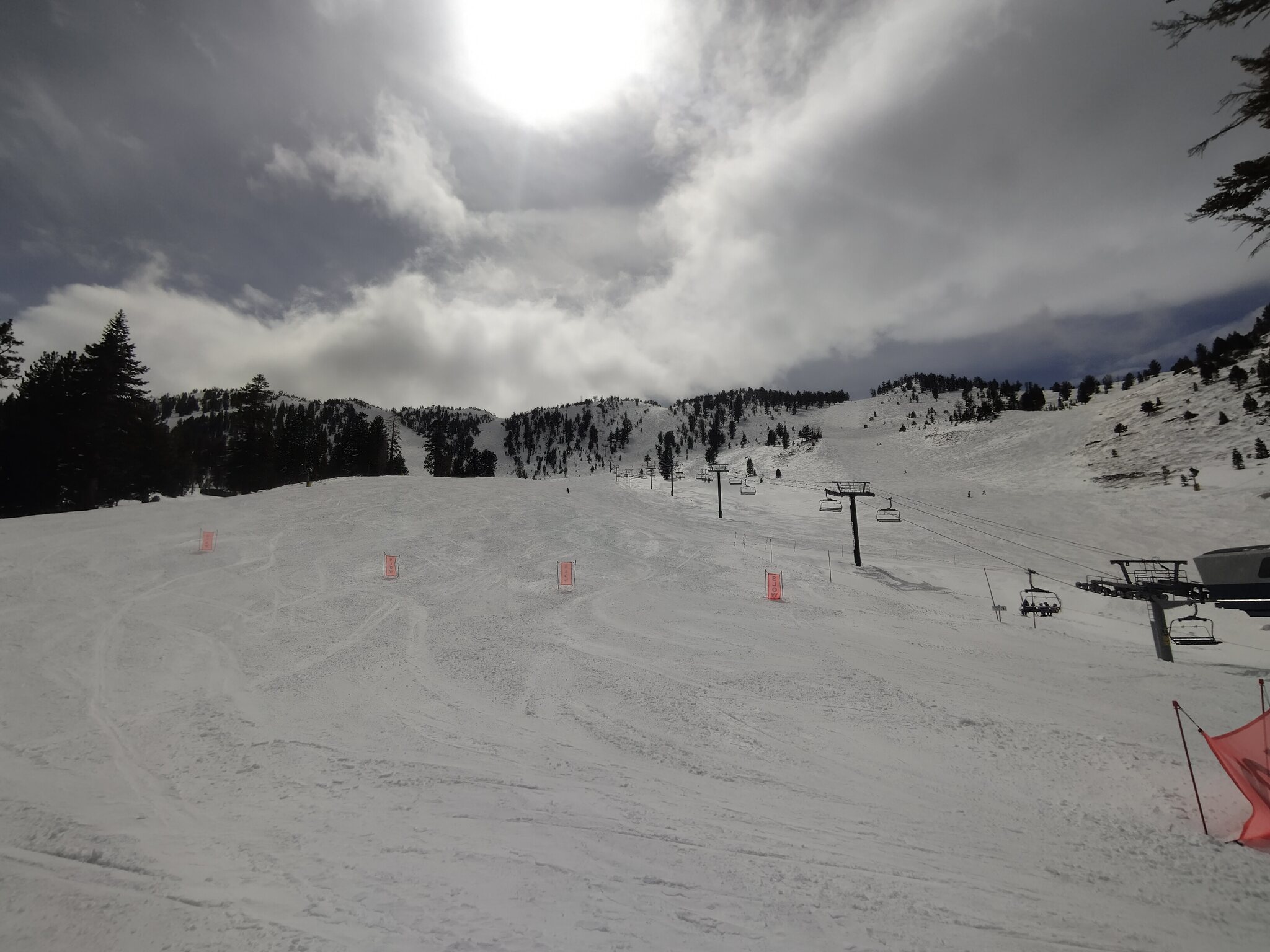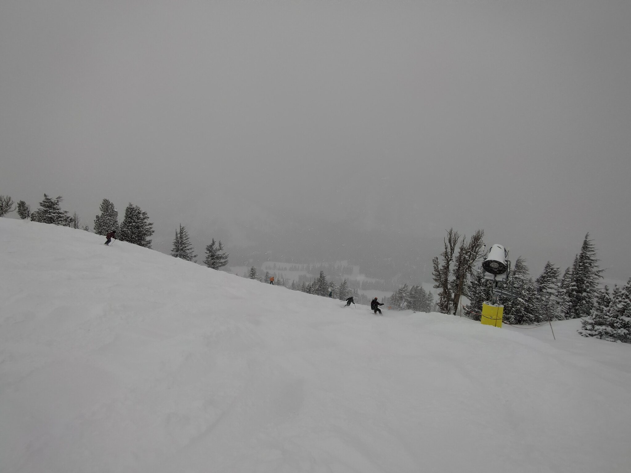 Es hat ca 10-15cm Neuschnee, der aber recht schwer ist. Es ist auch deutlich wärmer als vorhergesagt, nachdem ich mir eine extra eine zusätzliche Schicht ausgeliehen habe ist mir nach den ersten Schwüngen bald zu warm. Aber der Schnee ist trotzdem schön zu fahren: