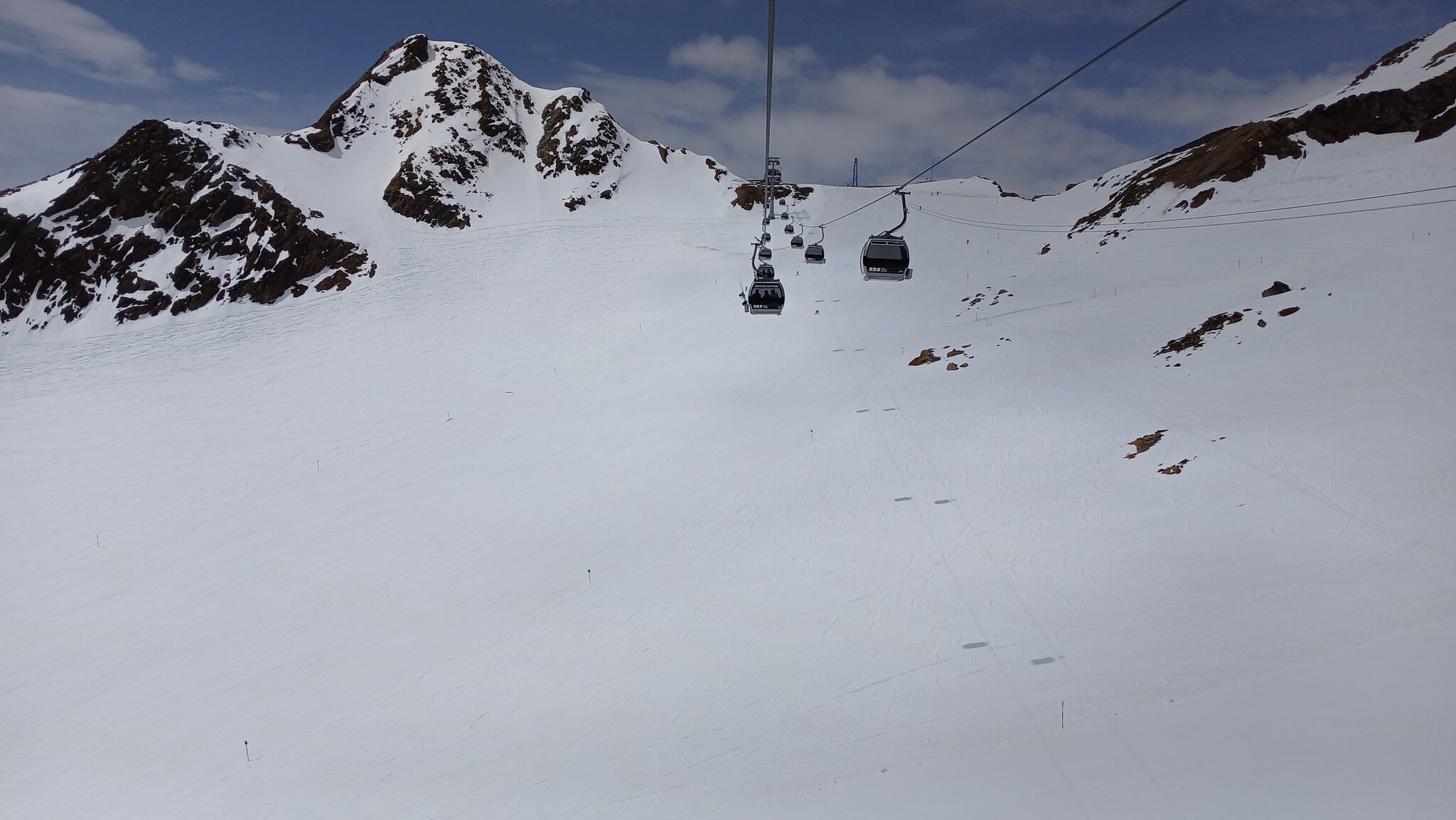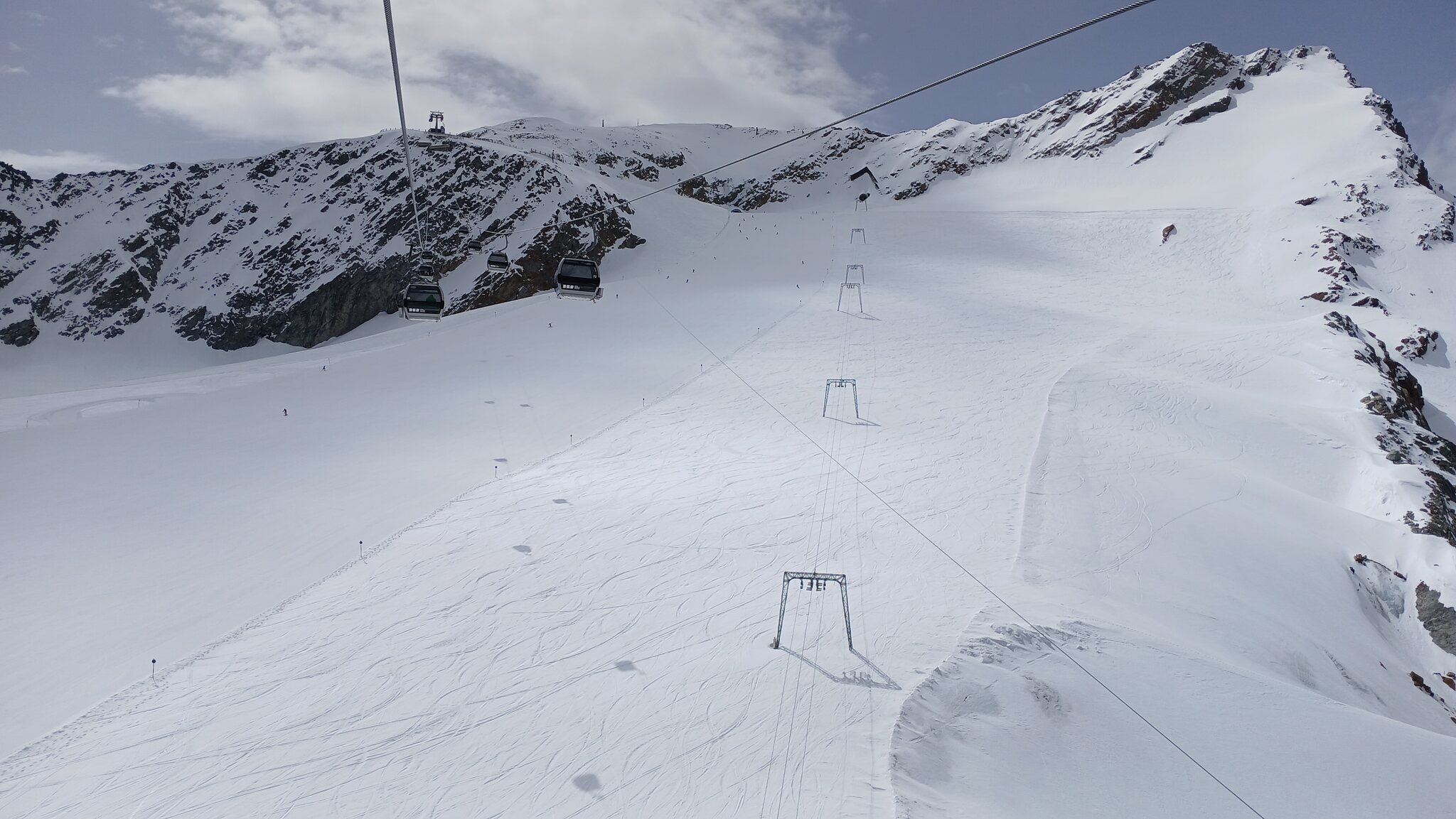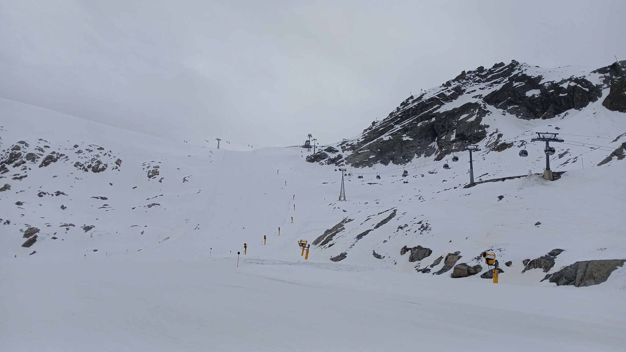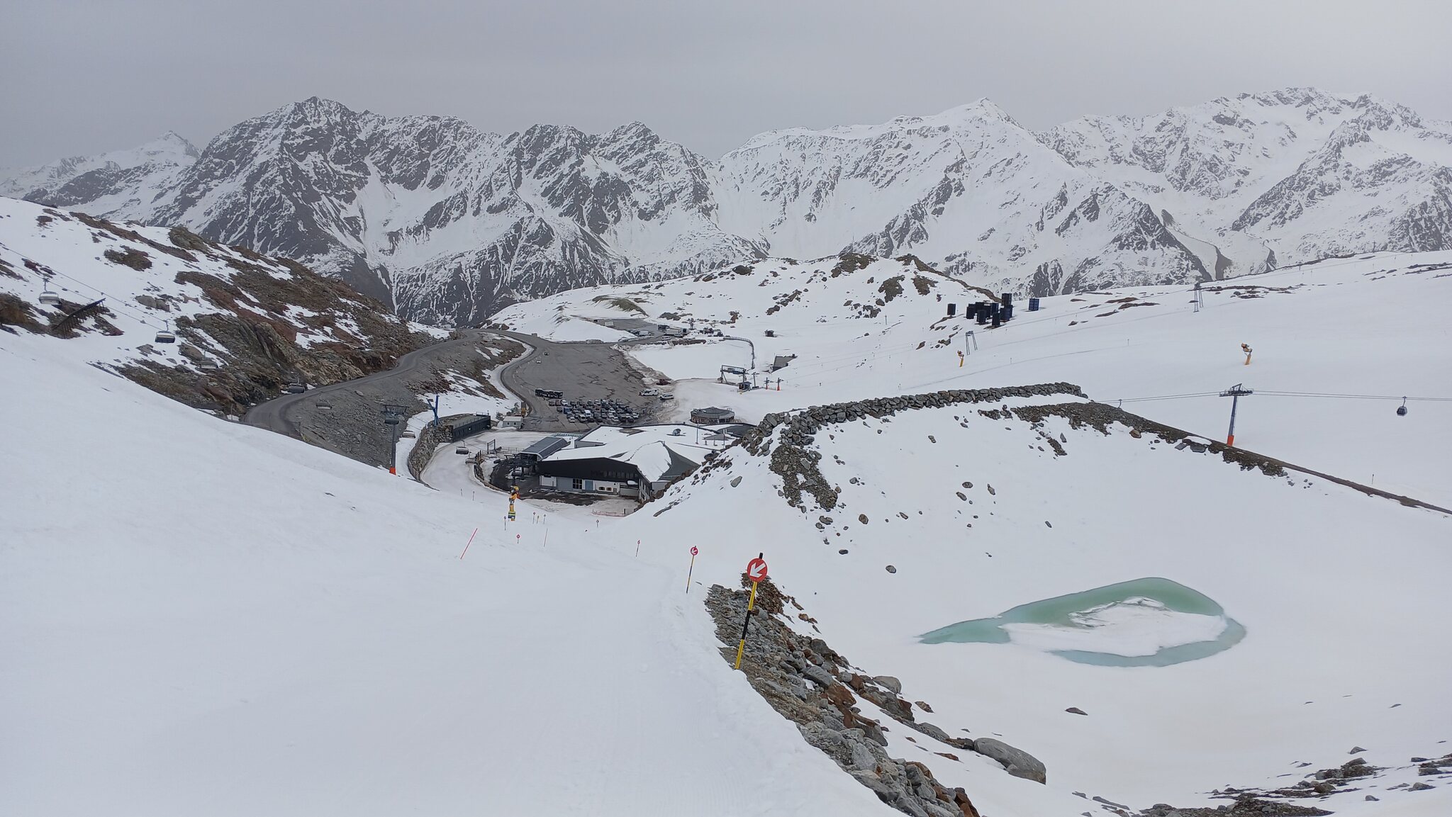 Sölden öffnet für ein Gletschergebiet ja immer recht spät. Da die "Pistenparkplätze" am Rettenbachferner abgesperrt waren, fuhr ich zum Tiefenbachferner. Hier öffnete die Seiterkarbahn "schon" um 08:50 Uhr