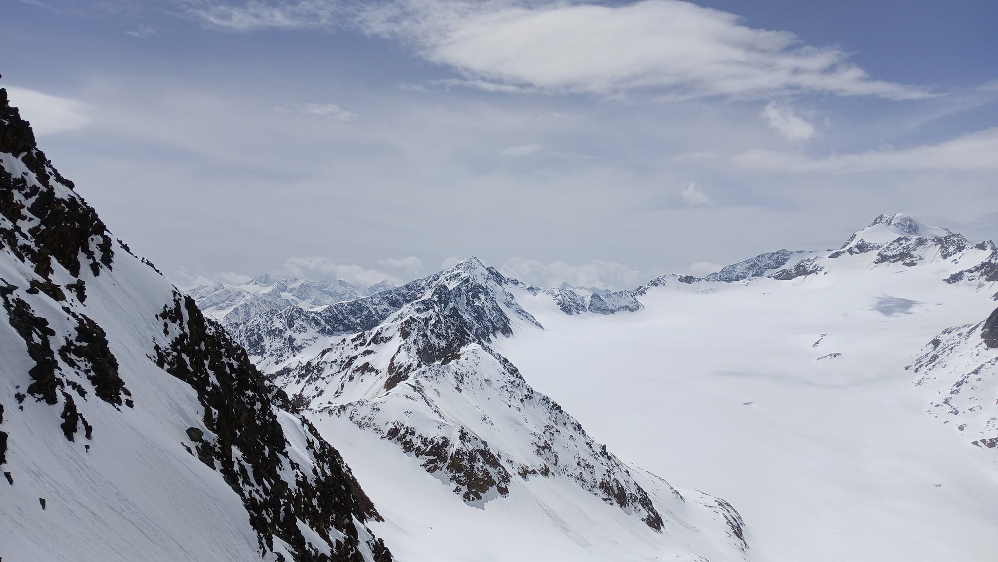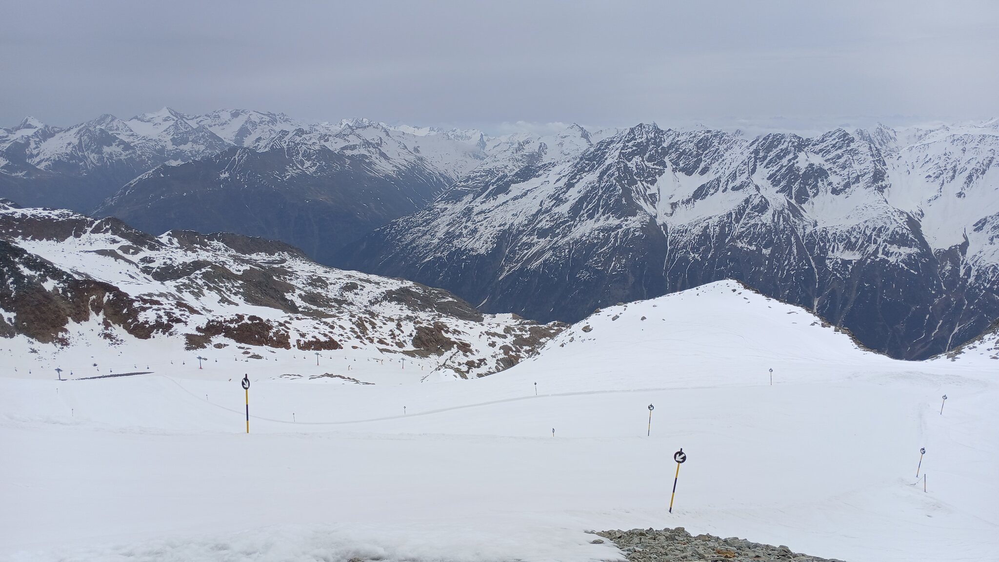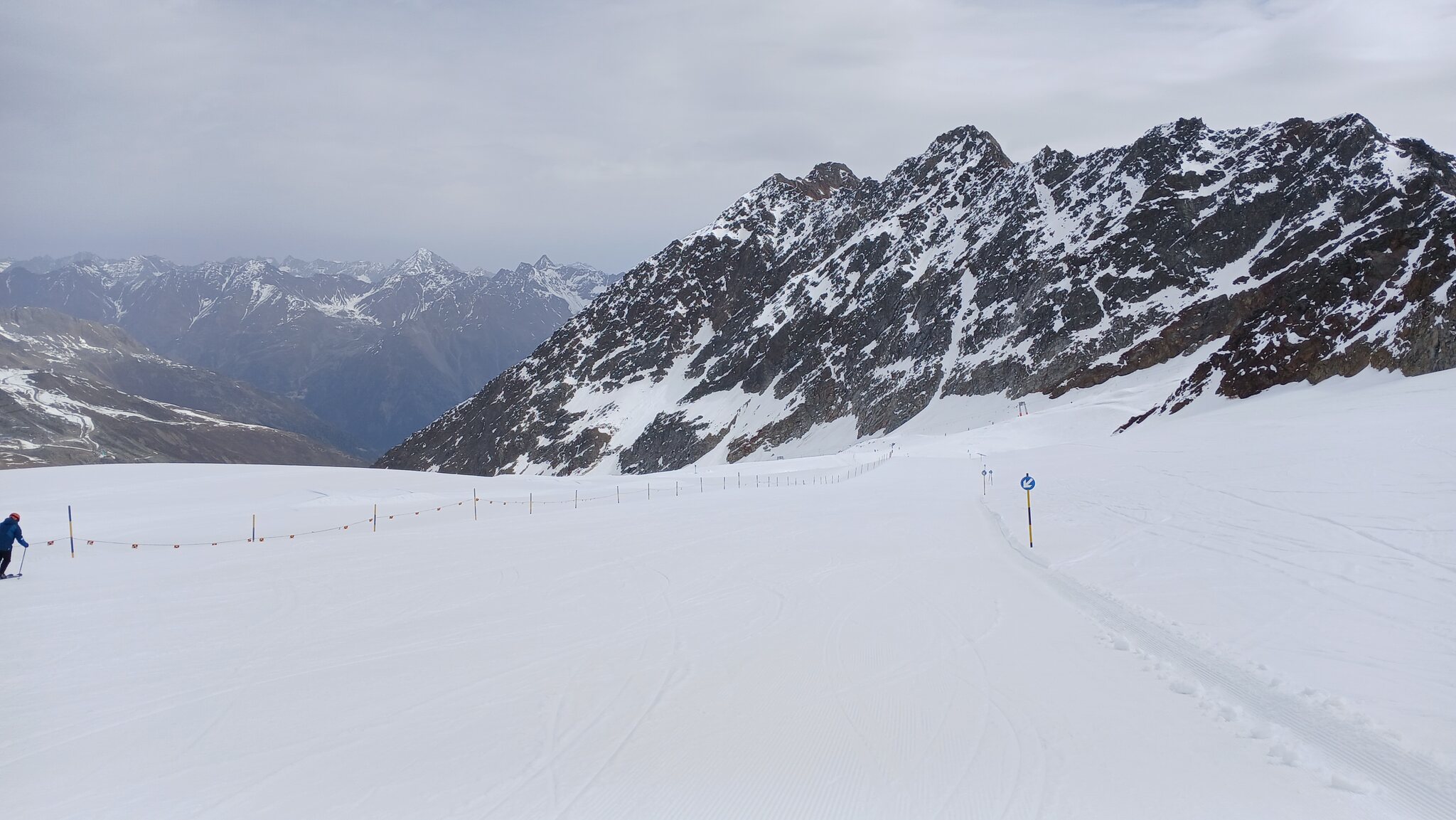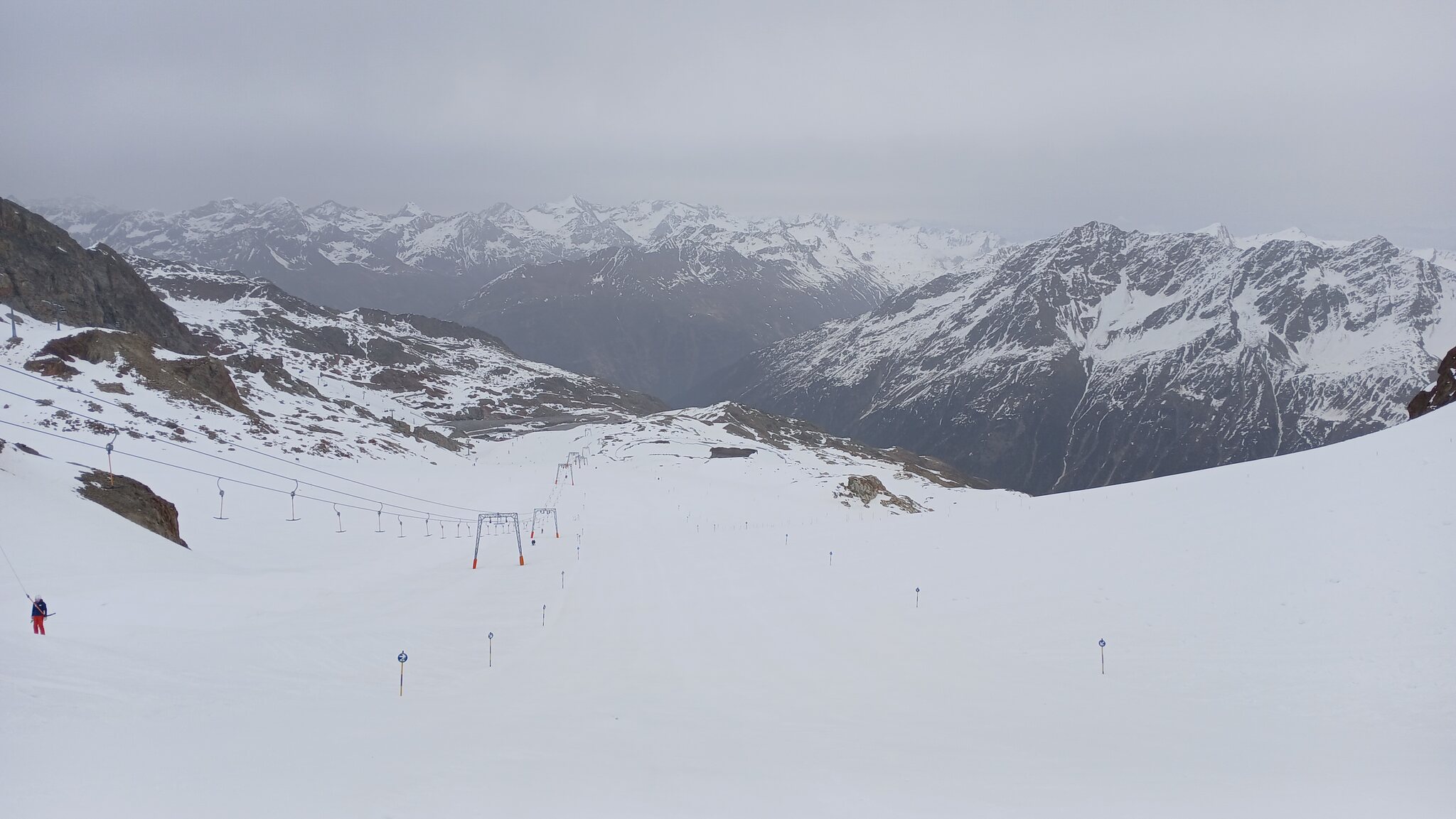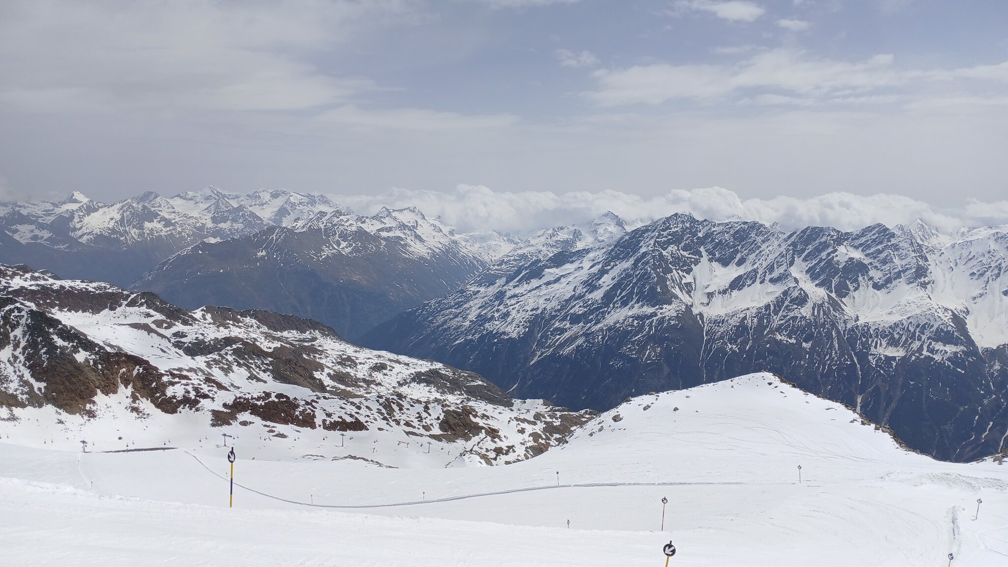 Ausblick von der Schneidbahn. In Richtung Osten hingen dichte Wolken an den Gipfeln. Glücklicherweise war dies in Sölden nicht der Fall