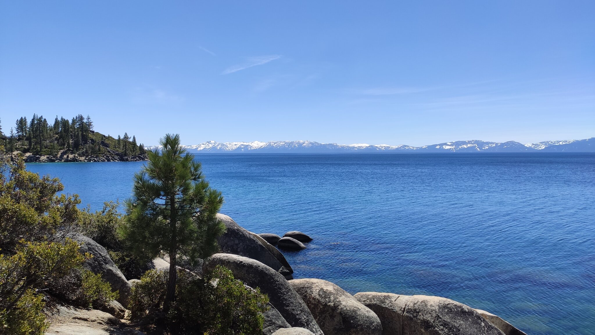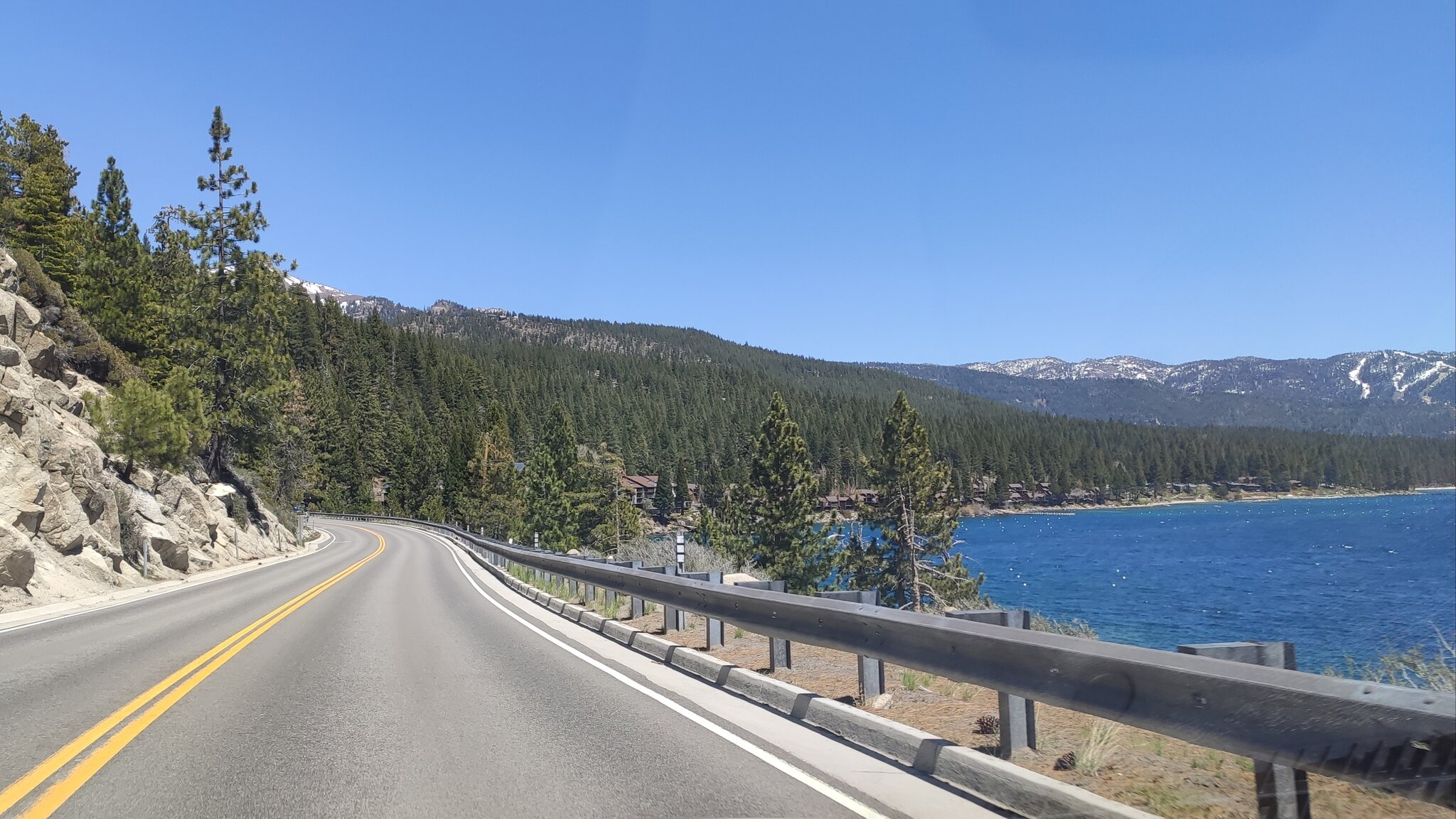 Die einzige weitere Option für Spring Skiing ist Mammoth,was ca 3h südöstlich vom Lake Tahoe auf der Rückseite der Sierra Nevada liegt. Zuerst führt die Straße am See entlang: