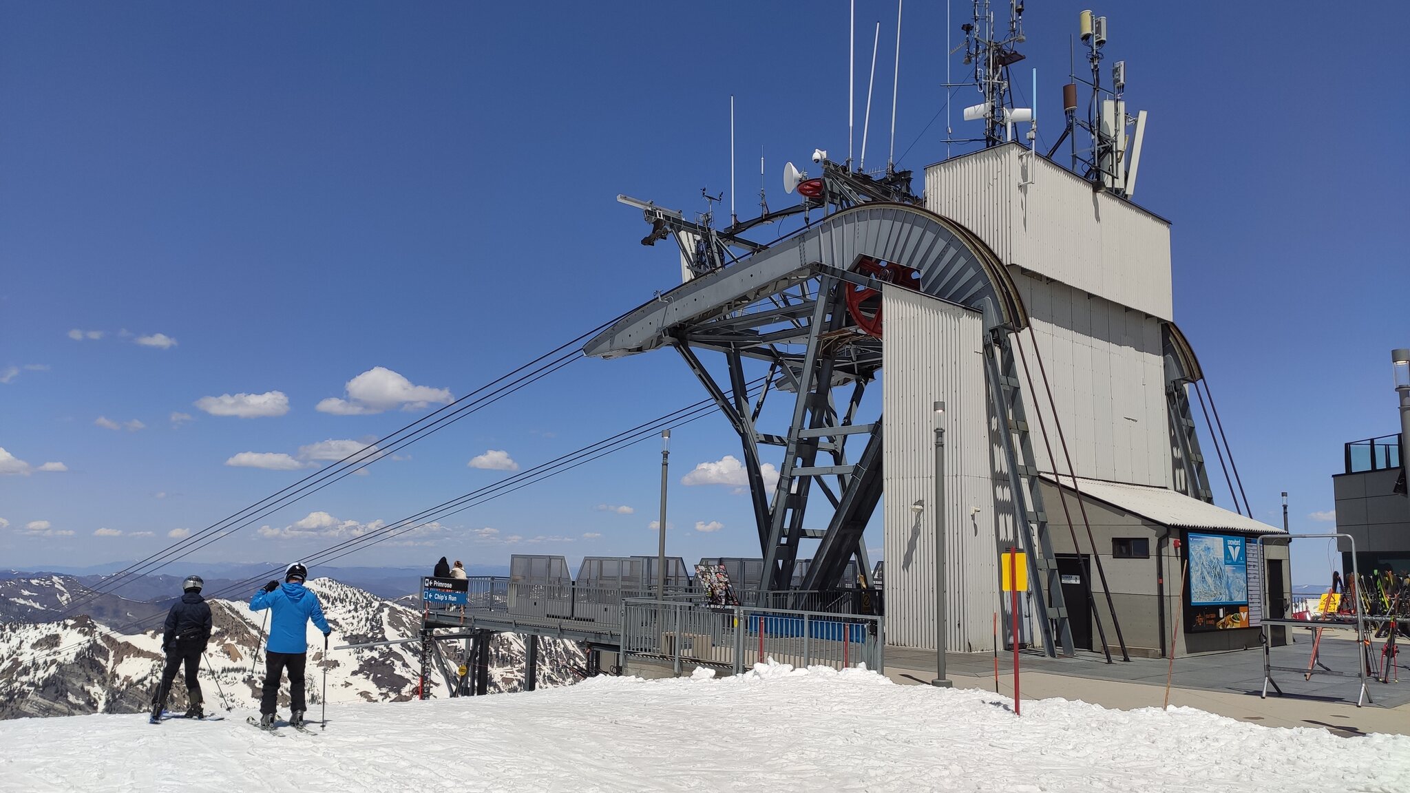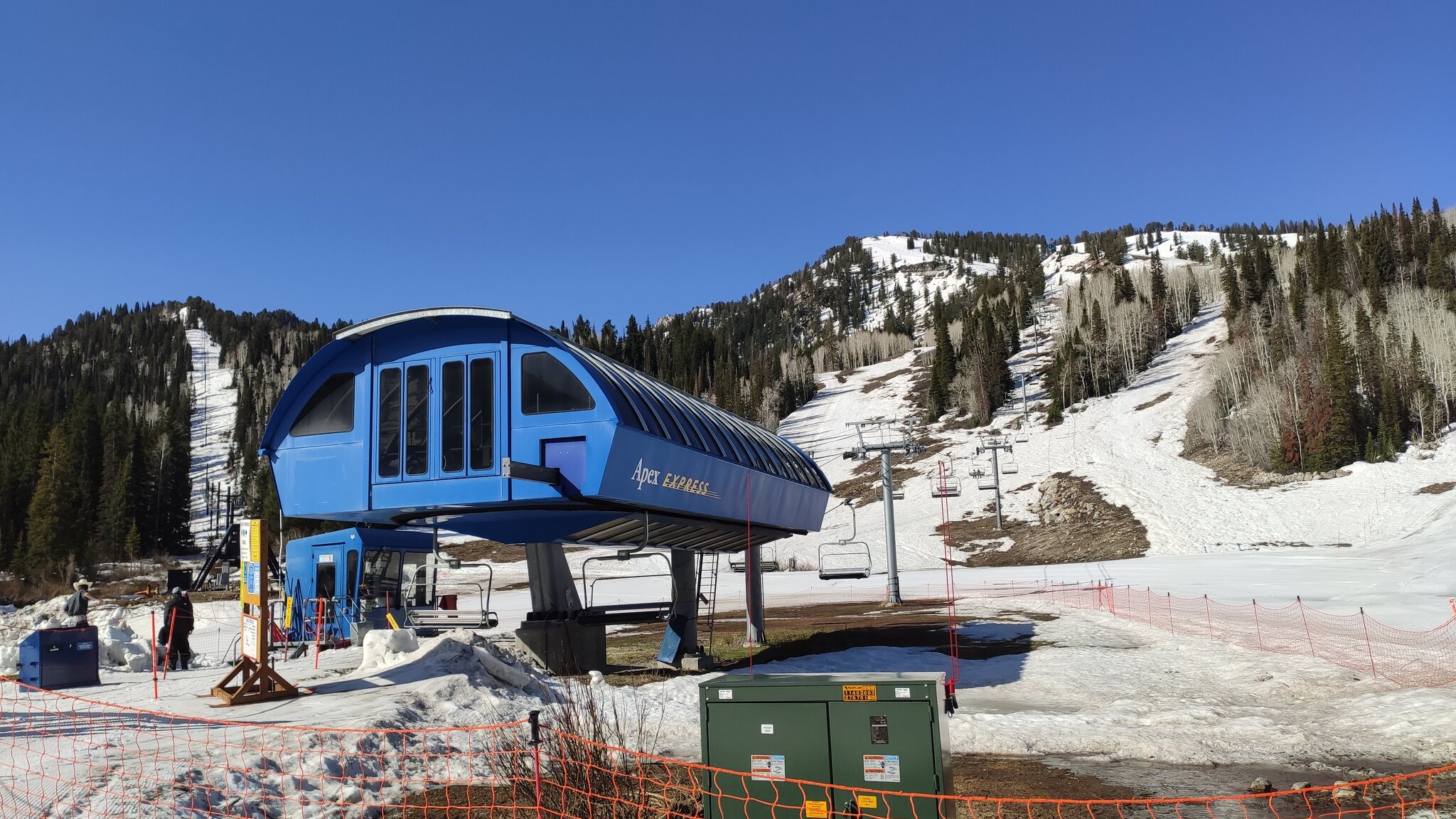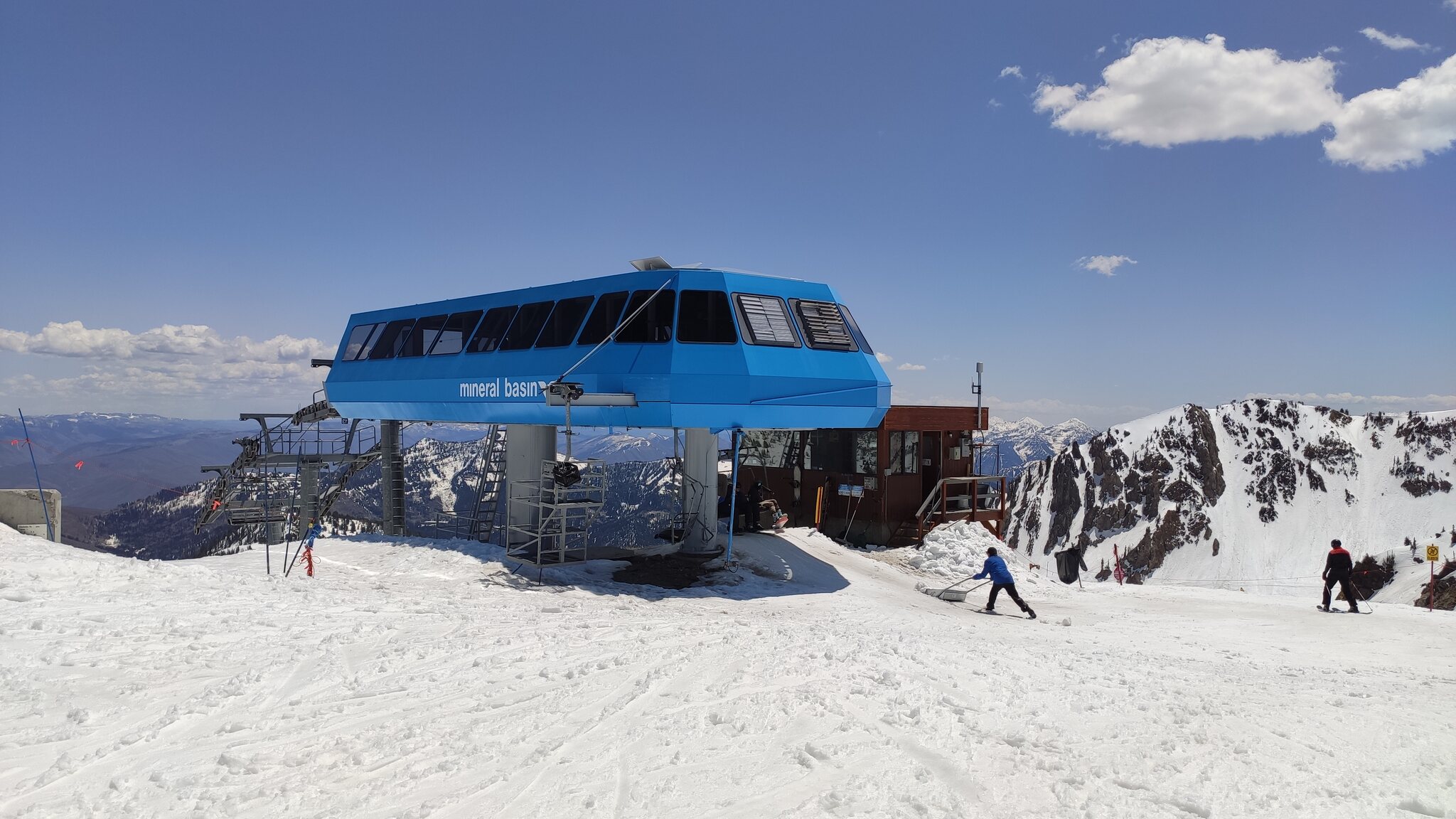 Die zweite Kabine ist rot: Auf dem Gipfel befindet sich auch die Bergstation vom Mineral Basin-Sessellift. Die Talstation ist massiv, davor wurde eine alte Kabine zu einer Bar umfunktioniert. Das Gebiet scheint mir etwas interessanter zu sein als Solitude, hier kann man jedenfalls mehr Höhenmeter machen. Im Ikon Base Pass sind 5 Tage Snowbird dabei.