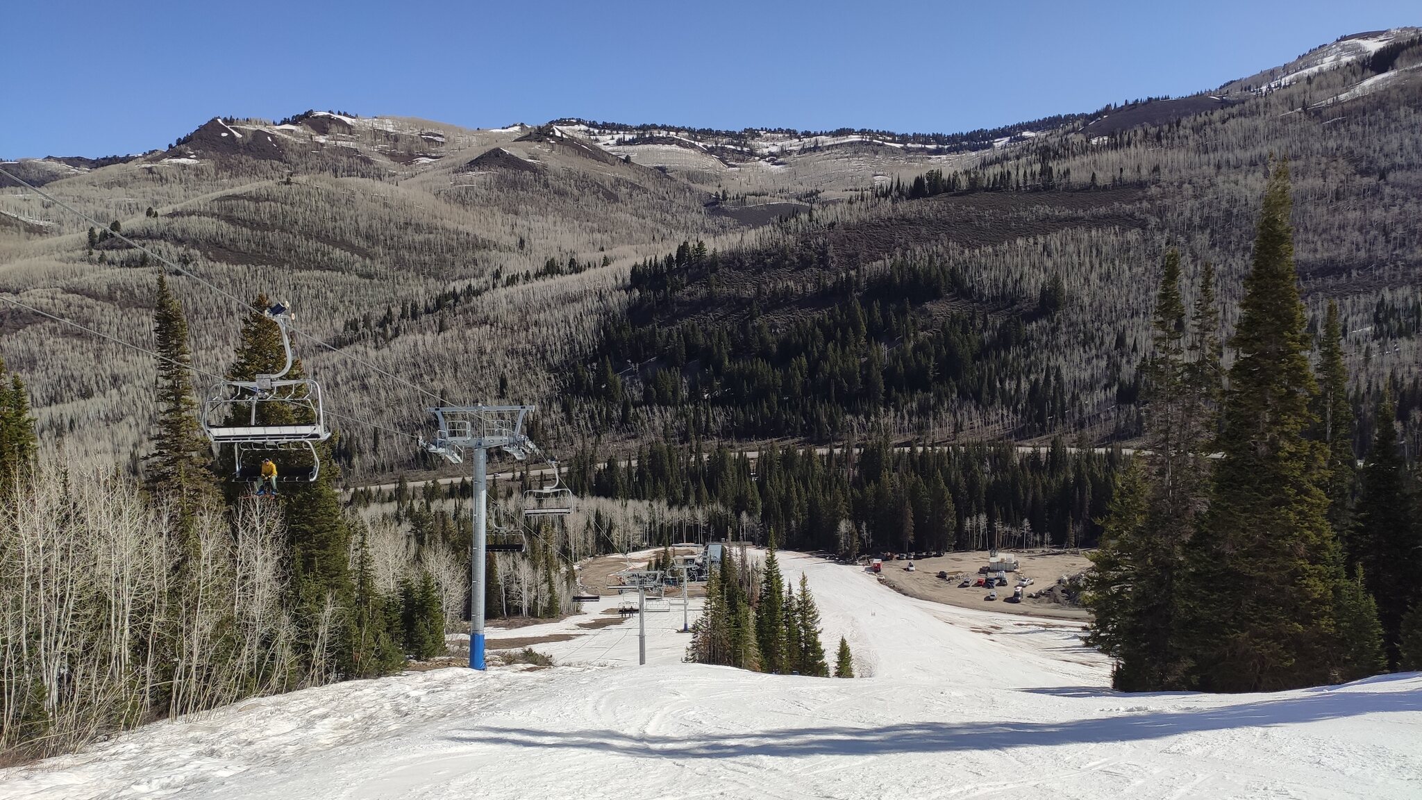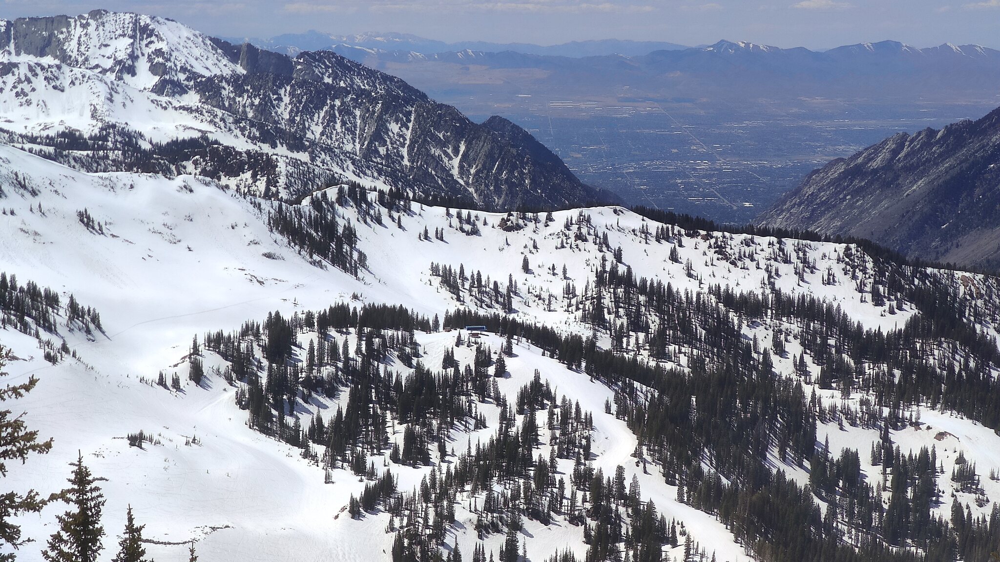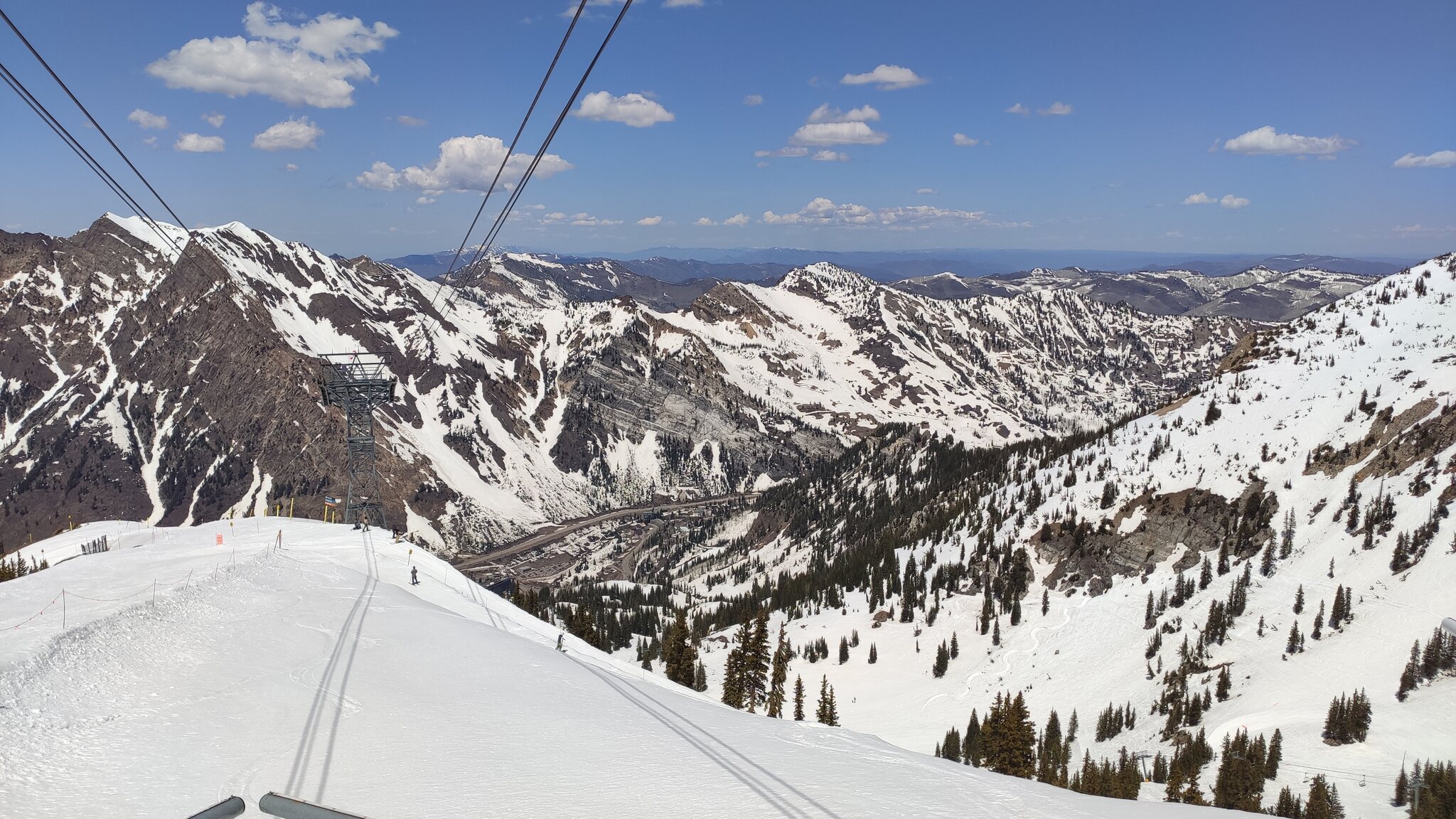 Snowbird ist leider nicht inklusive beim Ikon Spring Skiing, ich habe aber die Aerial Tram am Nachmittag als Fußgänger genommen. Von der Aussicht lohnt es sich. Blick hinab zum Resort: