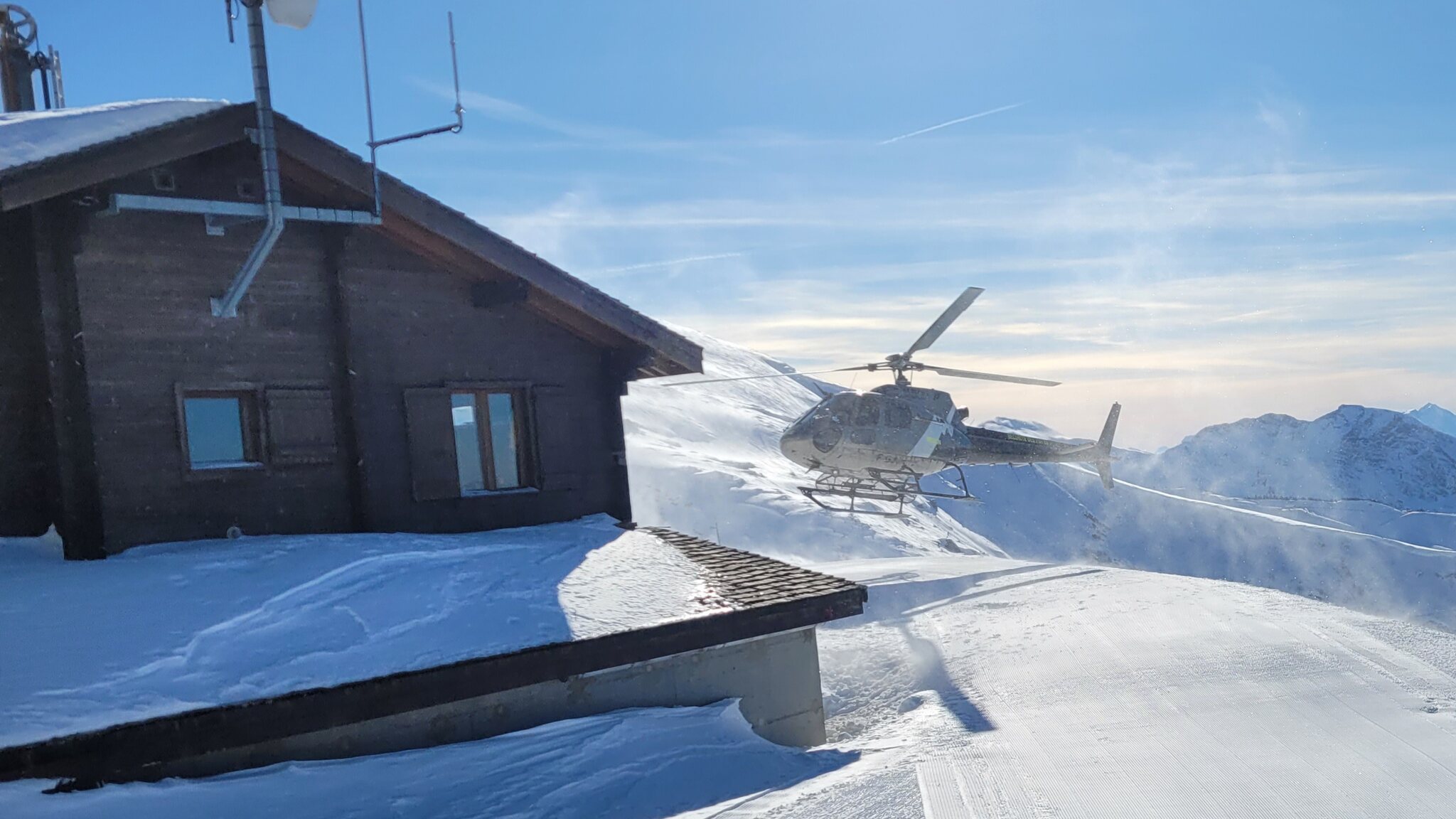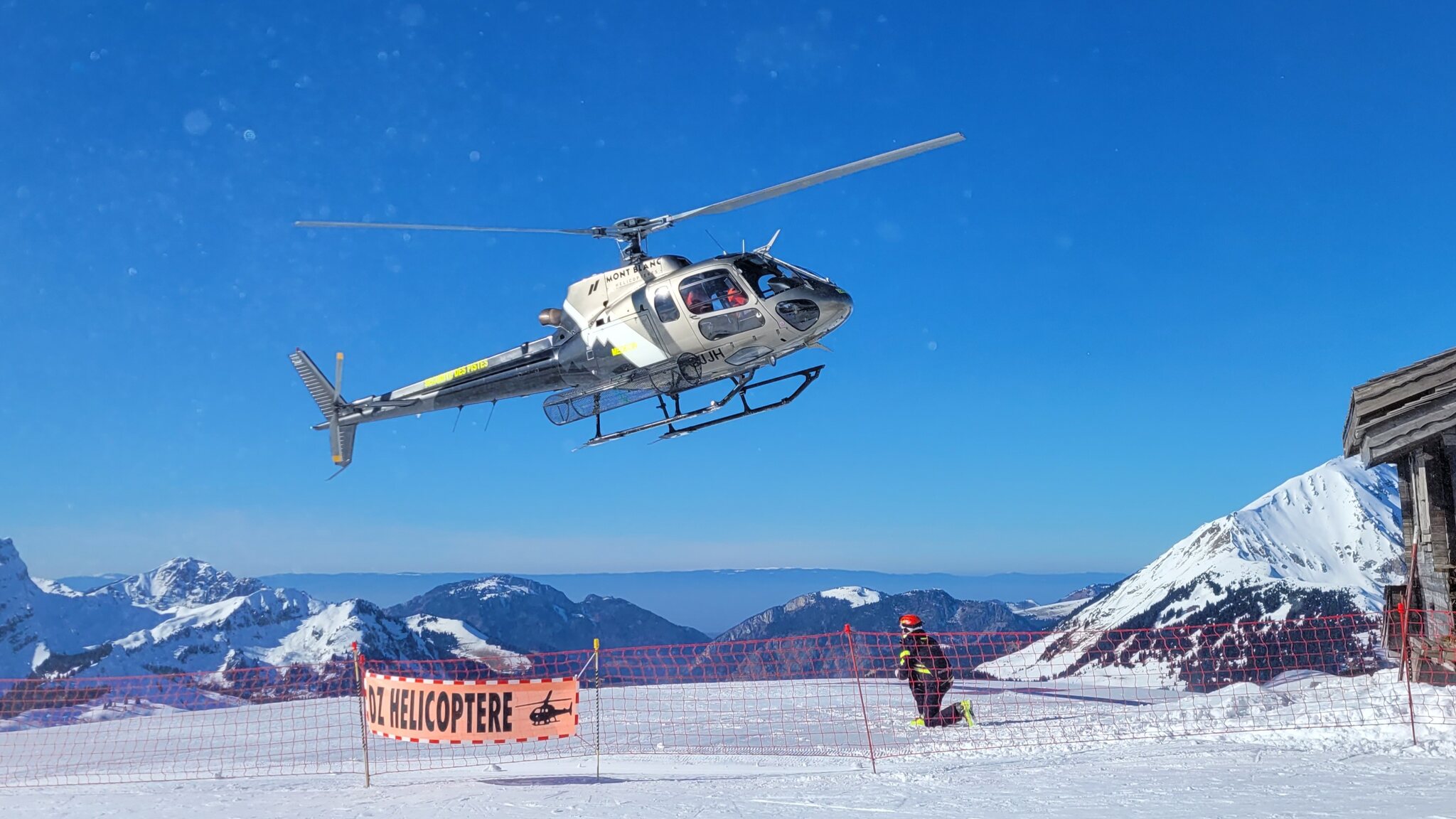 Sportlicher Anflug und Takeoff einer AS350 von Mont Blanc Helicoptère am 16.02. in Châtel (Portes du Soleil):