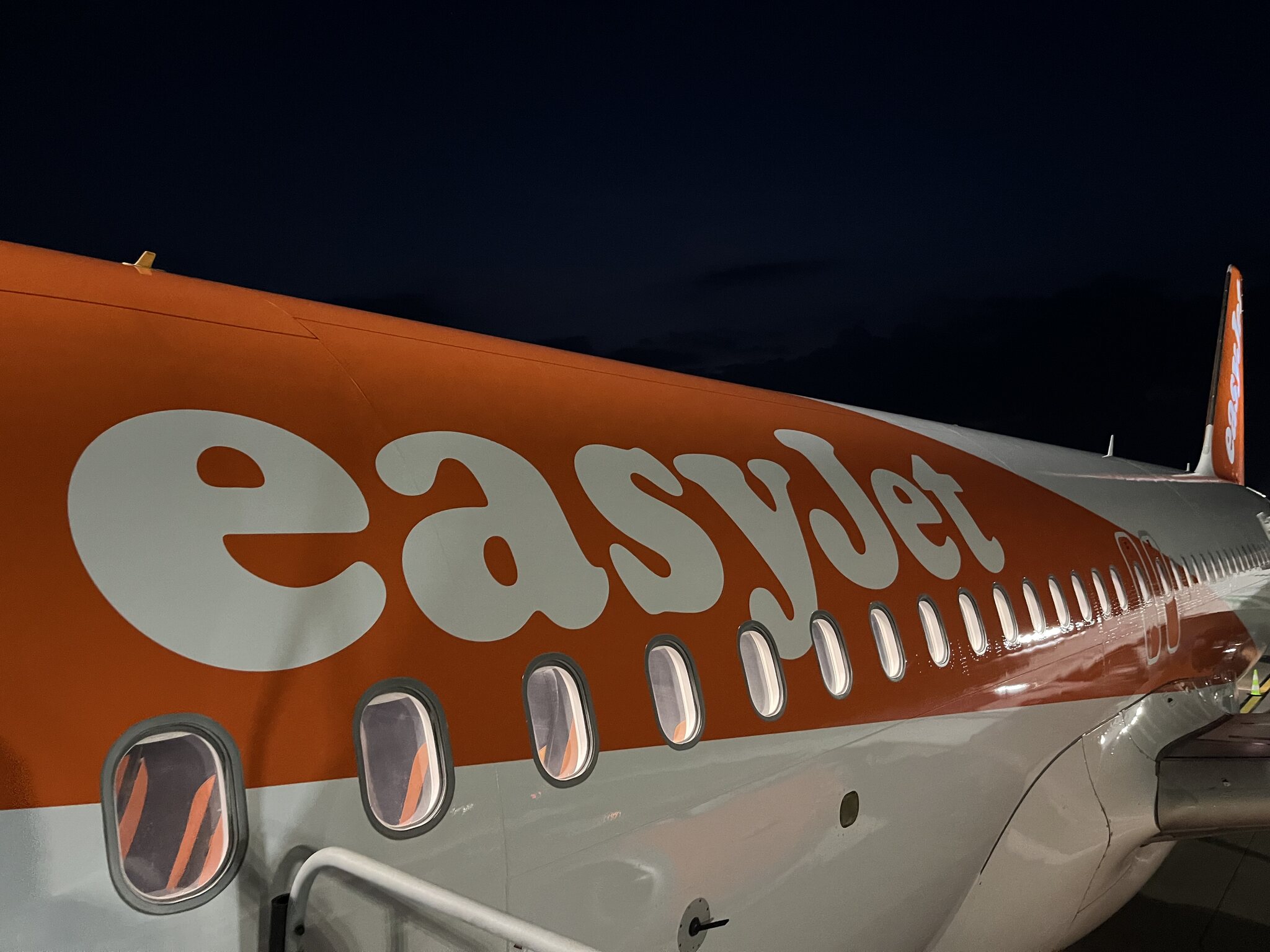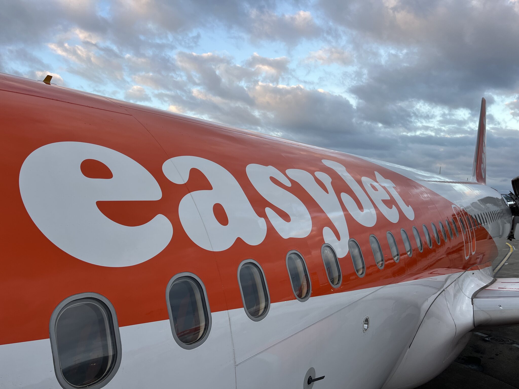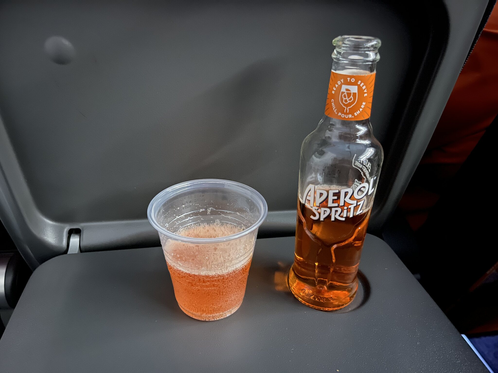 Und so heben wir nur wenig verspätet ab. Passend zum Easyjet-Design gönnen wir uns einen Apérol Spritz.