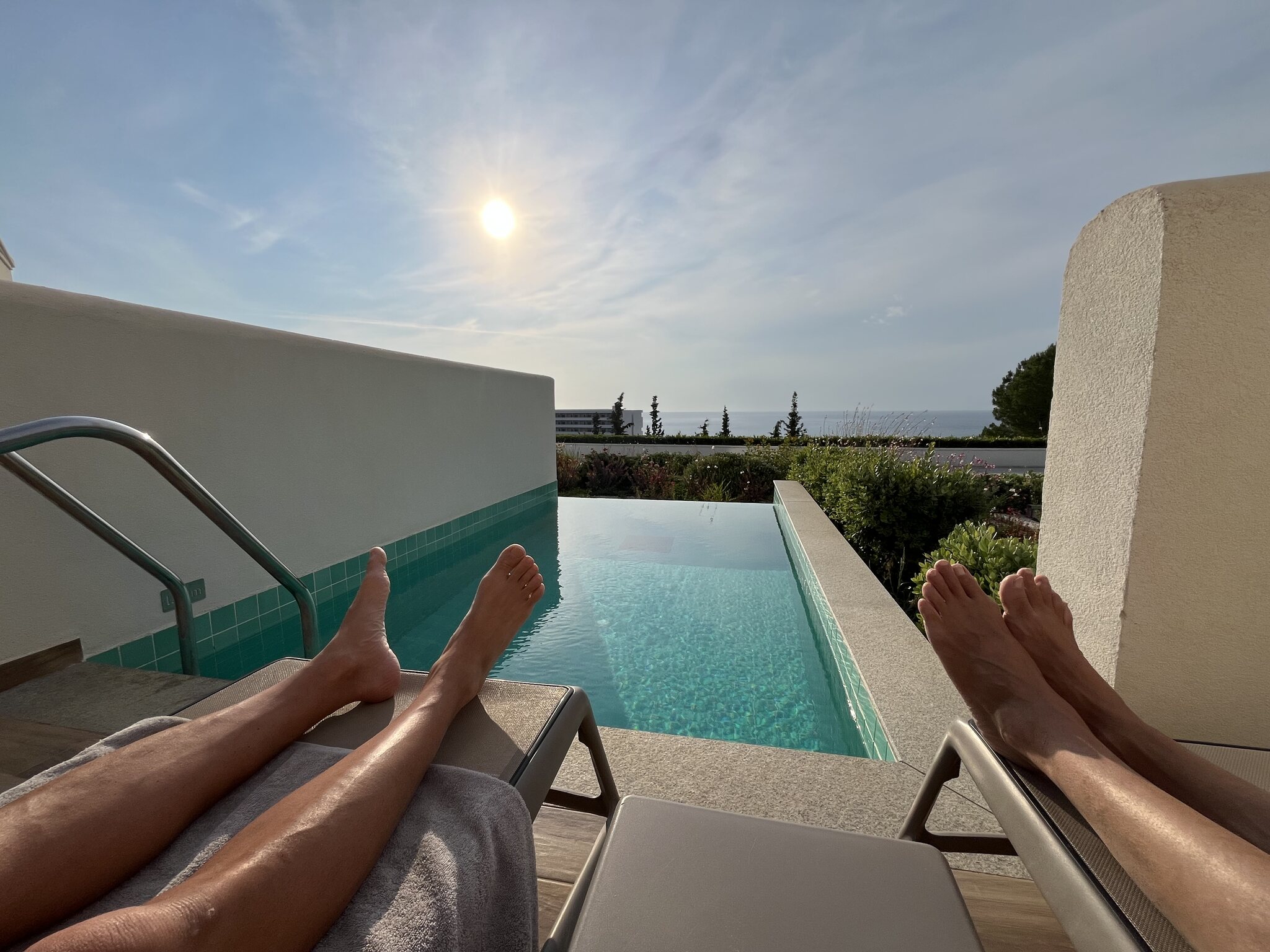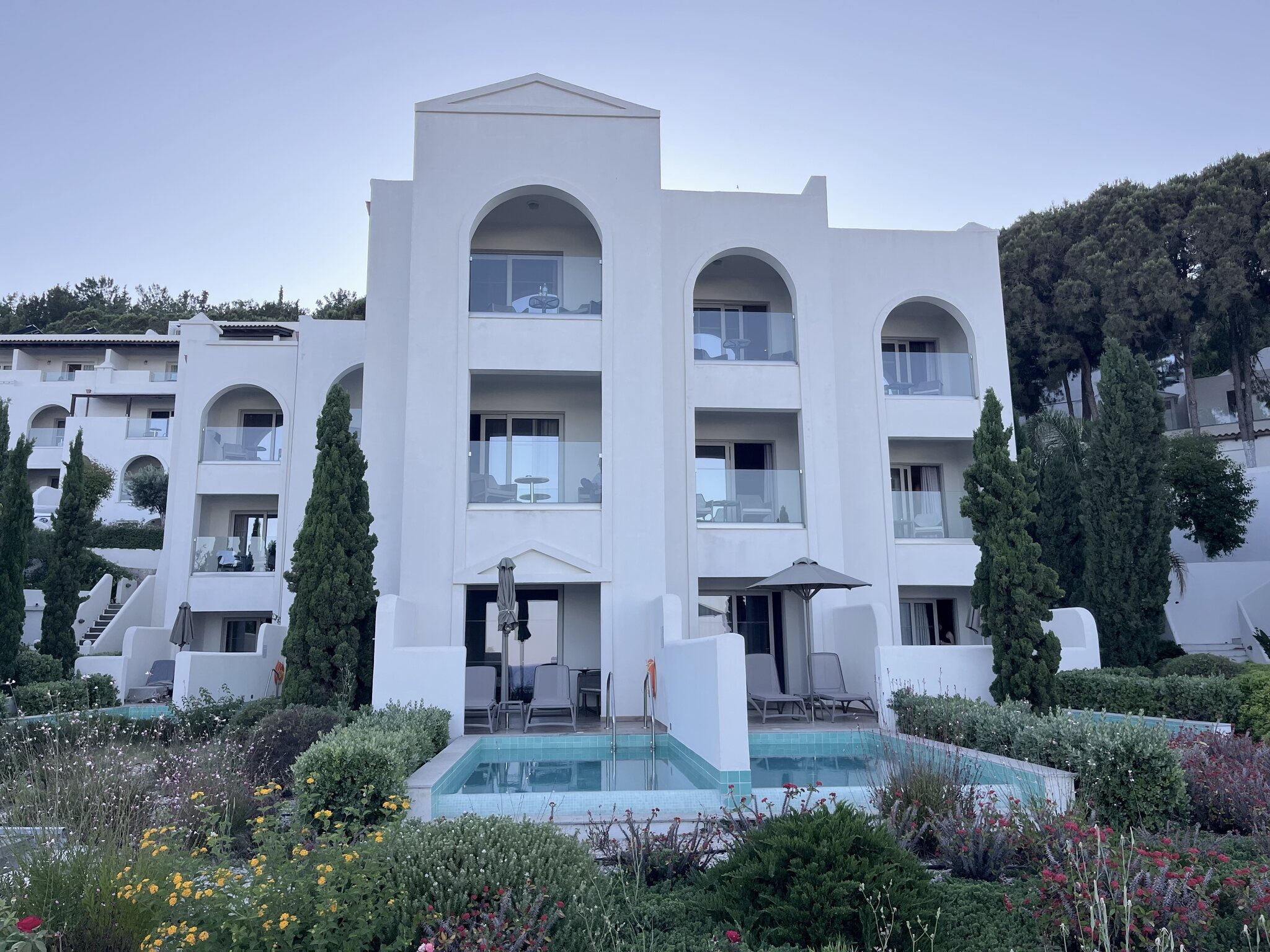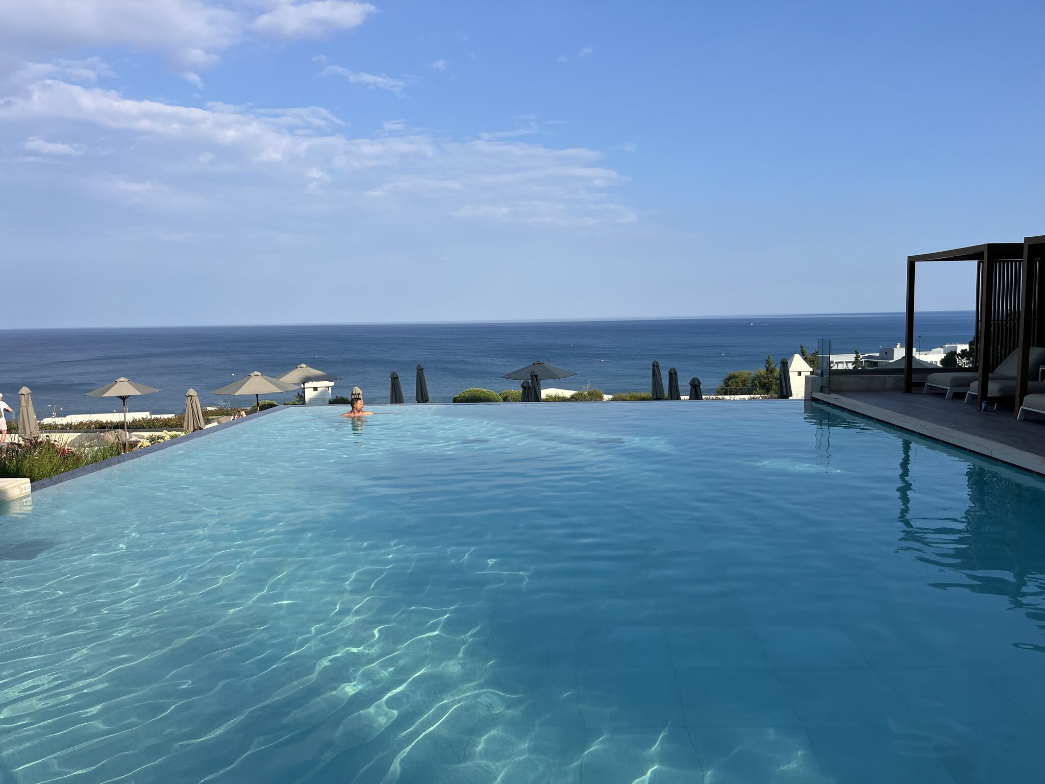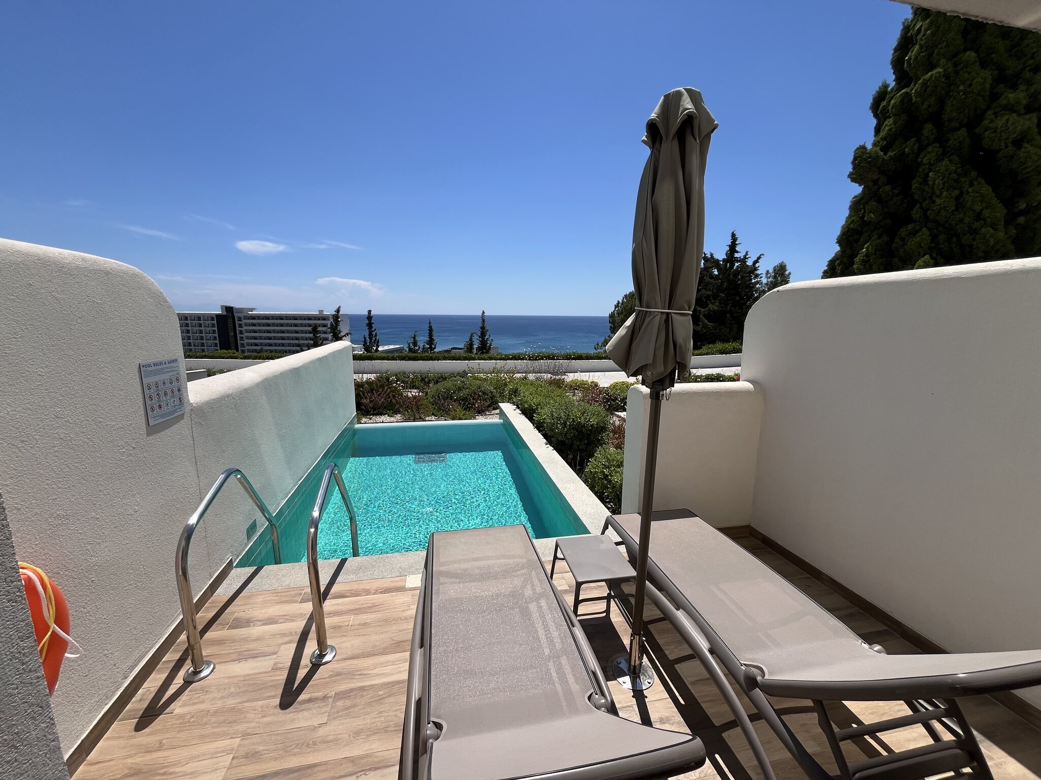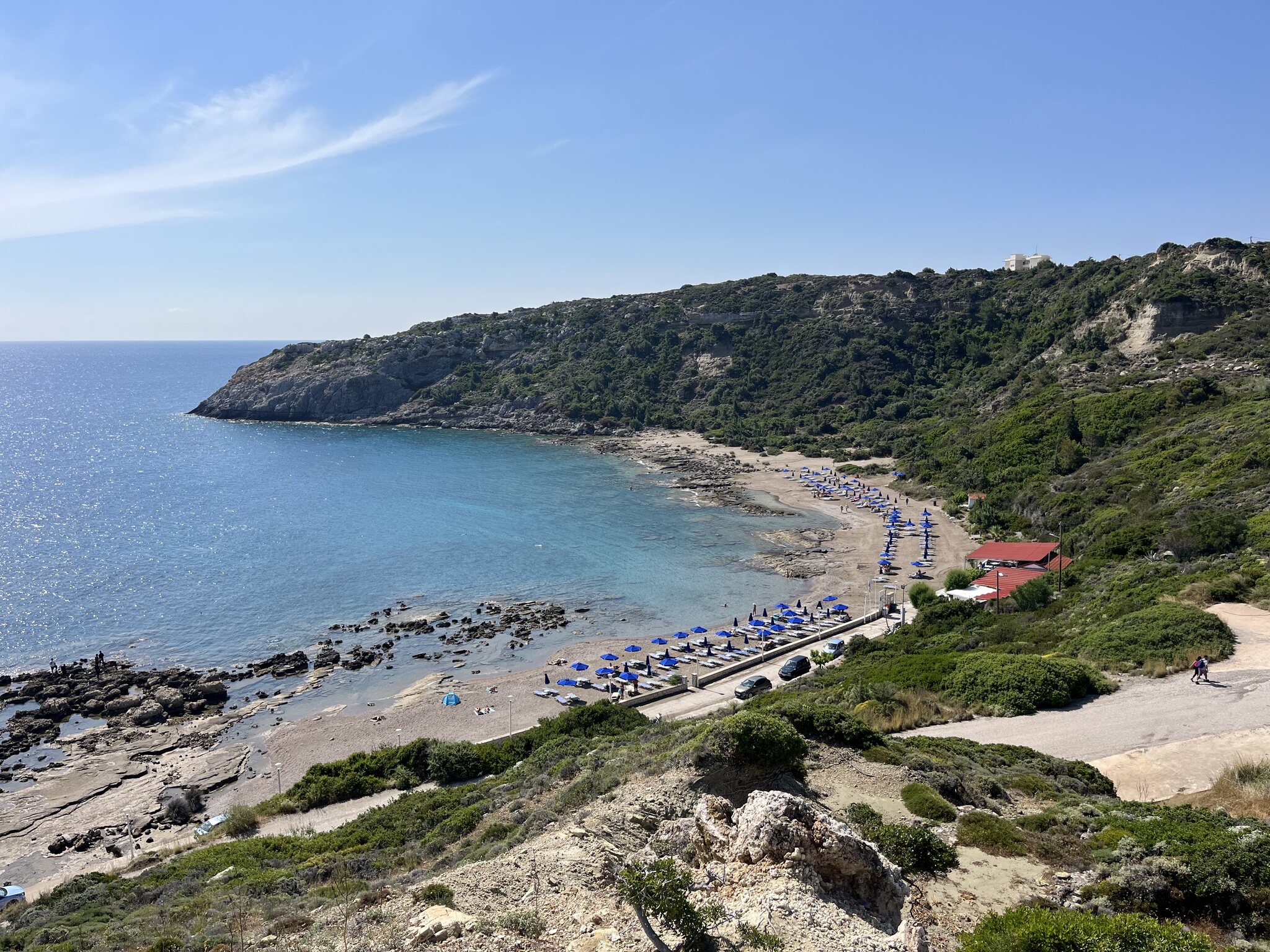 Um 5:40 Uhr dann das Boarding. Der Pilot informiert, dass Rhodos überlastet sei und wir drum noch 40min warten müssten. Das sind dann aber Fakenews und wir heben doch pünktlich um 6:25 ab. Der Flug läuft zügig. Wir landen 20min zu früh auf Rhodos um 10:20 OESZ. Sixt hält sein Versprechen, beide Schalter sind leer, die Schlüssel haben wir in wenigen Minuten in der Hand. Ich mag diese Firma einfach. Ihr erklärtes Ziel, die schnellsten zu sein, hat mich noch nie enttäuscht. Auch das Check-In im Hotel geht superschnell. Den Prosecco mögen wir kaum runterstürzen. Und das beste: Das Zimmer ist schon bereit. Eine Stunde nach der Landung oder weniger als 7h nach der Abfahrt zu Hause kommen wir in unserem kleinen Luxusreich an: Nach einem kurzen Bad im eigenen Pool zieht es uns aber Richtung Strand, konkret an den Gay-Beach am südlichen Ende von Faliraki. Es war wirklich Zufall: Bei der Hotelbuchung wussten wir noch nichts von diesem Beach, waren aber dann nach der entsprechenden Recherche hocherfreut, liegt dieser nur 11min vom Hotel entfernt. Es ist jetzt nicht grad der schönste Strand. Etwas felsig durchsetzt, aber er taugt. Und die unkomplizierte Gay-Atmosphäre gefällt uns halt. Gegen 19 Uhr kehren wir für eine kurze Dusche zurück ins Hotel (unser Zimmer ist das mittig im Bild unter dem Gibeldach)… …um kurz danach an die Nordwestküste zu fahren, wo wir ein tolles Restaurant am Strand bei Theologos finden: Das Meer ist auf dieser Seite allerdings etwas wild. Die Stimmung aber wunderbar, was auch die junge Entenfamilie findet