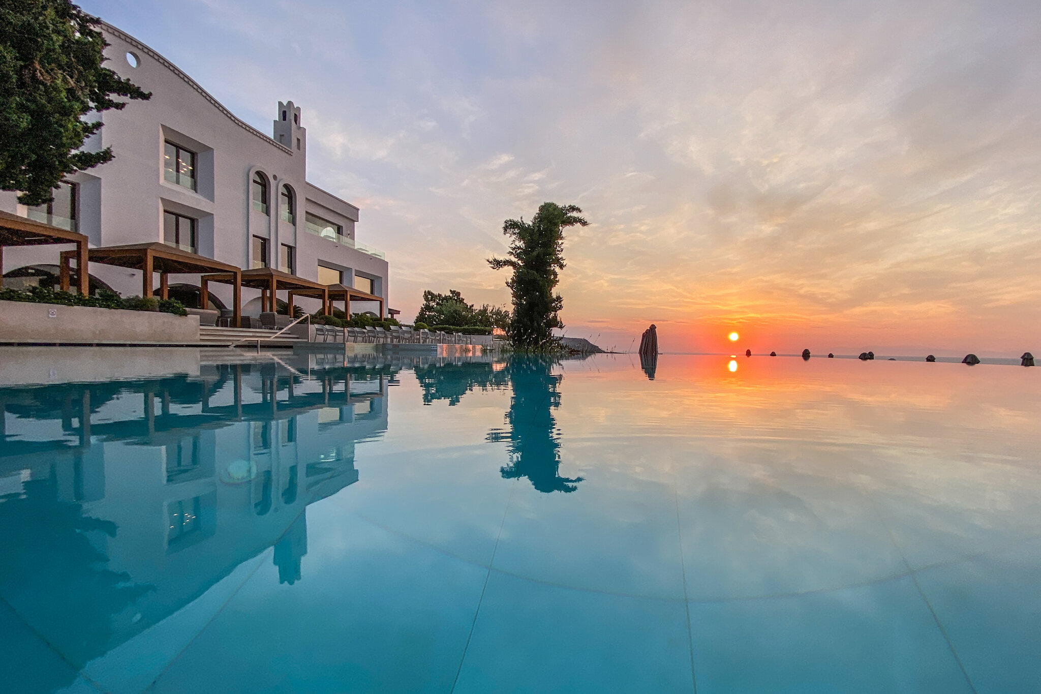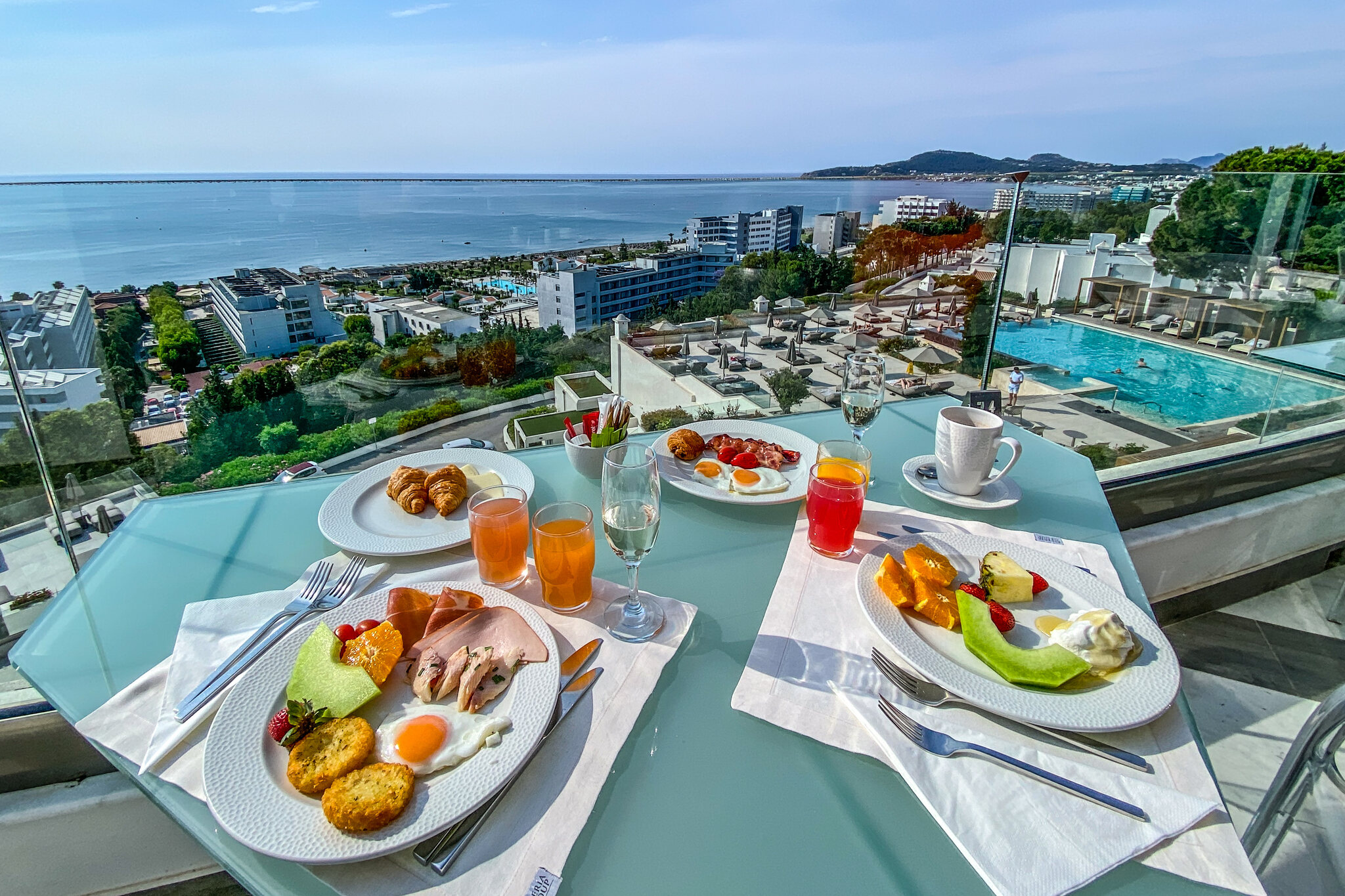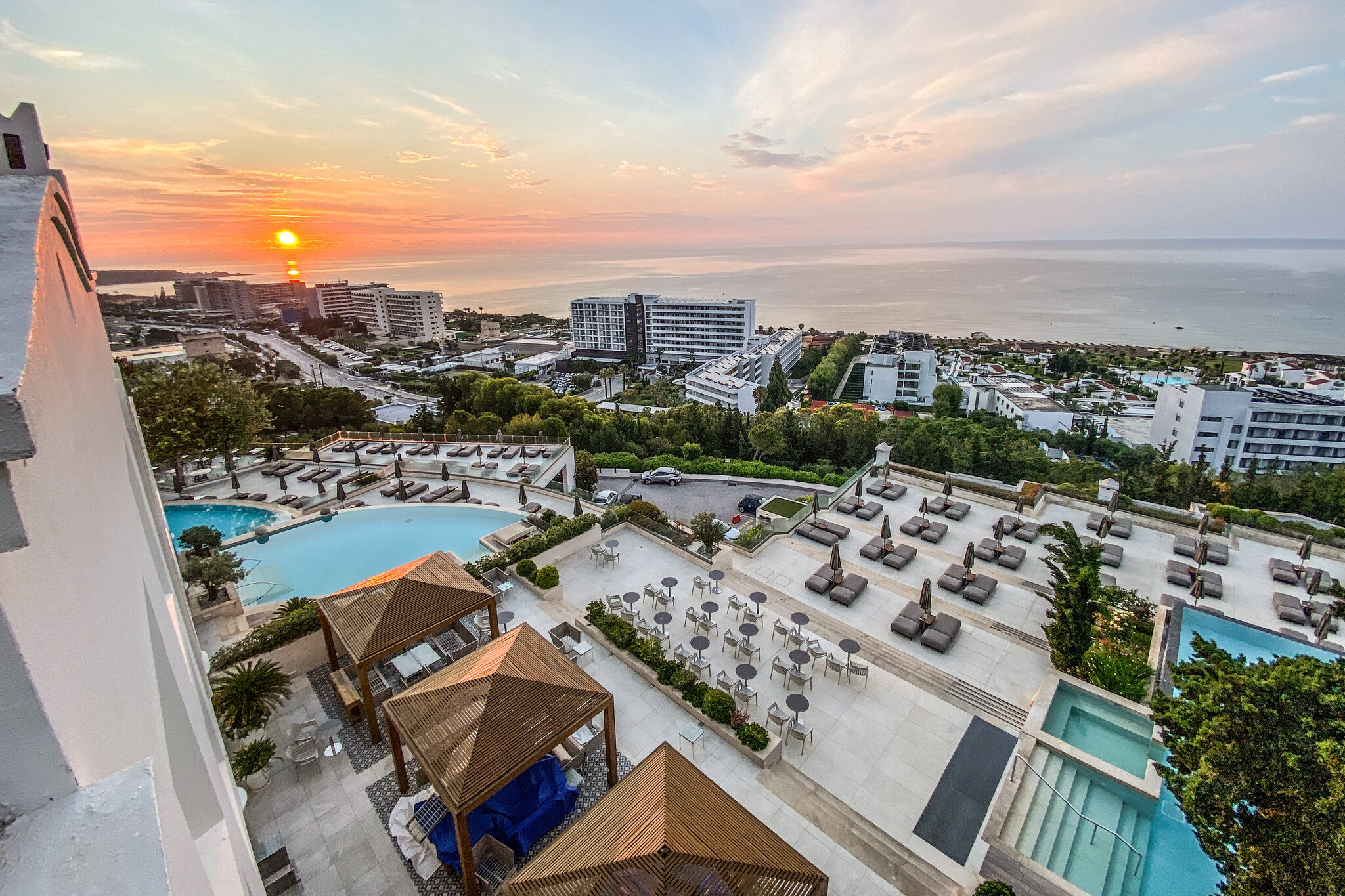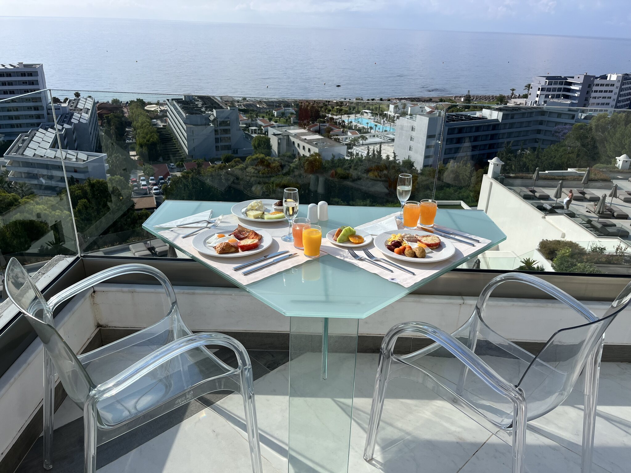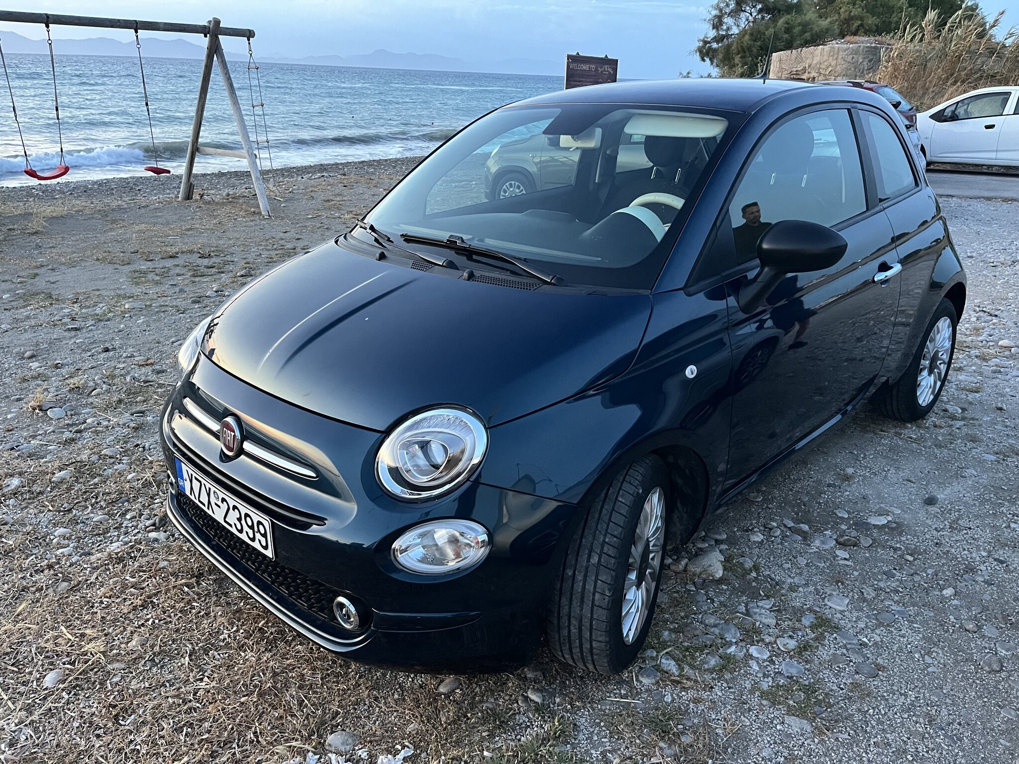 Um 5:40 Uhr dann das Boarding. Der Pilot informiert, dass Rhodos überlastet sei und wir drum noch 40min warten müssten. Das sind dann aber Fakenews und wir heben doch pünktlich um 6:25 ab. Der Flug läuft zügig. Wir landen 20min zu früh auf Rhodos um 10:20 OESZ. Sixt hält sein Versprechen, beide Schalter sind leer, die Schlüssel haben wir in wenigen Minuten in der Hand. Ich mag diese Firma einfach. Ihr erklärtes Ziel, die schnellsten zu sein, hat mich noch nie enttäuscht. Auch das Check-In im Hotel geht superschnell. Den Prosecco mögen wir kaum runterstürzen. Und das beste: Das Zimmer ist schon bereit. Eine Stunde nach der Landung oder weniger als 7h nach der Abfahrt zu Hause kommen wir in unserem kleinen Luxusreich an: Nach einem kurzen Bad im eigenen Pool zieht es uns aber Richtung Strand, konkret an den Gay-Beach am südlichen Ende von Faliraki. Es war wirklich Zufall: Bei der Hotelbuchung wussten wir noch nichts von diesem Beach, waren aber dann nach der entsprechenden Recherche hocherfreut, liegt dieser nur 11min vom Hotel entfernt. Es ist jetzt nicht grad der schönste Strand. Etwas felsig durchsetzt, aber er taugt. Und die unkomplizierte Gay-Atmosphäre gefällt uns halt. Gegen 19 Uhr kehren wir für eine kurze Dusche zurück ins Hotel (unser Zimmer ist das mittig im Bild unter dem Gibeldach)… …um kurz danach an die Nordwestküste zu fahren, wo wir ein tolles Restaurant am Strand bei Theologos finden: Das Meer ist auf dieser Seite allerdings etwas wild. Die Stimmung aber wunderbar, was auch die junge Entenfamilie findet