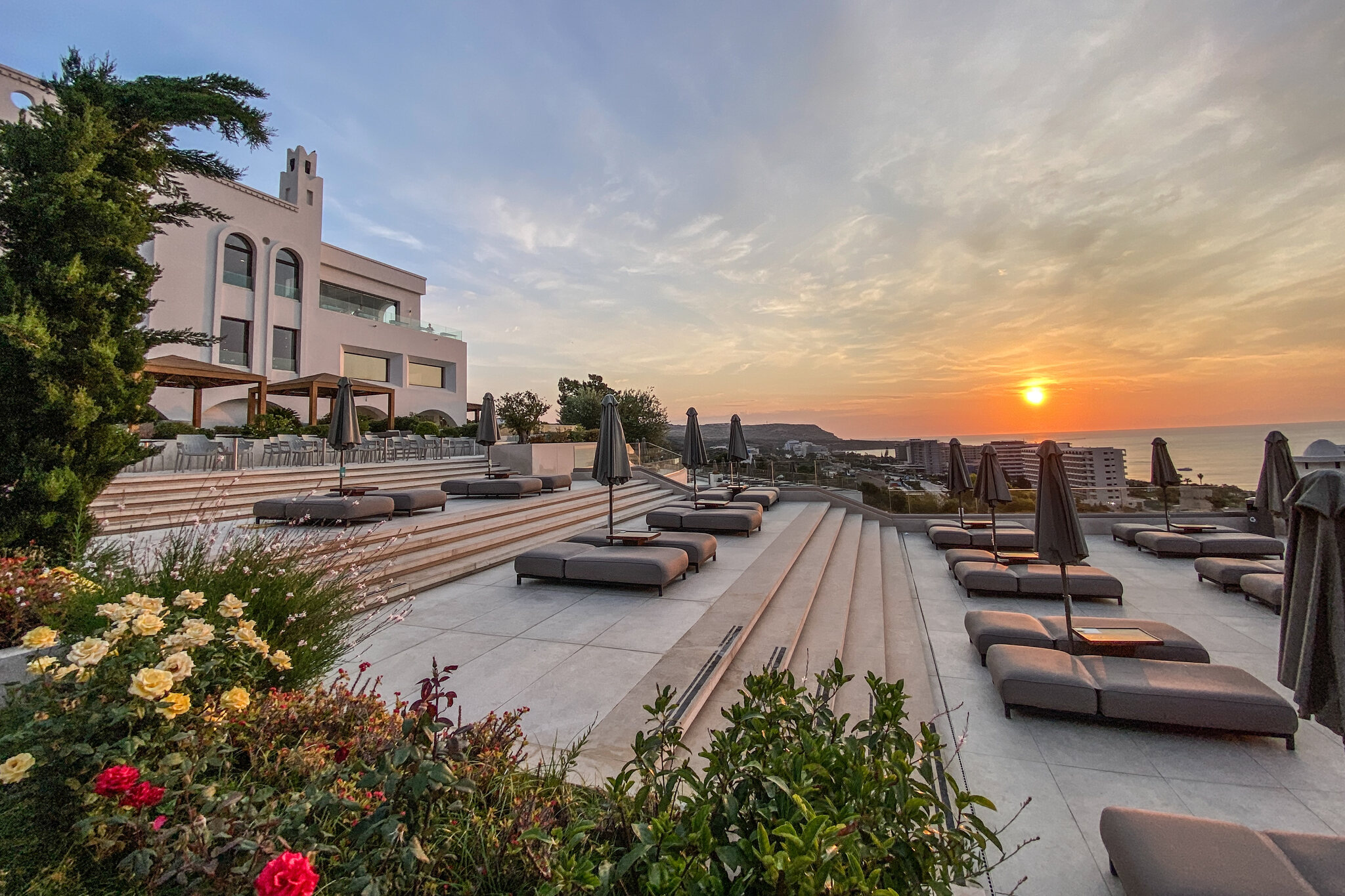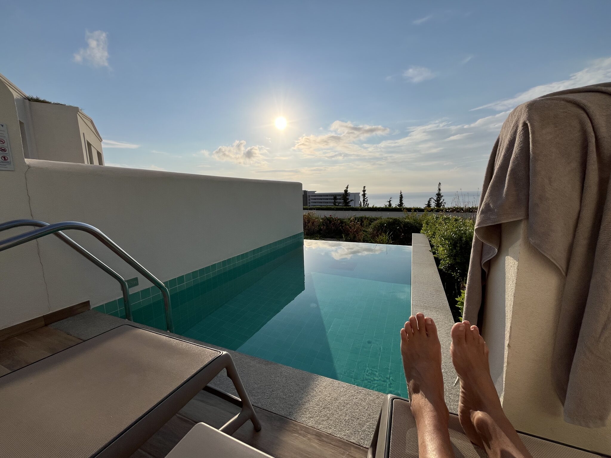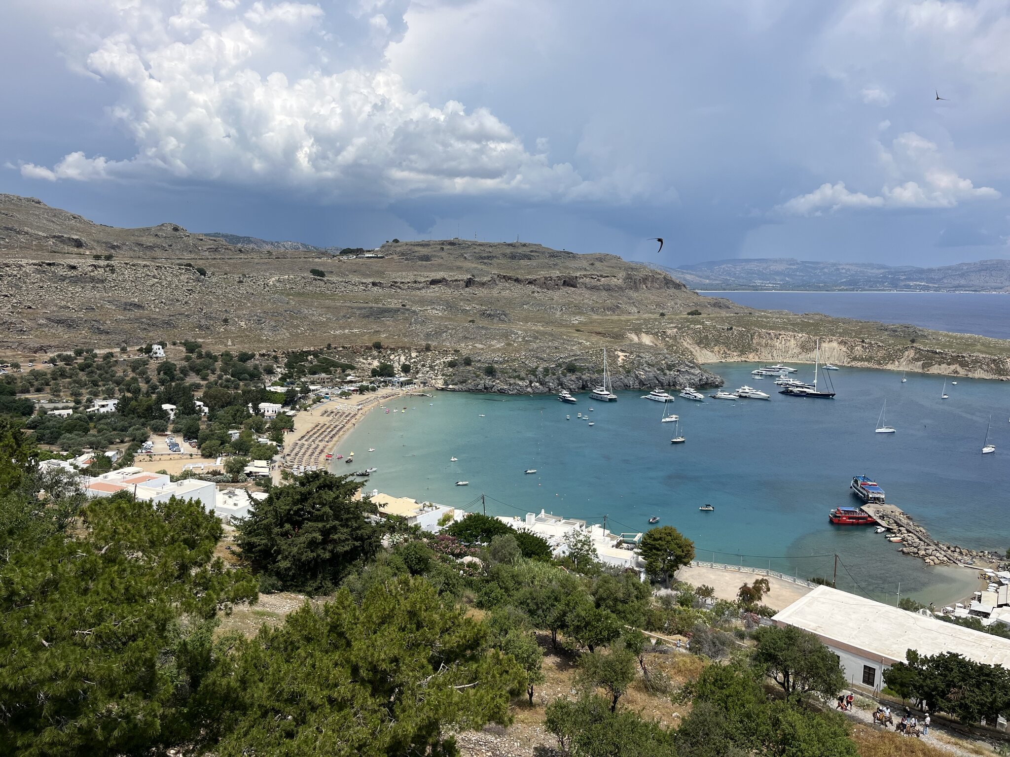In Rhodos regnet es ja selten, aber ausgerechnet auf Freitag/Samstag ist hier Schlechtwetter angesagt. Sowohl Windy, als auch Wetter-Online sagen kaum Sonne und ab Mittag Regen voraus. Hmmm. Das macht uns Sorgen. Doch sieht so Schlechtwetter aus, als ski-andy die Sonnenaufgangsfotos schiessen geht? Ich drehe mich nochmal um und lege mich dann um 7.30 Uhr an unseren Pool. Grad so warm genug. Beim Panorama-Frühstück ist es dann ziemlich warm, aber das nehmen wir in Kauf. Etwas von der Insel sehen, wollen wir auch. Also steht heute trotz der schlechten Wetterprognose die Akropolis von Lindos auf dem Vormittagsprogramm: Sehr schön und nicht annähernd so überlaufen wie die gleichnamige in Athen, die wir im Herbst besucht hatten. Und die Aussicht ist sehr schön. Im Hintergrund türmen sich die Cb‘s. Und die blumigen Gassen von Lindos sind es auch. Anschliessend fahren wir an den Tsambika-Beach. Laut Internet einer der schönsten Strände Rhodos‘. Und ein Teil davon ebenfalls textilfrei (nicht nur für die Füsse