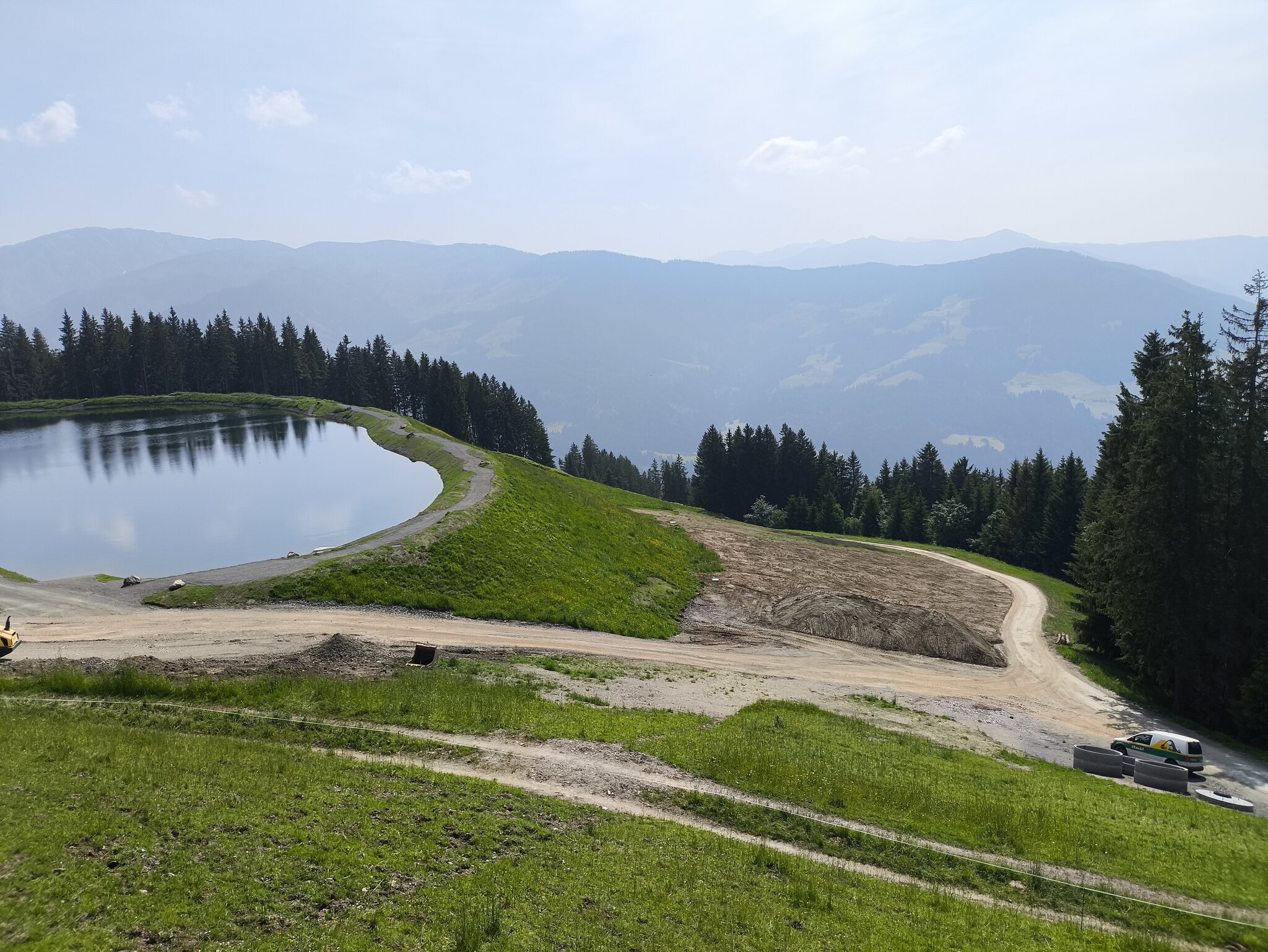130.000 m³, Lage 200m neben dem Speichterteich Hohe Salve + neue Piste an der Foischingbahn für Renntraining und Skischulen, geplanter Baustart Frühjahr 2025