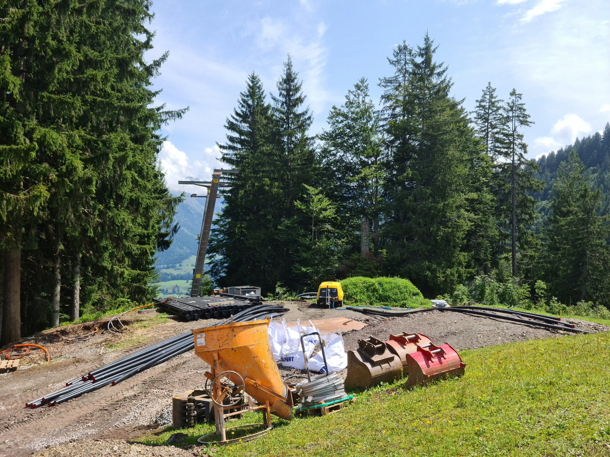 Und noch ein Bild von mir von oben vor 3 Tagen. Zu sehen sein dürften unter anderem Leitungen für die zukünftige Beschneiung. An den Stützen sind momentan keine Rollenbatterien.